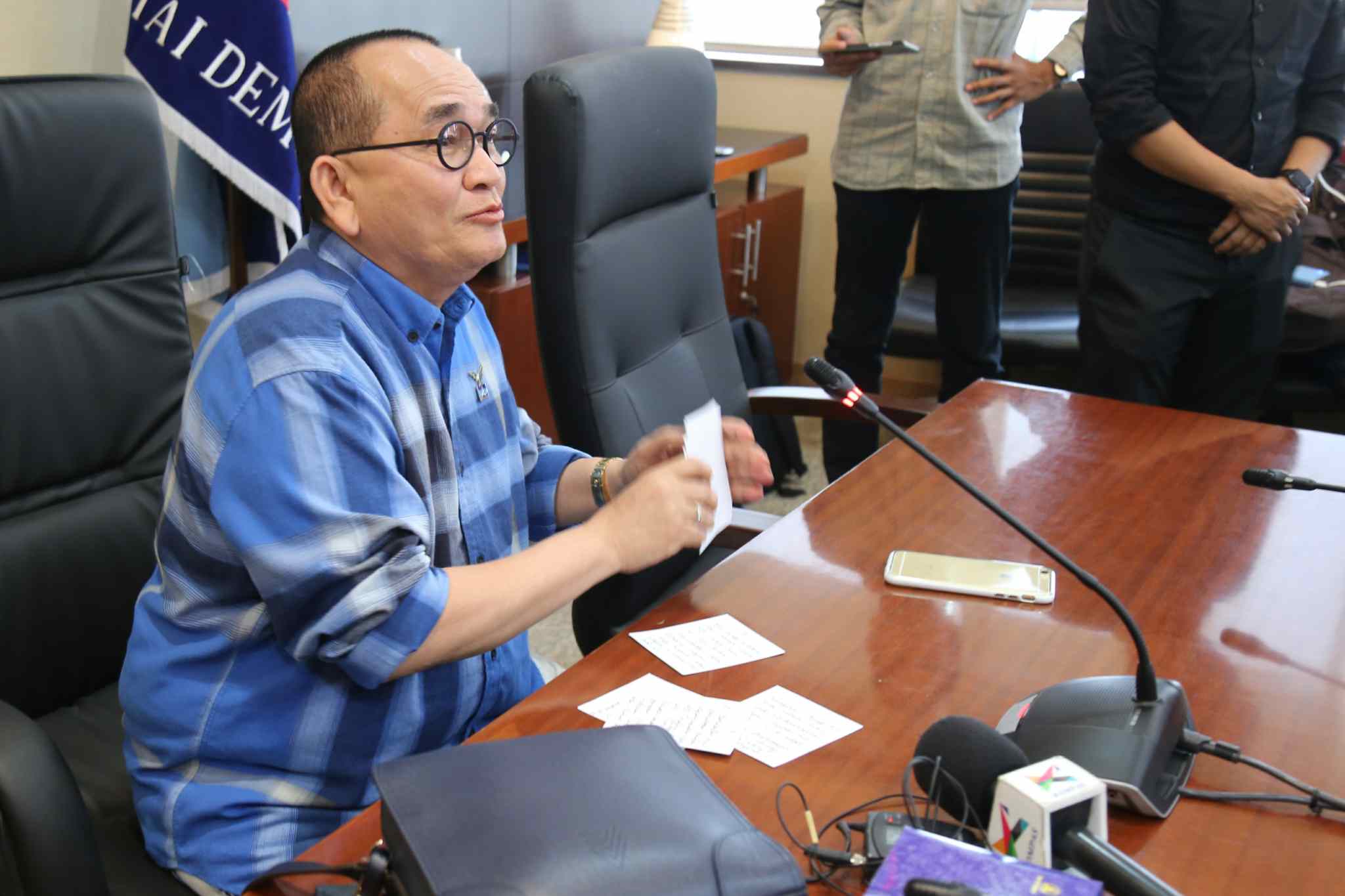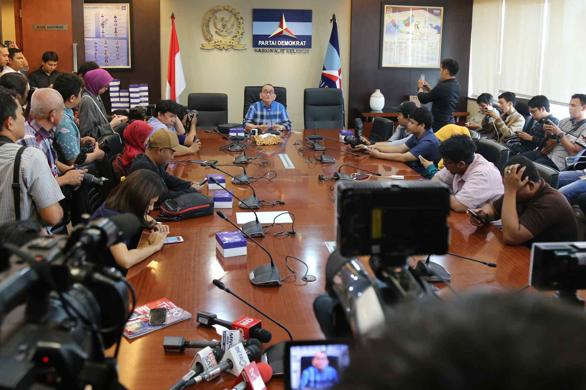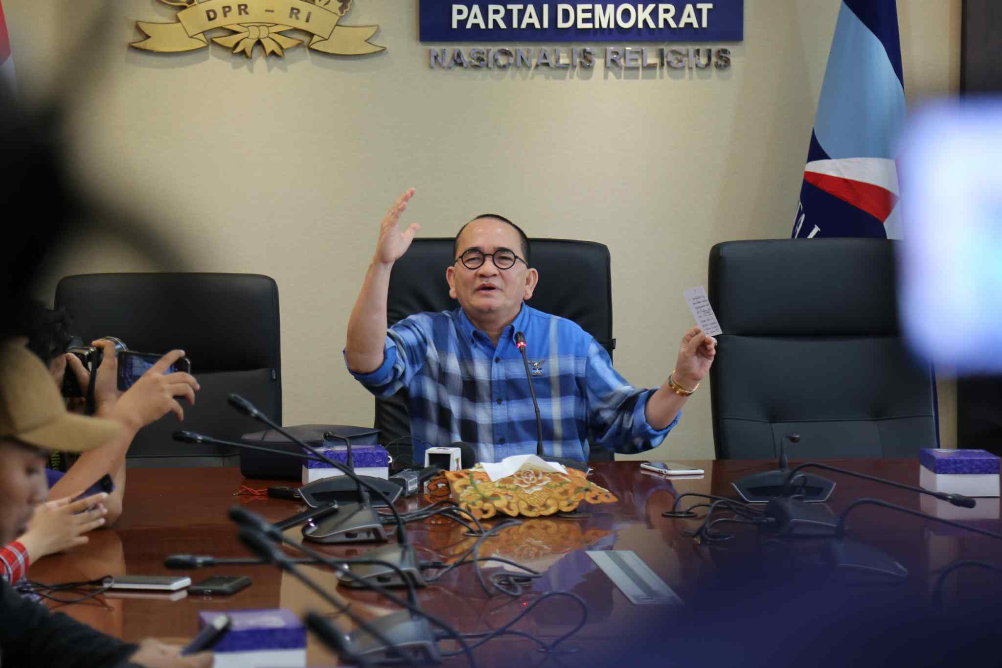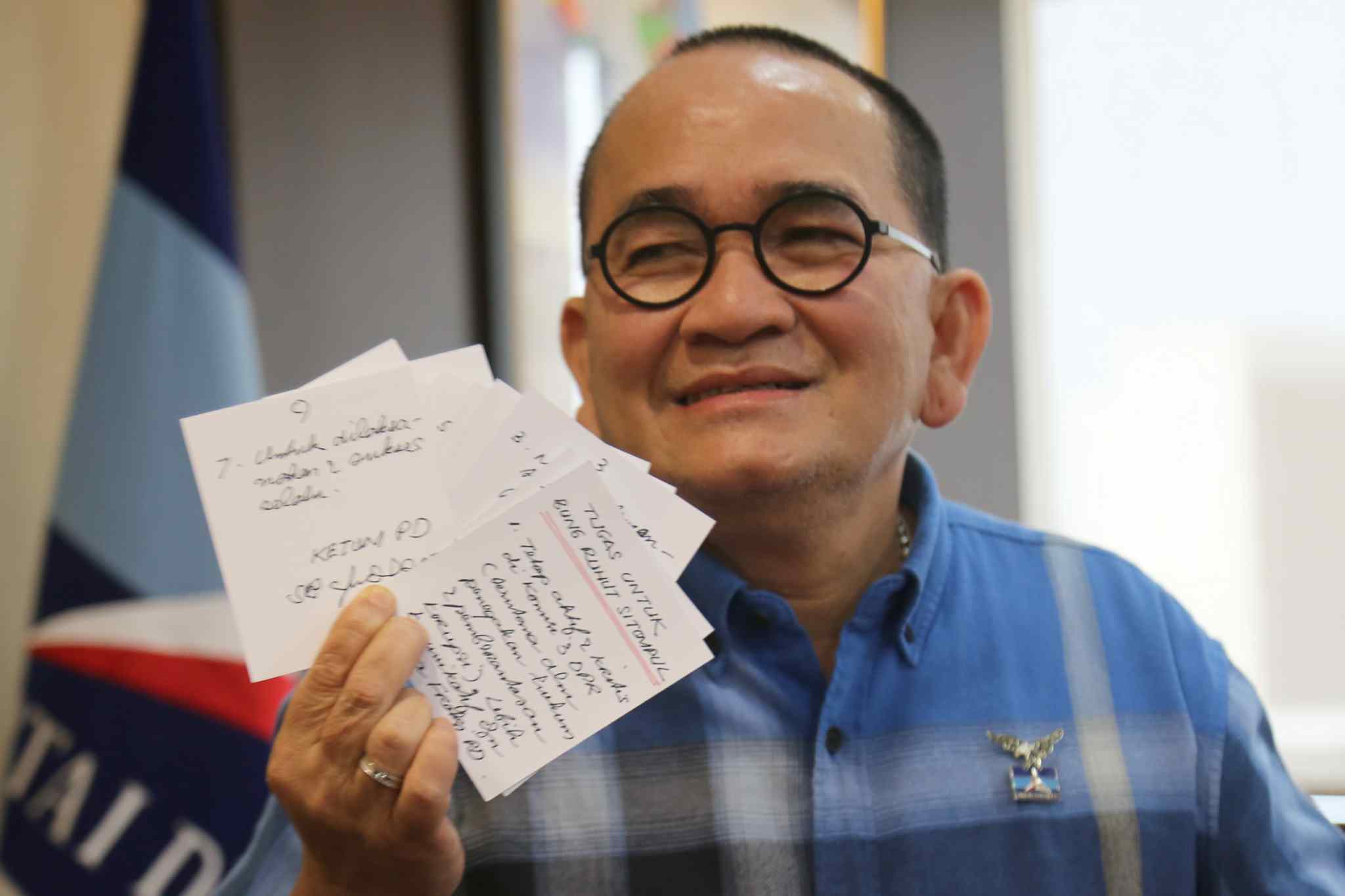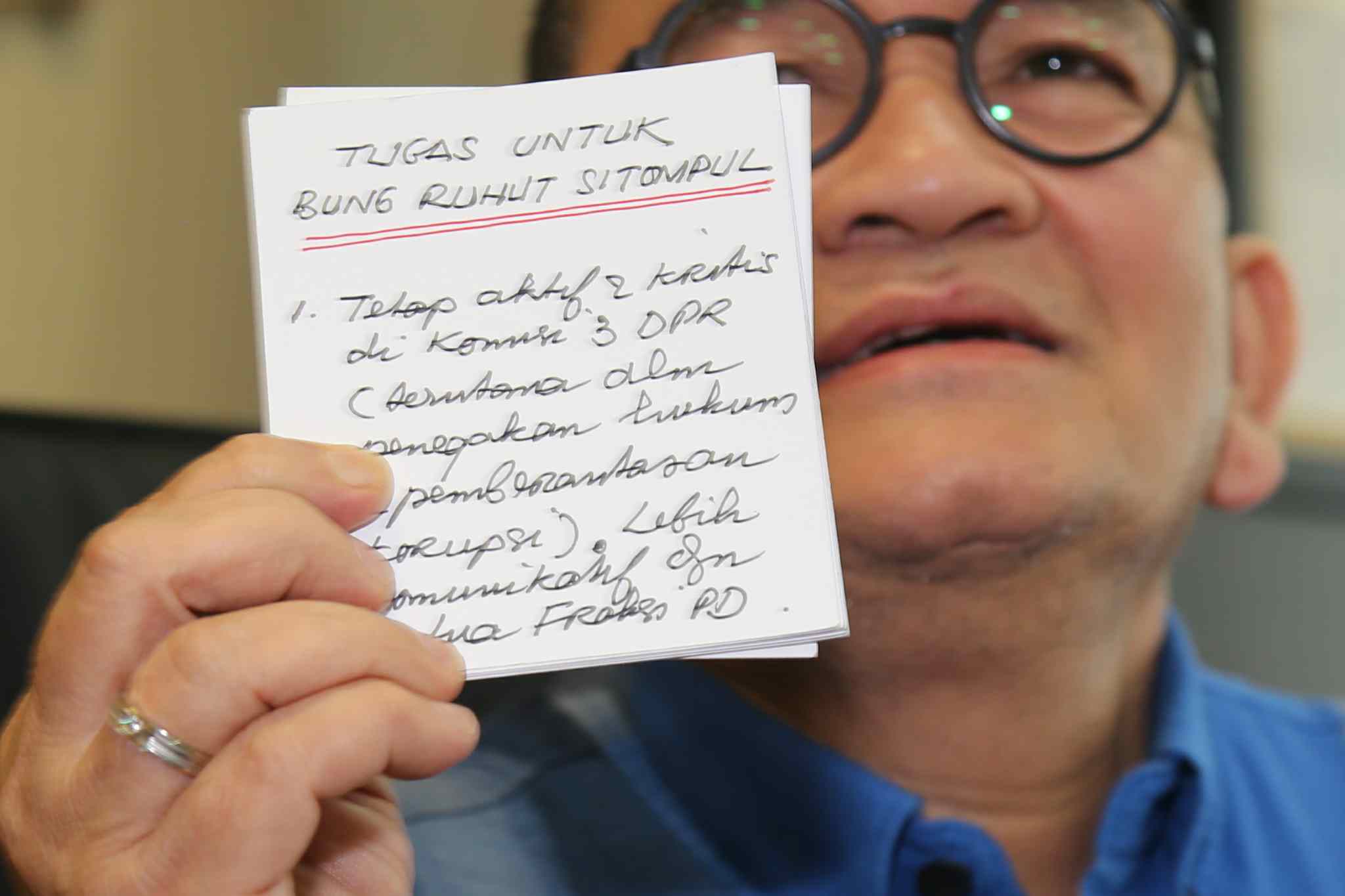 Juru Bicara Partai Demokrat, Ruhut Sitompul memperlihatkan catatan dari Ketua Umum Partai Demokrat Susilo Bambang Yudhoyono seputar pemberhentian jabatan juru bicara di ruang Fraksi Demokrat, gedung Parlemen, Senayan, Jakarta, Senin (22/8). Partai Demokrat mencopot Ruhut Sitompul dari jabatan Koordinator Juru Bicara Partai Demokrat. Pemecatan Ruhut tersebut karena dinilai tidak sesuai lagi dengan kebijakan partai, dan selalu bertentangan dengan arahan Ketua Umum DPP Partai Demokrat Susilo Bambang Yudhoyono. AKTUAL/TINO OKTAVIANO