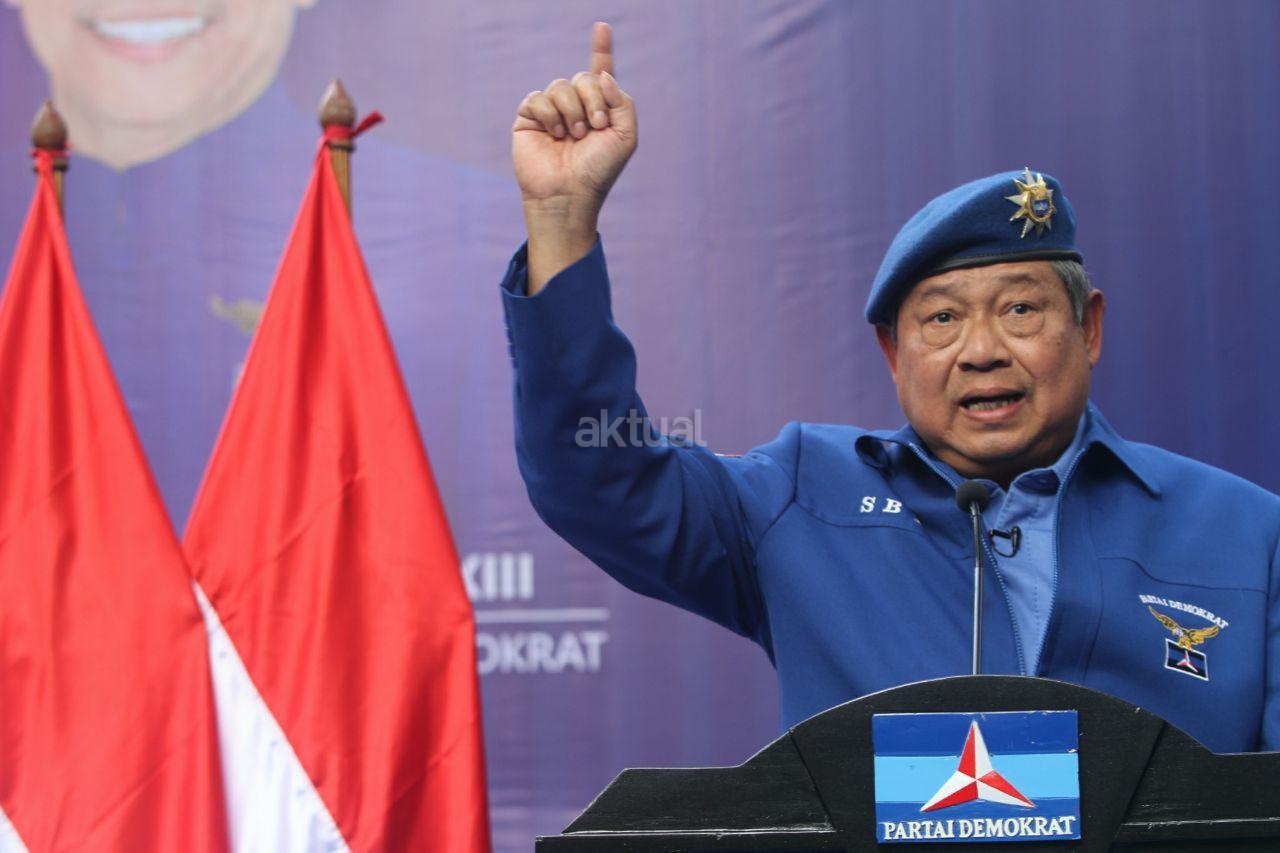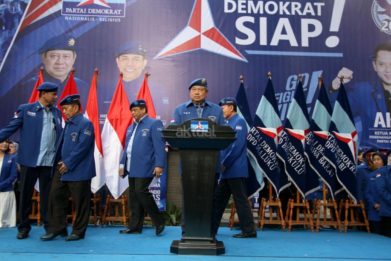 Ketua Umum Partai Demokrat Susilo Bambang Yudhoyono memberikan sambutan saat pengukuhan Kogasma di DPP Partai Demokrat, Jalan Proklamasi, Menteng, Jakarta Pusat, Sabtu (17/2/18). SBY mengukuhkan putranya, Agus Harimurti Yudhoyono, sebagai Kogasma untuk Pemilukada 2018 dan Pilpres 2019. AKTUAL/Tino Oktaviano