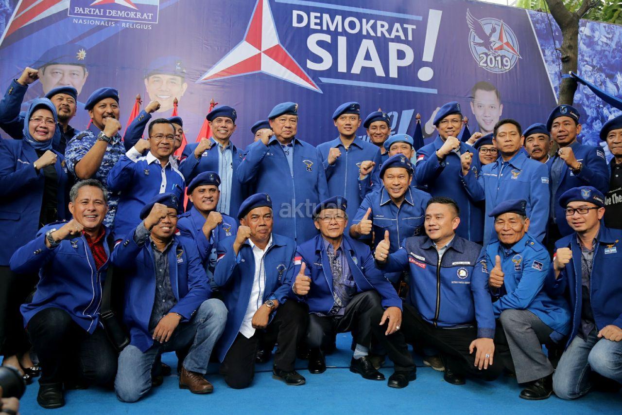 Ketua Umum Partai Demokrat Susilo Bambang Yudhoyono dan Komandan Satuan Tugas Bersama (Kogasma) pemenangan Pilkada 2018 dan Pilpres 2019 Partai Demokrat Agus Harimurti Yudhoyono bersama jajaran pengurus Partai Demokrat usai pengukuhan Kogasma di DPP Partai Demokrat, Jalan Proklamasi, Menteng, Jakarta Pusat, Sabtu (17/2/18). SBY mengukuhkan putranya, Agus Harimurti Yudhoyono, sebagai Kogasma untuk Pemilukada 2018 dan Pilpres 2019. AKTUAL/Tino Oktaviano