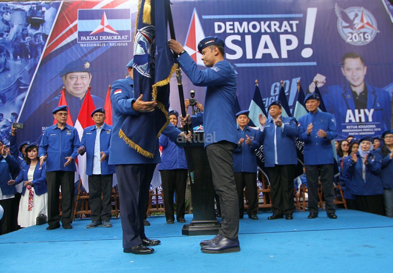Ketua Umum Partai Demokrat Susilo Bambang Yudhoyono memberikan bendera kepada Komandan Satuan Tugas Bersama (Kogasma) pemenangan Pilkada 2018 dan Pilpres 2019 Partai Demokrat Agus Harimurti Yudhoyono saat pengukuhan Kogasma di DPP Partai Demokrat, Jalan Proklamasi, Menteng, Jakarta Pusat, Sabtu (17/2/18). SBY mengukuhkan putranya, Agus Harimurti Yudhoyono, sebagai Kogasma untuk Pemilukada 2018 dan Pilpres 2019. AKTUAL/Tino Oktaviano