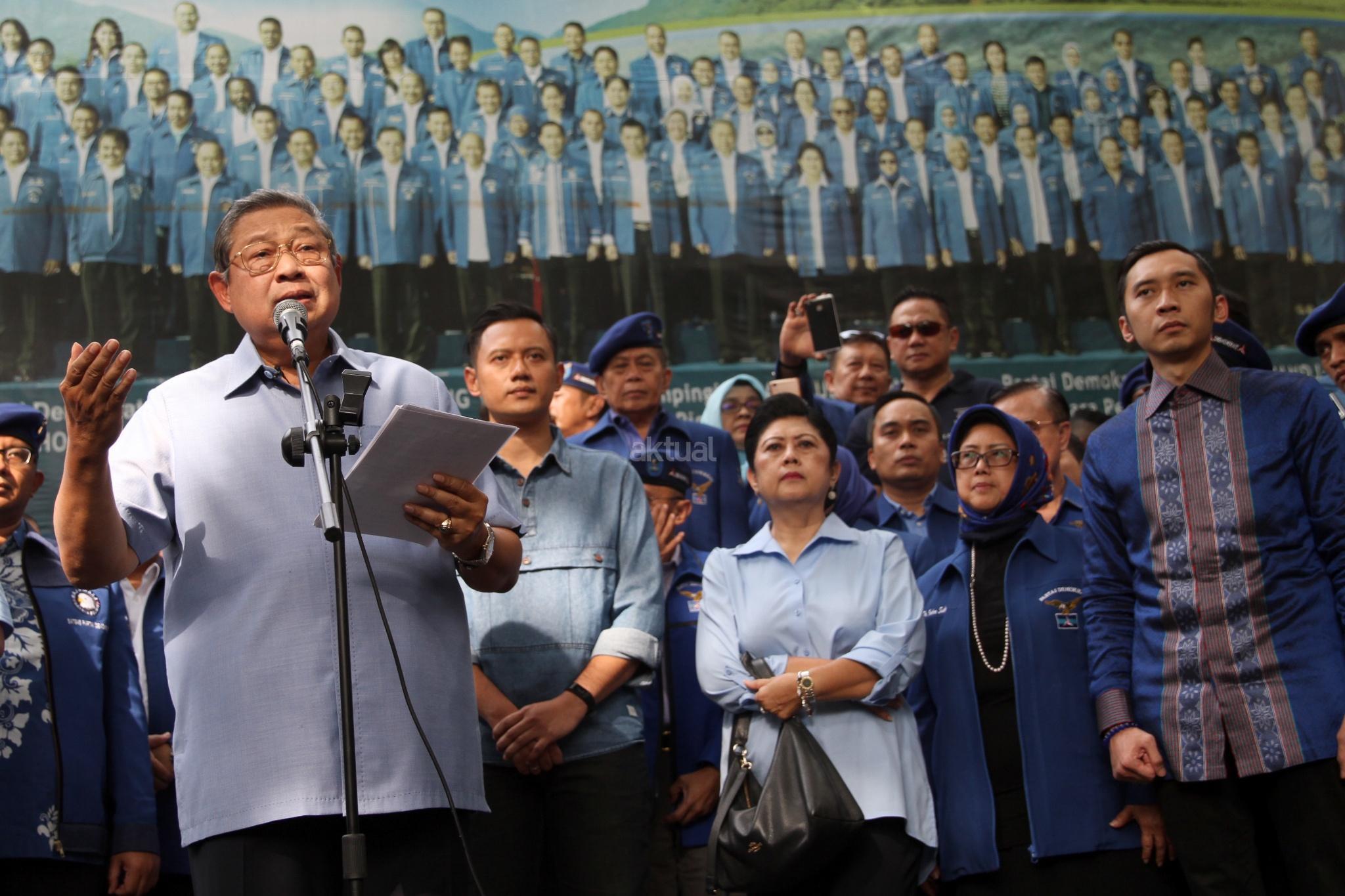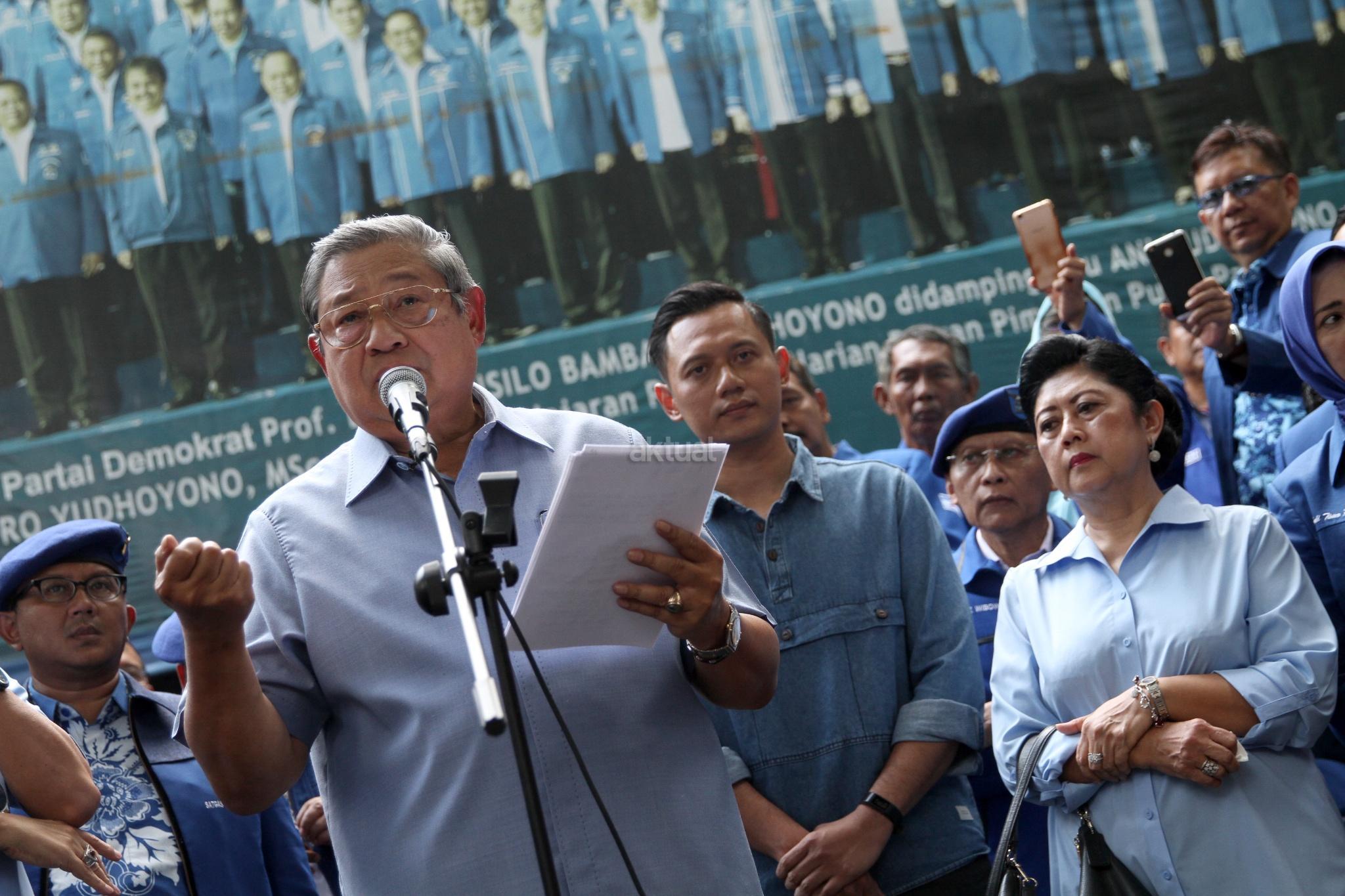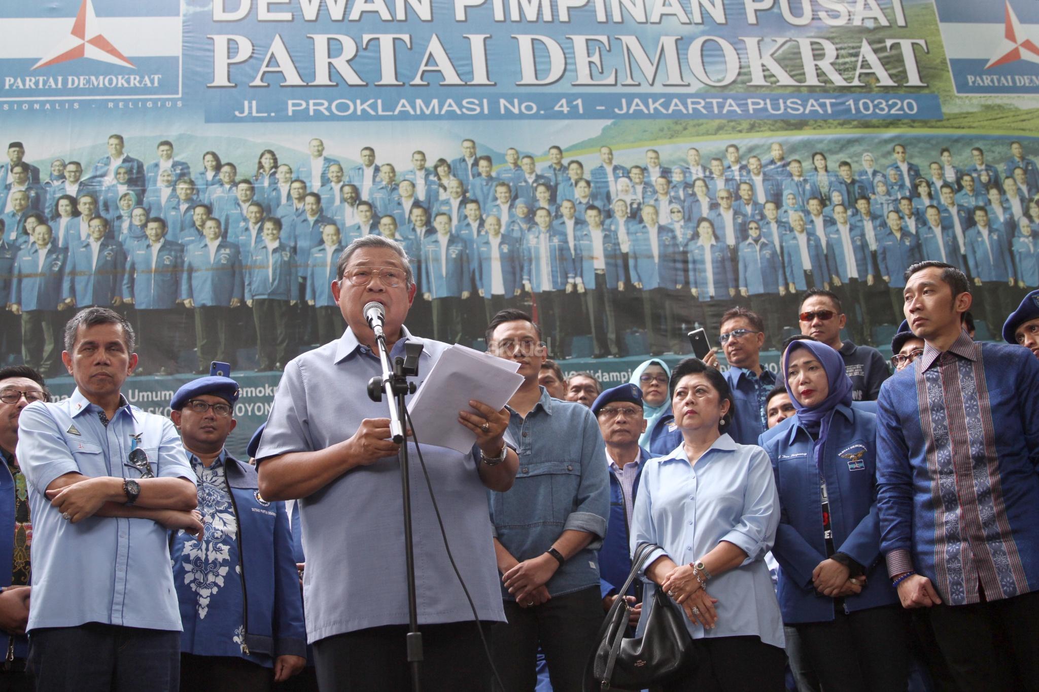 Ketua Umum Partai Demokrat yang juga Presiden ke-6 RI Susilo Bambang Yudhoyono didampingi pengurus Partai Demokrat memberikan keterangan pers soal melaporkan pengacara Setya Novanto, Firman Wijaya, ke Bareskrim Polri, di DPP Partai Demokrat, Jakarta, Selasa (6/2). Pelaporan tersebut terkait ucapan Firman seusai sidang Setya Novanto pada Kamis (25/1) lalu atas dugaan pencemaran nama baik. AKTUAL/Tino Oktaviano