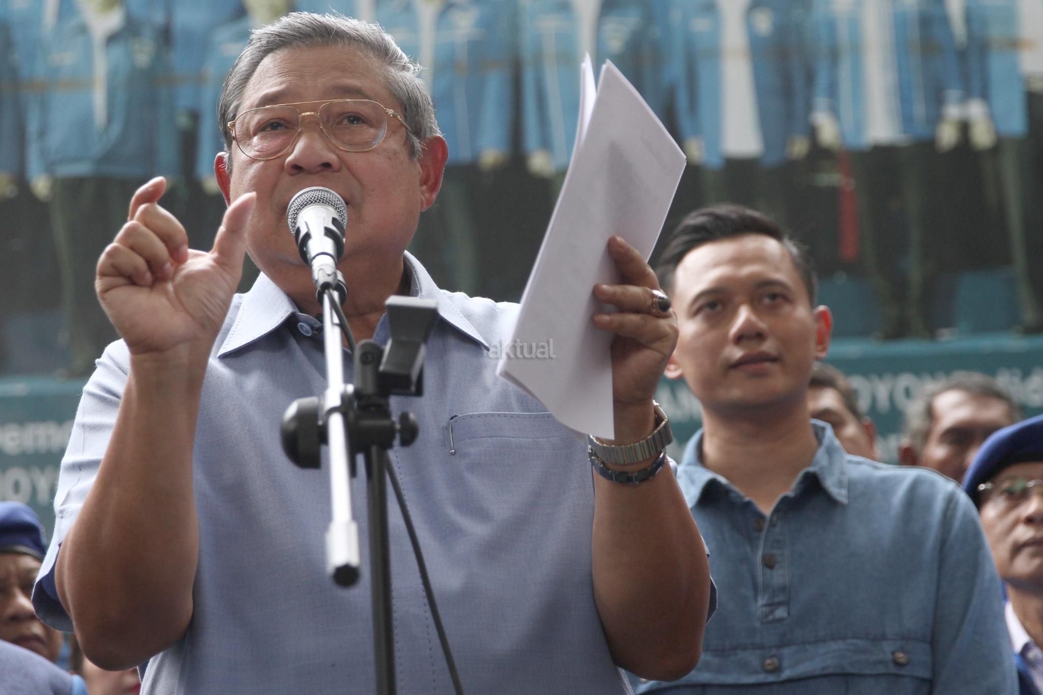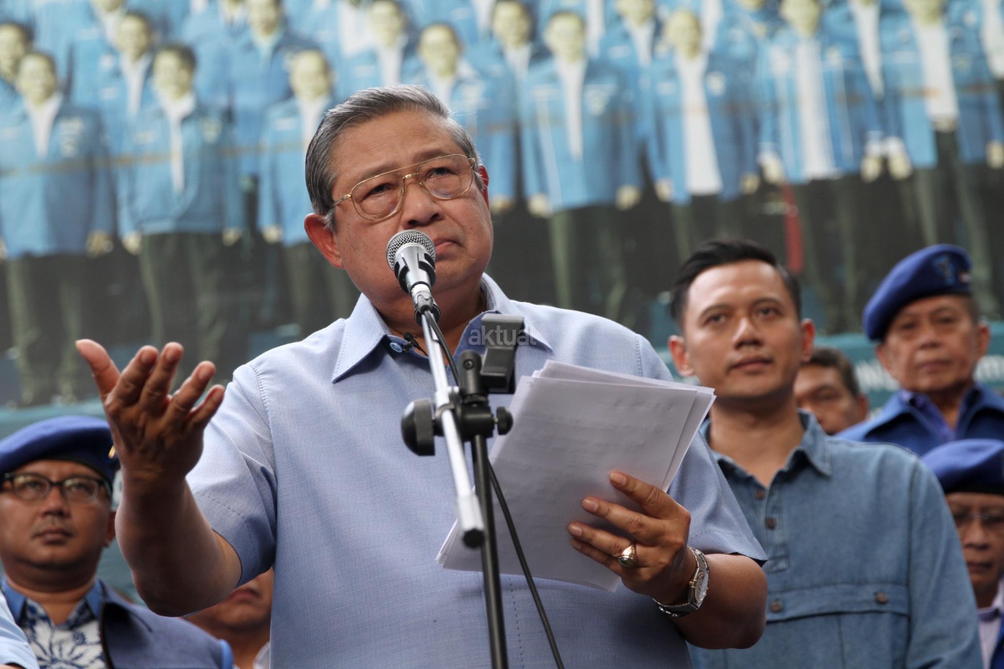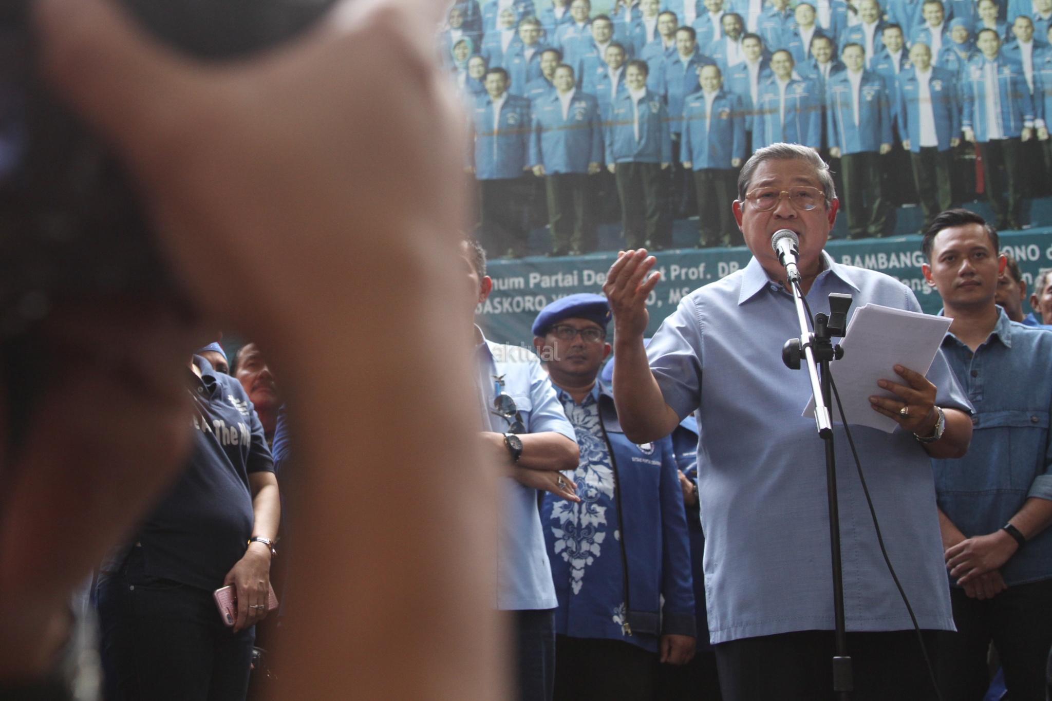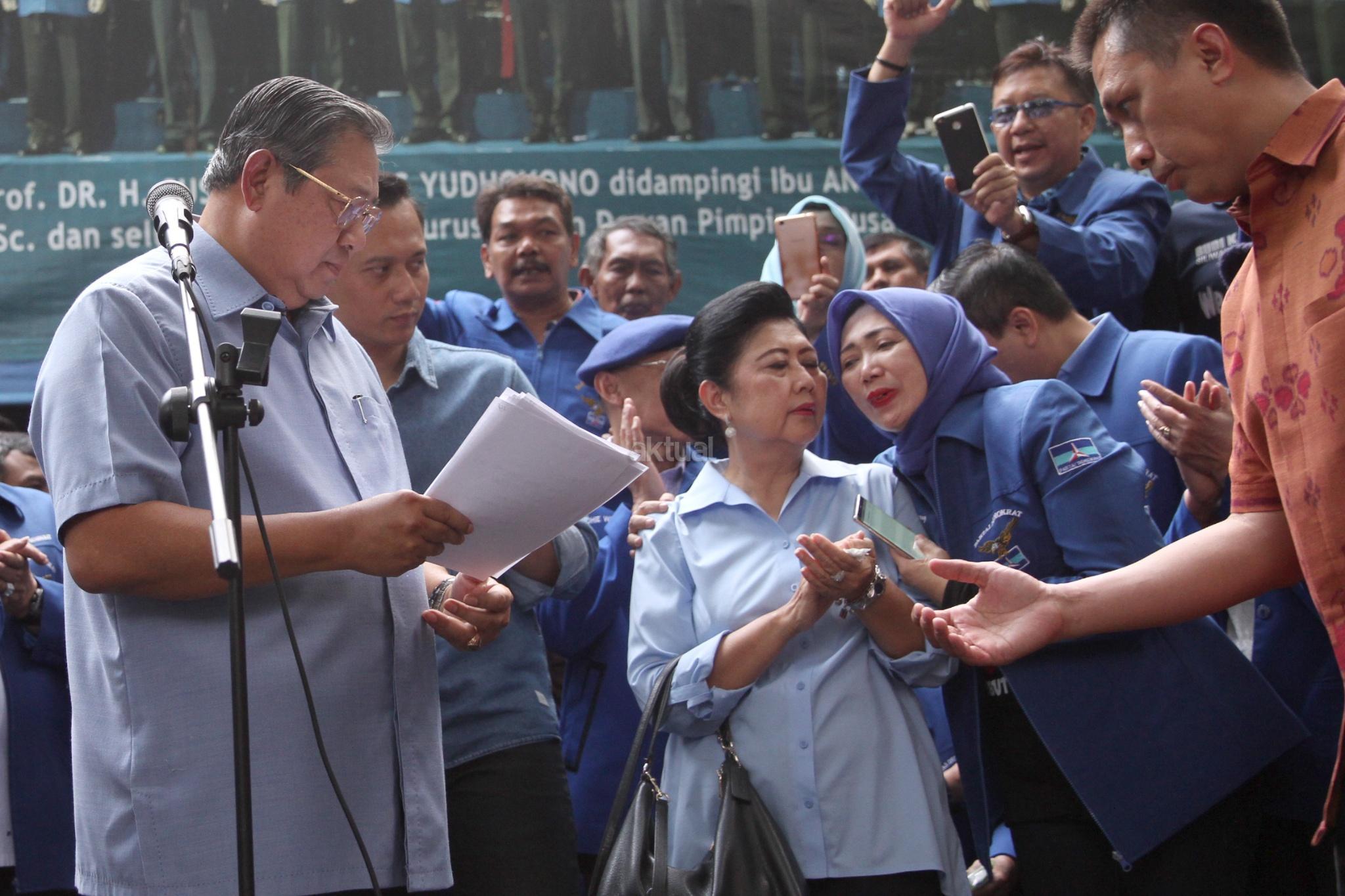 Ketua Umum Partai Demokrat yang juga Presiden ke-6 RI Susilo Bambang Yudhoyono didampingi pengurus Partai Demokrat memberikan keterangan pers soal melaporkan pengacara Setya Novanto, Firman Wijaya, ke Bareskrim Polri, di DPP Partai Demokrat, Jakarta, Selasa (6/2). Pelaporan tersebut terkait ucapan Firman seusai sidang Setya Novanto pada Kamis (25/1) lalu atas dugaan pencemaran nama baik. AKTUAL/Tino Oktaviano