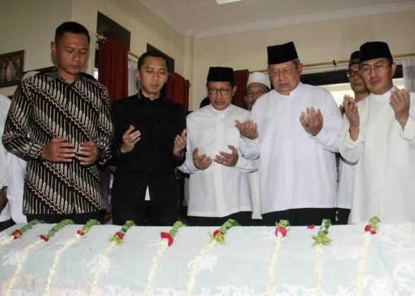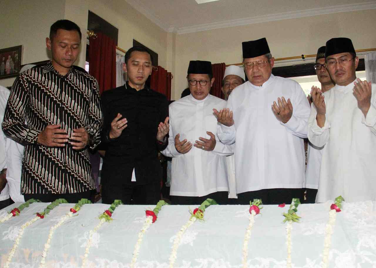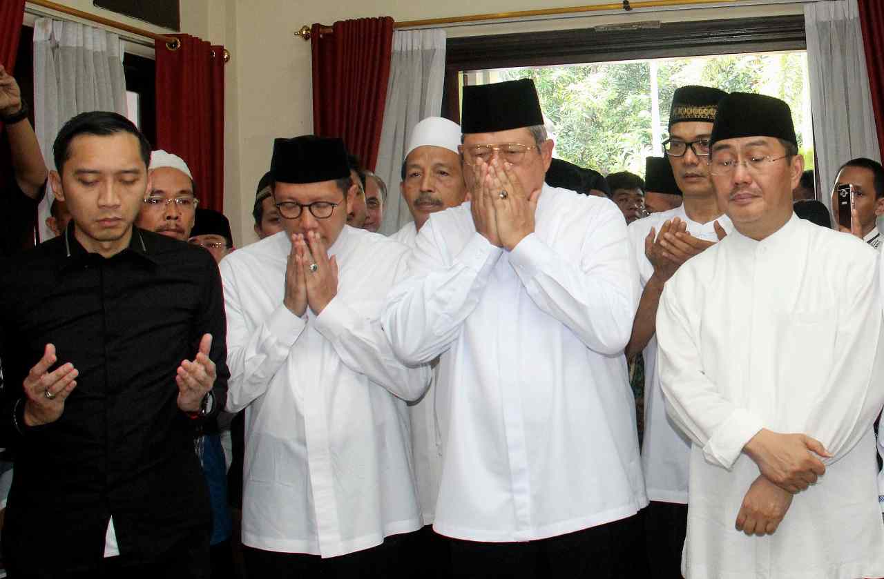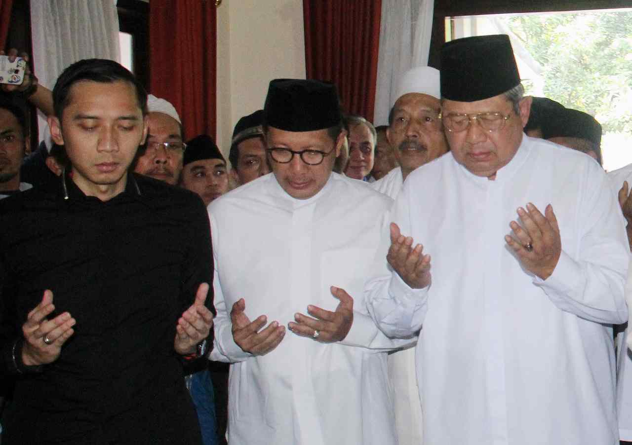 Presiden Keenam RI Susilo Bambang Yudhoyono (tengah) di dampingi dua anaknya, Edi Baskoro Yudhoyono (Ibas) dan bersama Menteri Agama Lukman Hakim Saifuddin (keempat kiri), Ketua DKPP Jimly Asshiddiqie (keempat kanan) dan para pelayat berdoa saat melayat Ketua KPU Husni Kamil Manik di Jakarta, Jumat (8/7/2016). Husni Kamil Manik meninggal pada usia 40 tahun karena sakit.
