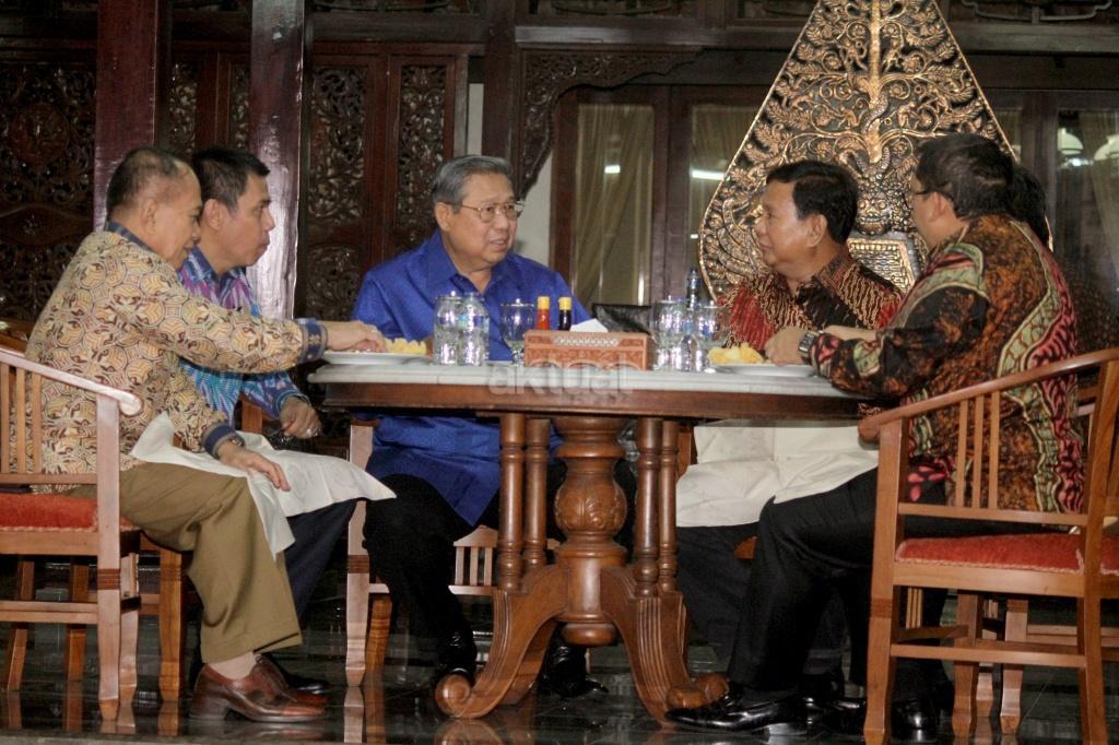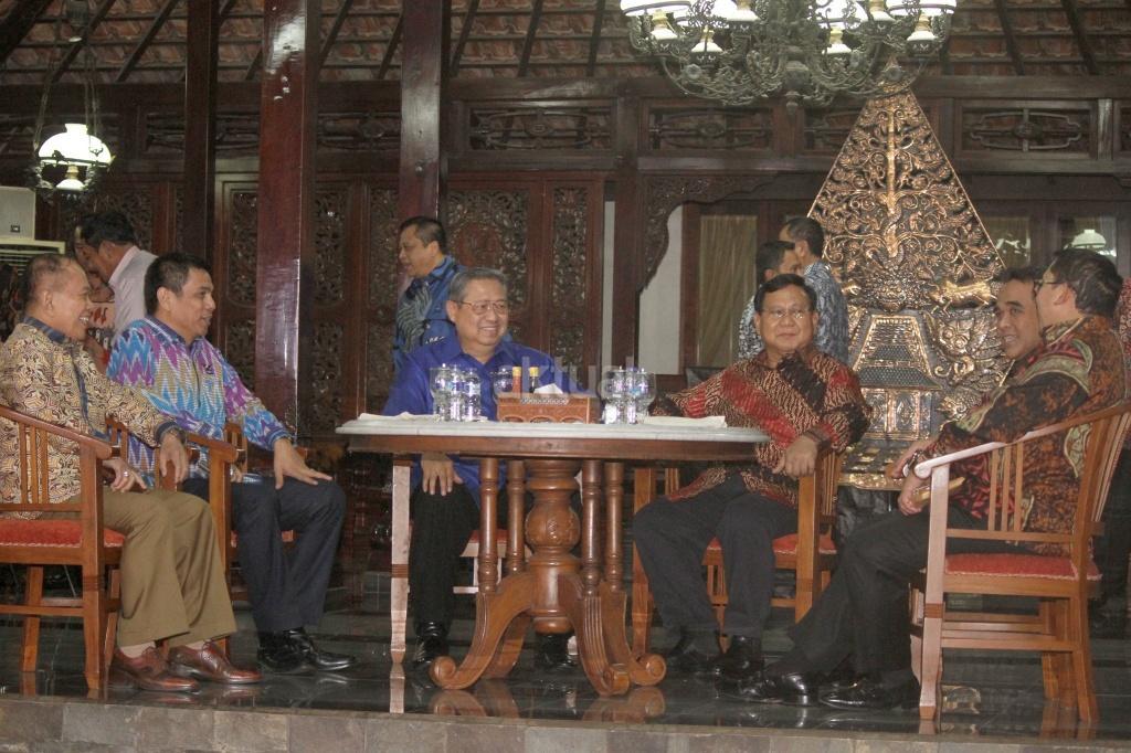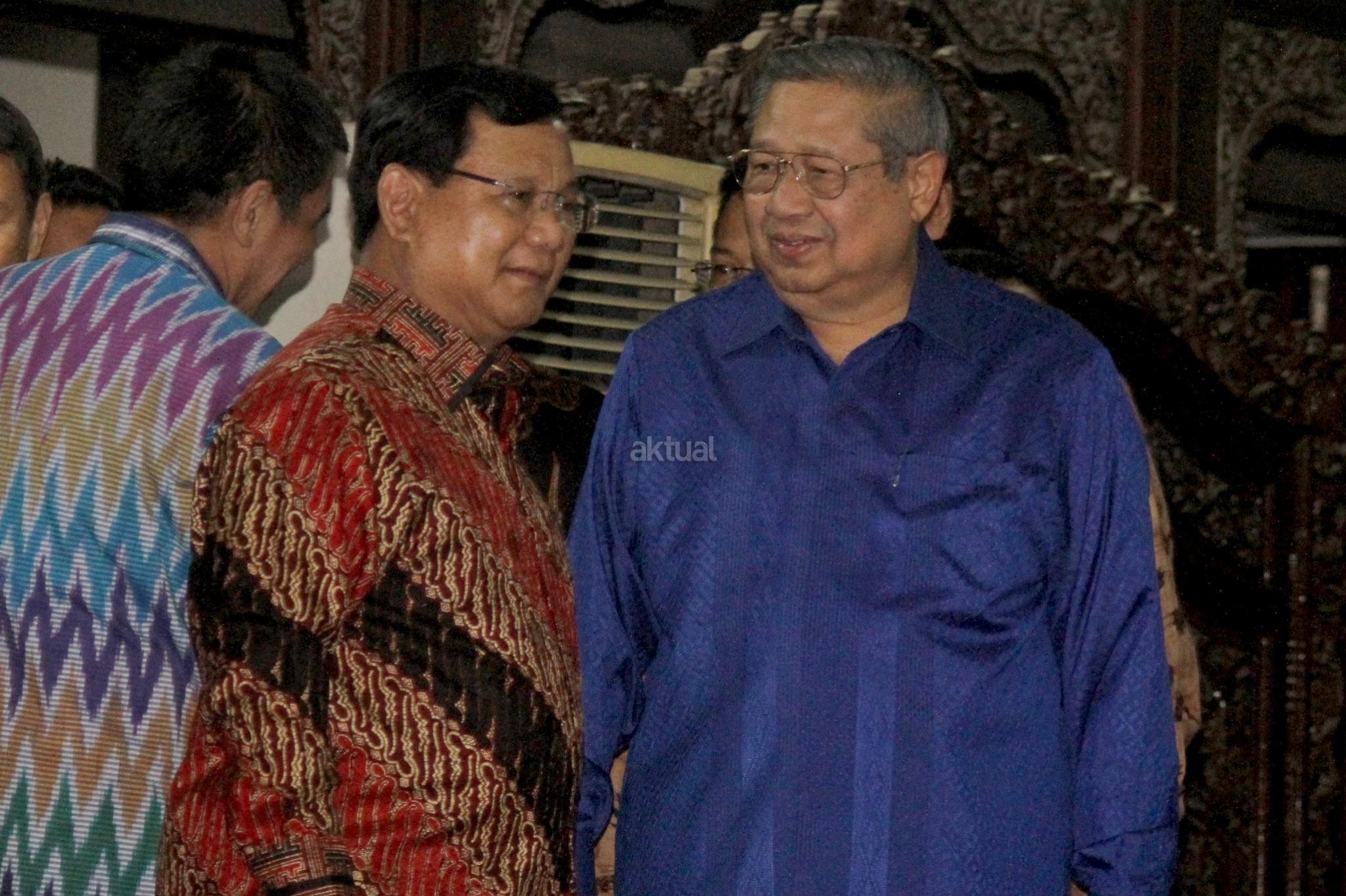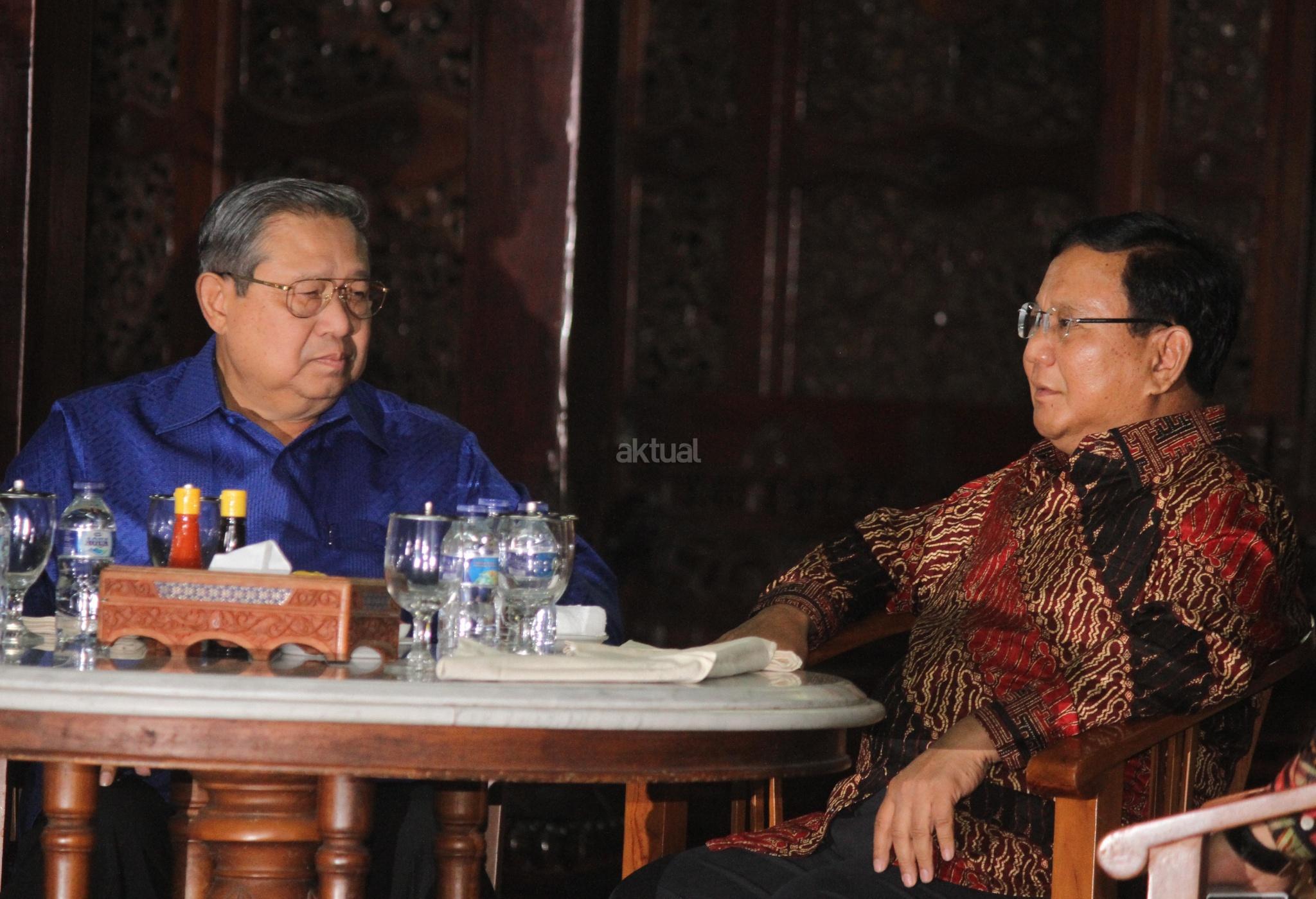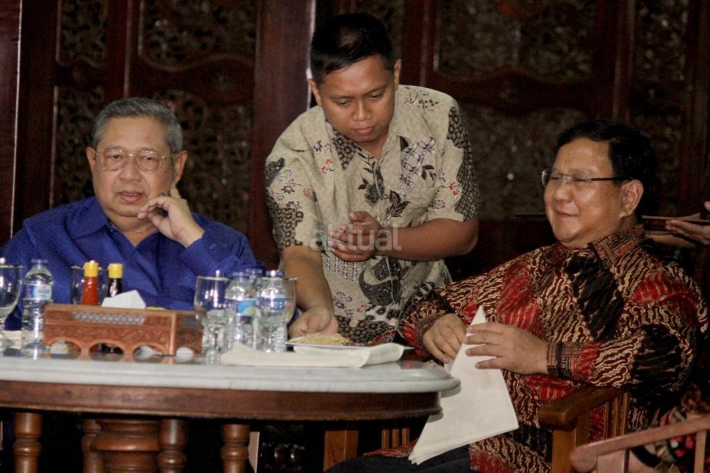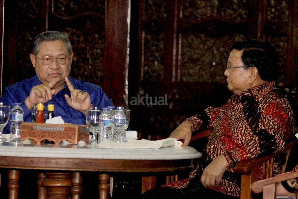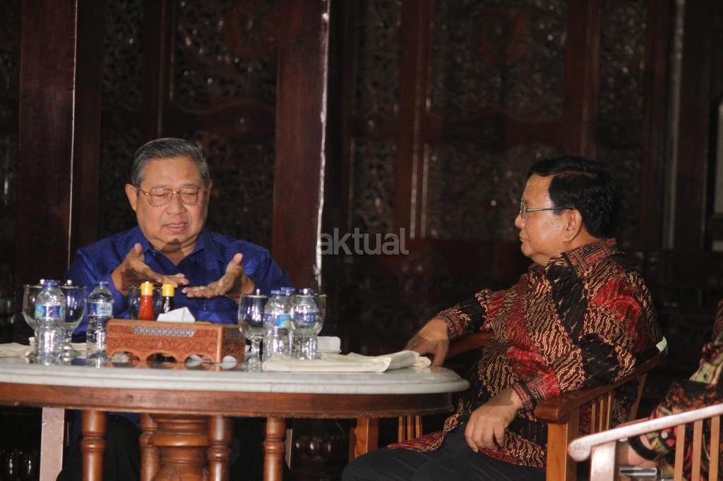 Ketua Umum Partai Demokrat Susilo Bambang Yudhoyono (kiri) berbincang dengan Ketua Umum Partai Gerindra Prabowo Subianto (kanan) sebelum mengadakan pertemuan tertutup di Puri Cikeas, Bogor, Jawa Barat, Kamis (27/7). Pertemuan keduanya membahas kondisi politik bangsa. AKTUAL/Tino Oktaviano