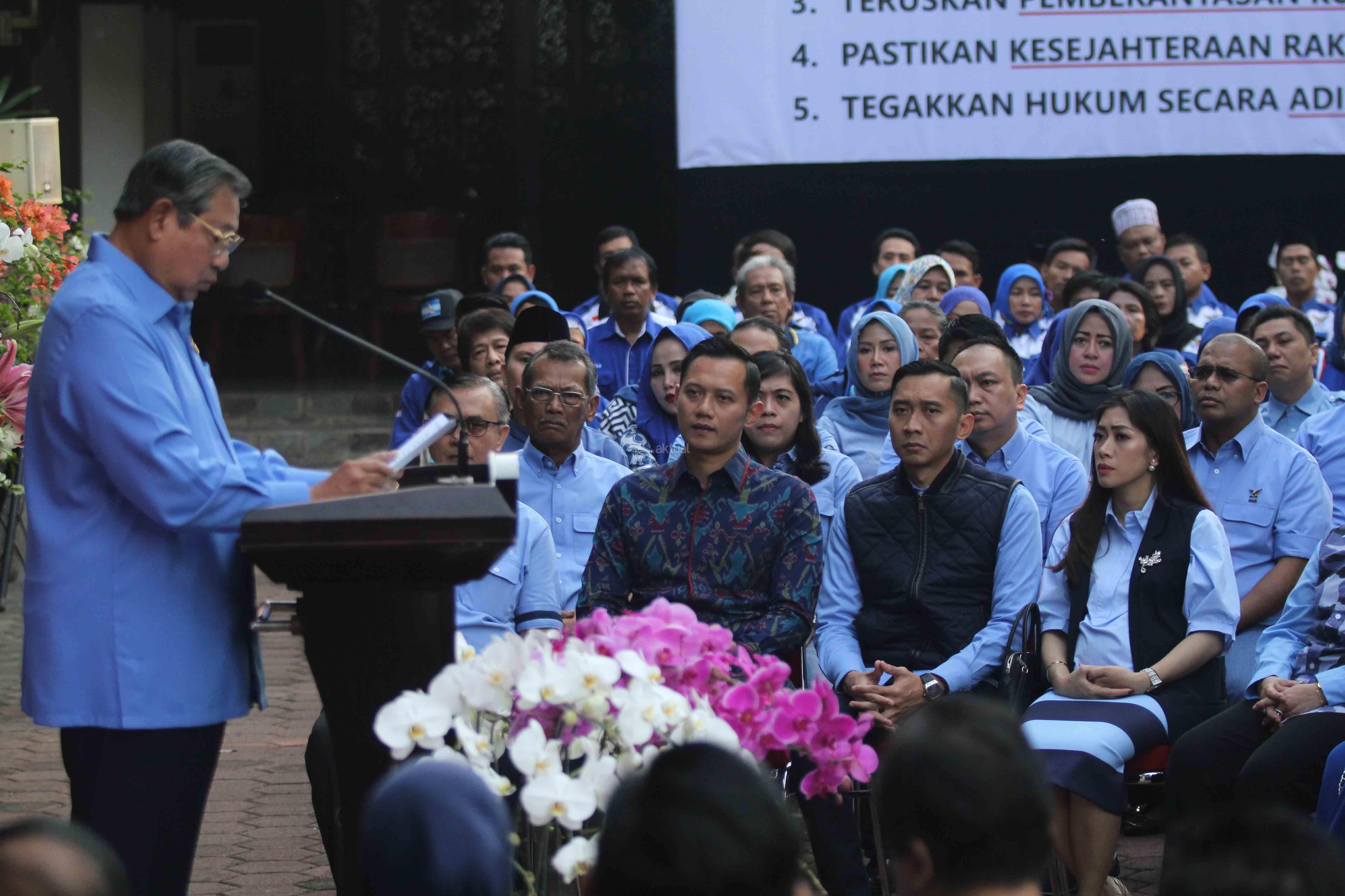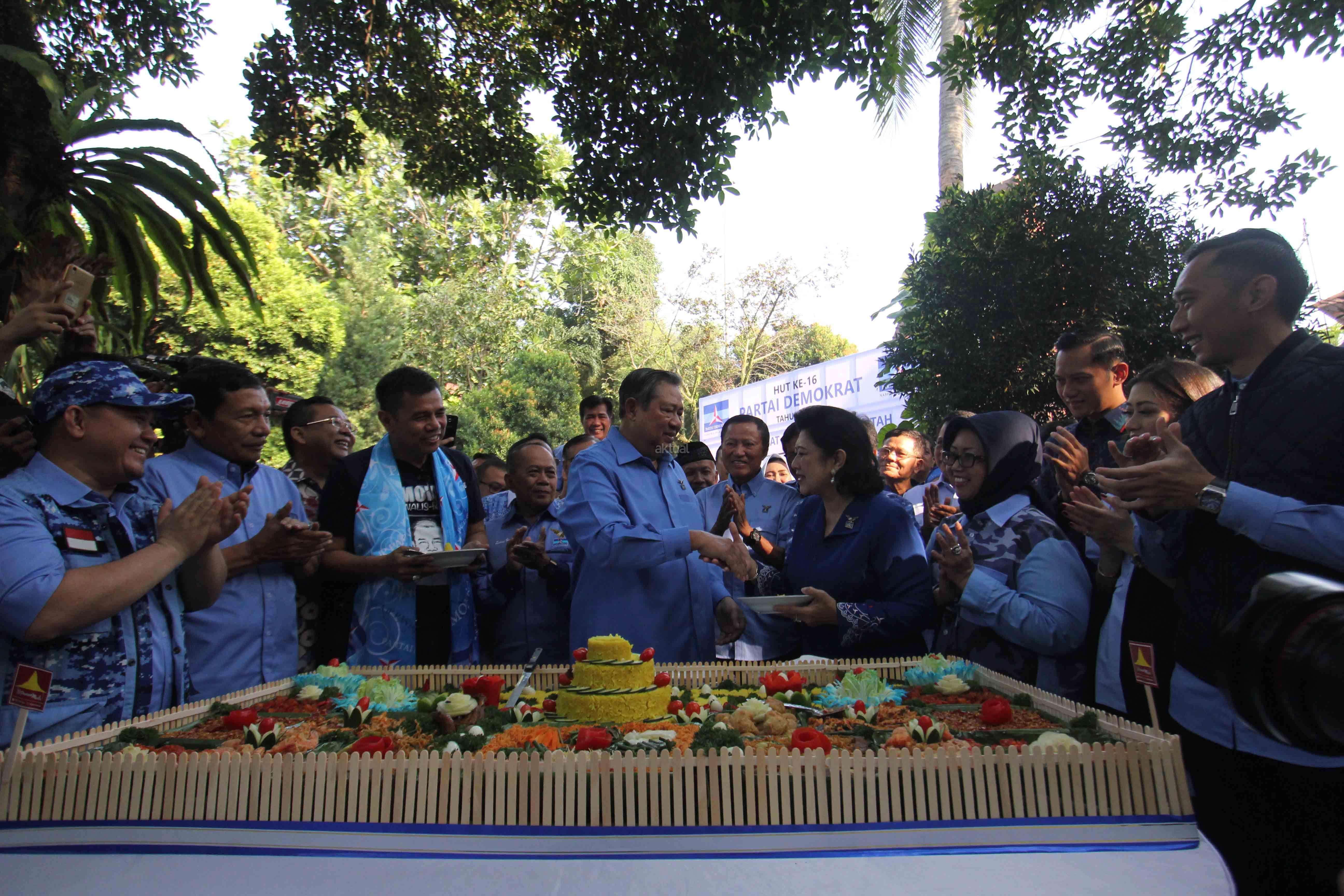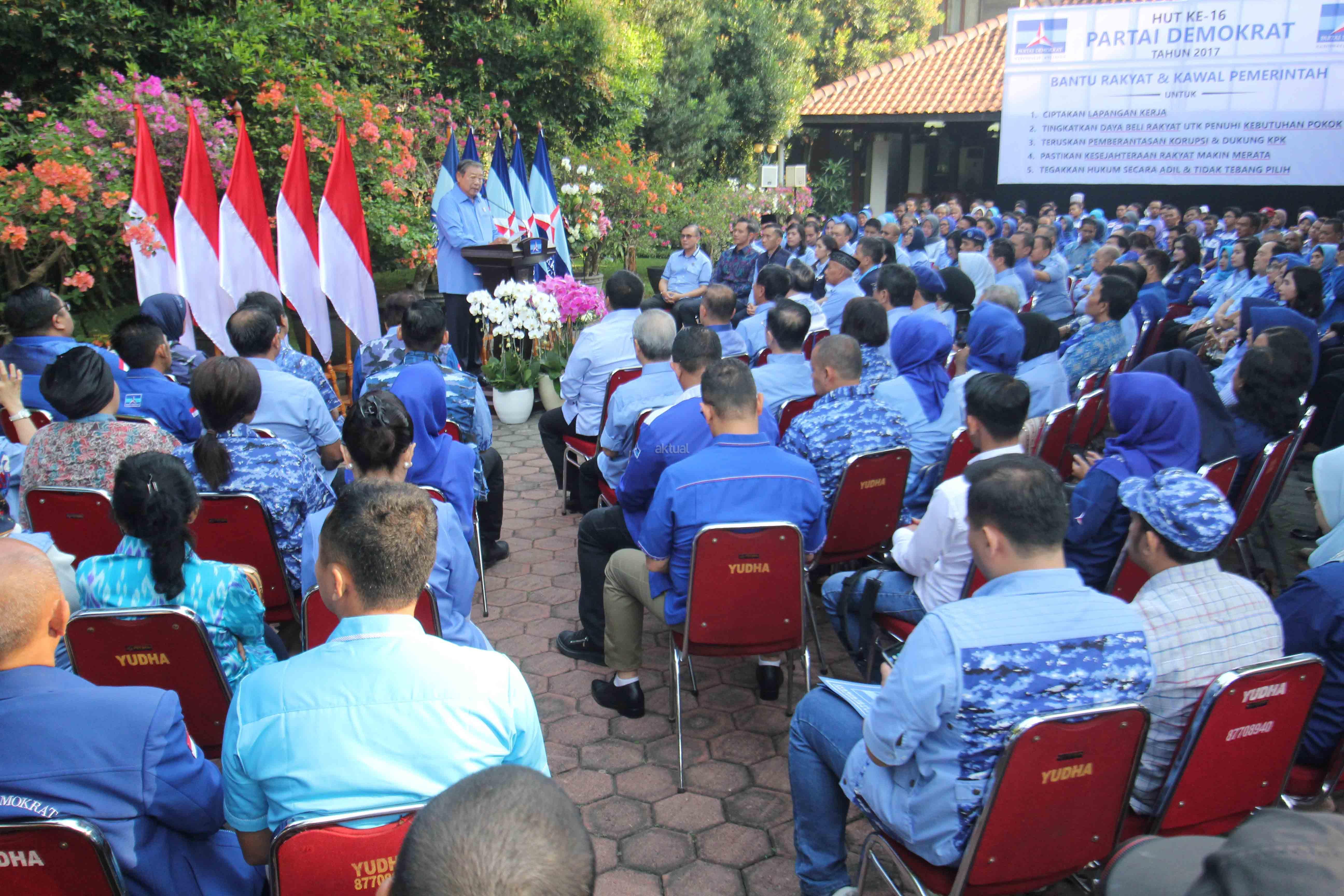 Peringatan HUT ke-16 Partai Demokrat di Puri Cikeas. Dalam kesempatan ini SBY selaku Ketum Partai Demokrat mengajak semua komponen bangsa untuk menciptakan lapangan kerja, mendukung KPK, dan meminta penegakan hukum secara adil tidak tebang pilih.. AKTUAL/Tino Oktaviano