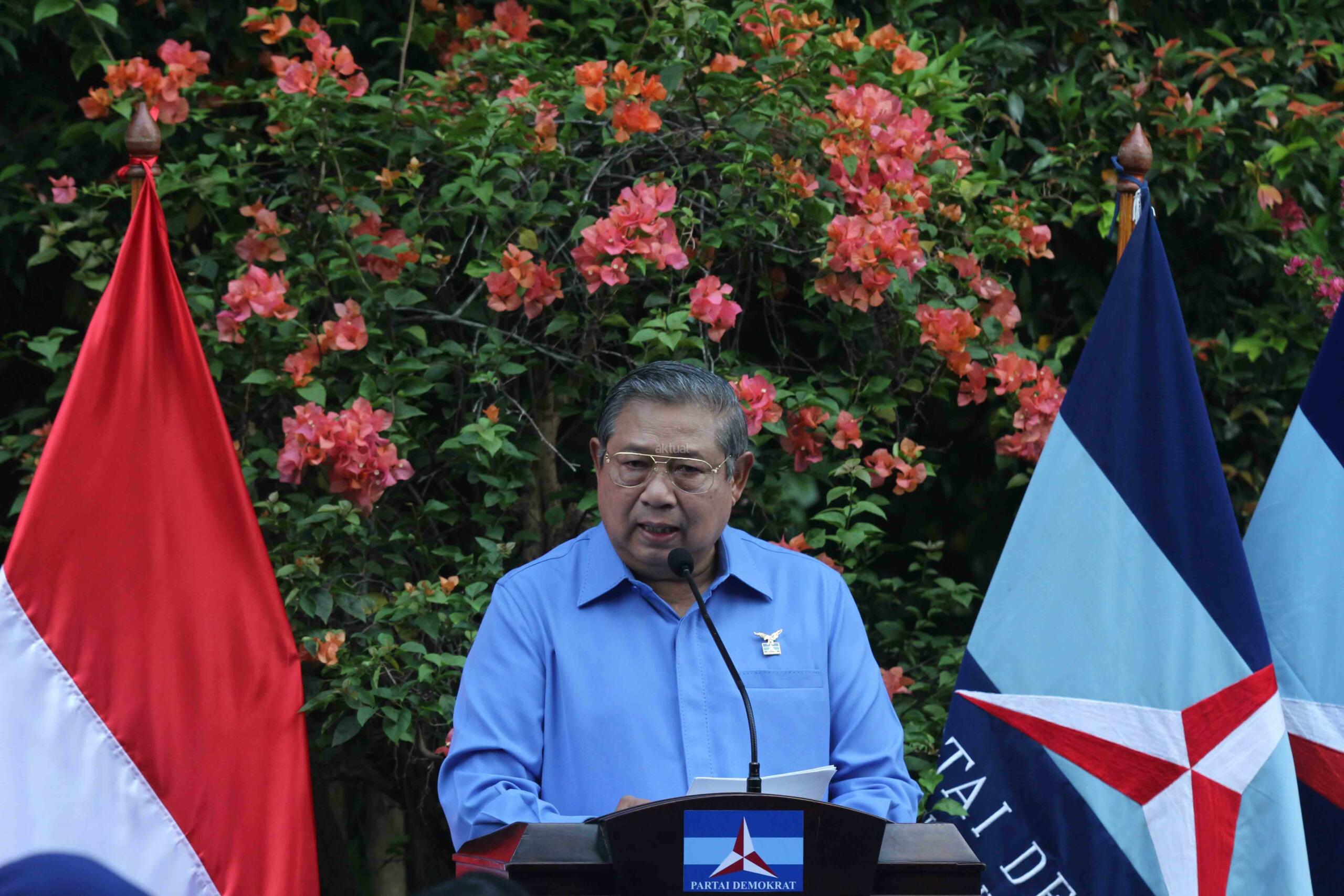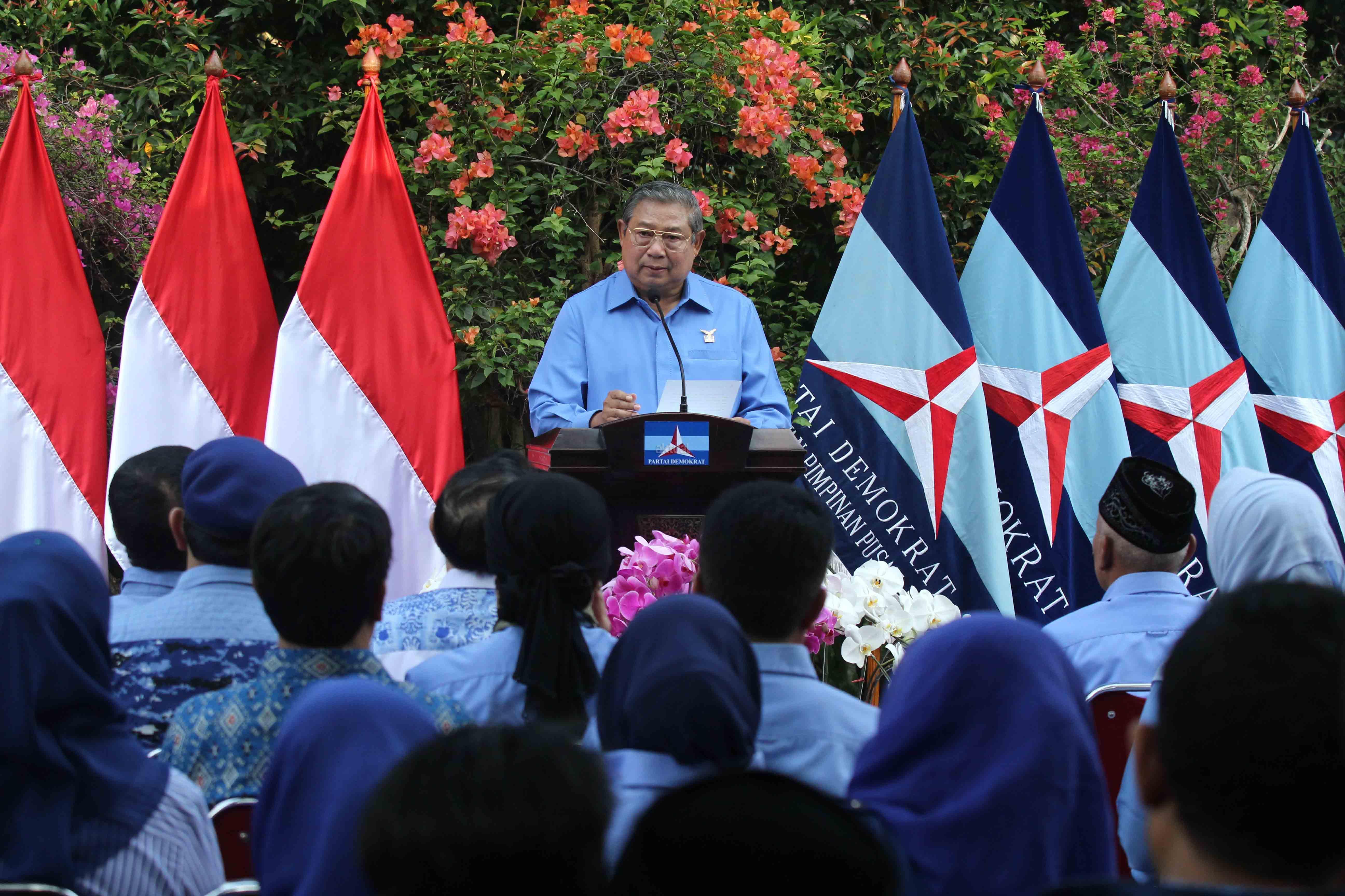 Ketua Umum Partai Demokrat Susilo Bambang Yudhoyono menyampaikan pidato politik saat syukuran HUT Partai Demokrat ke-16 di Cikeas, Bogor, Jawa Barat, Sabtu (9/9). Dalam pidatonya SBY memberikan arahan kepada seluruh kader Partai Demokrat agar memberi kontribusi nyata bagi bangsa dan negara serta membantu pemerintahan Jokowi-JK. AKTUAL/Tino Oktaviano
