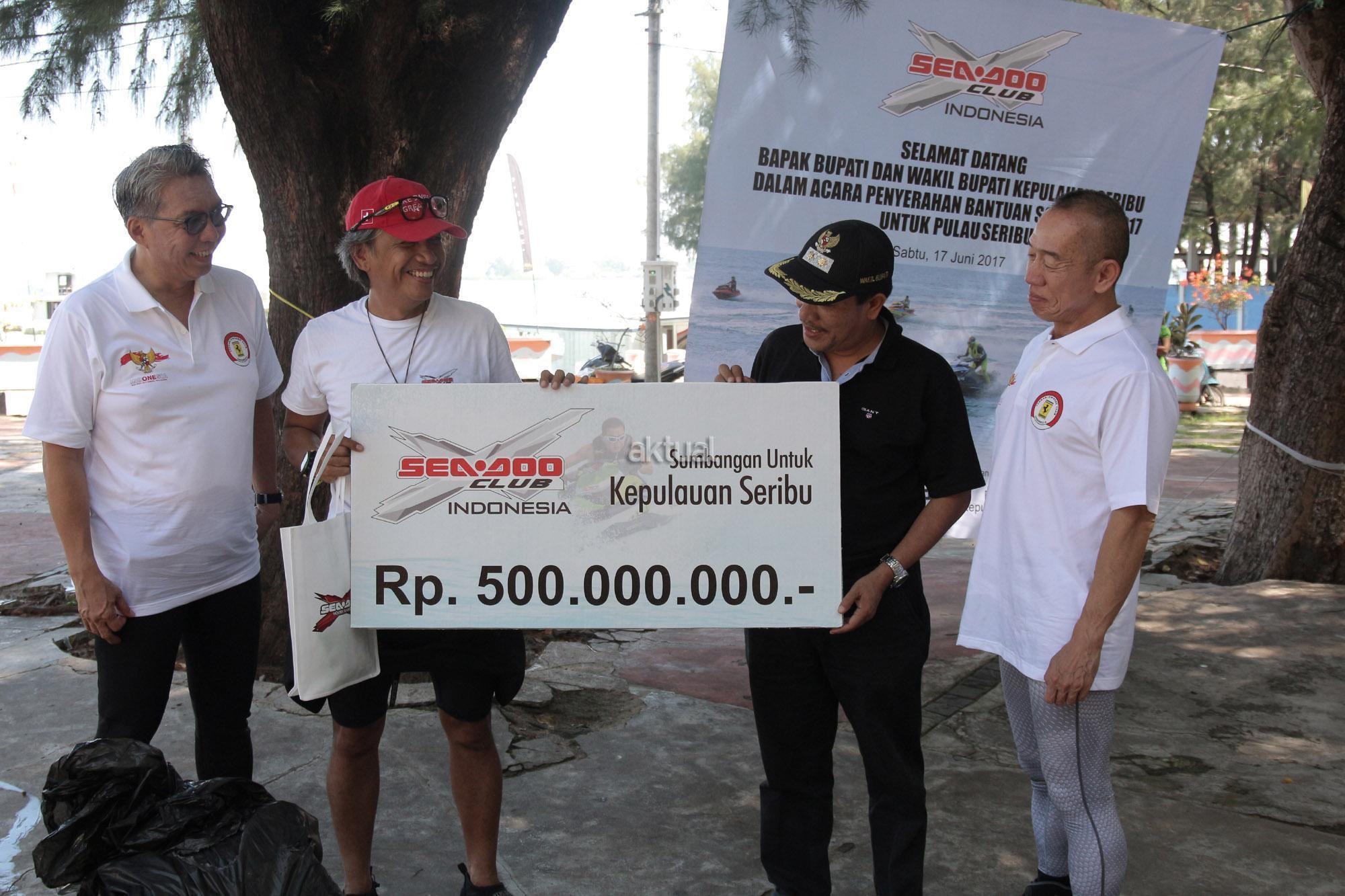 Sekjen Seadoo Club Indonesia Piri Sudjarwo (kedua kiri) bersama Pembina Romy Winata (kiri) memberikan bantuan secara simbolis kepada Wakil Bupati Kepulauan Seribu Ismer Harahap (kedua kanan) disela acara SCI PEDULI 2017 di Pulau Pramuka, Jakarta, Sabtu (17/6) Seadoo Club Indonesia memeberikan bantuan kepada 5000 warga Kepualauan Seribu sebesar Rp500 juta dalam bentuk sembako dan uang. AKTUAL/HO