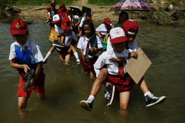 Puluhan siswa SDN 07 Ranomeeto Barat melintasi kali untuk tiba di sekolahnya melaksanakan ujian sekolah, Konawe Selatan, Sulawesi Tenggara, Selasa (17/5). Tidak ada akses jalan menuju ke sekolah puluhan siswa dan beberapa orang guru harus menyeberangi kali Konaweha sekitar 45 meter dan bila air kali meluap dipastikan mereka meliburkan diri. ANTARA FOTO/Jojon/pd/16.