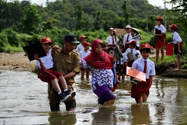 Seorang guru menggendong siswa yang tidak berani melintasi kali saat ke sekolah di SDN 07 Ranomeeto, Konawe Selatan, Sulawesi Tenggara, Selasa (17/5). Tidak ada akses jalan menuju ke sekolah puluhan siswa dan beberapa orang guru harus menyeberangi kali Konaweha sekitar 45 meter dan bila air kali meluap dipastikan mereka meliburkan diri. ANTARA FOTO/Jojon/pd/16.