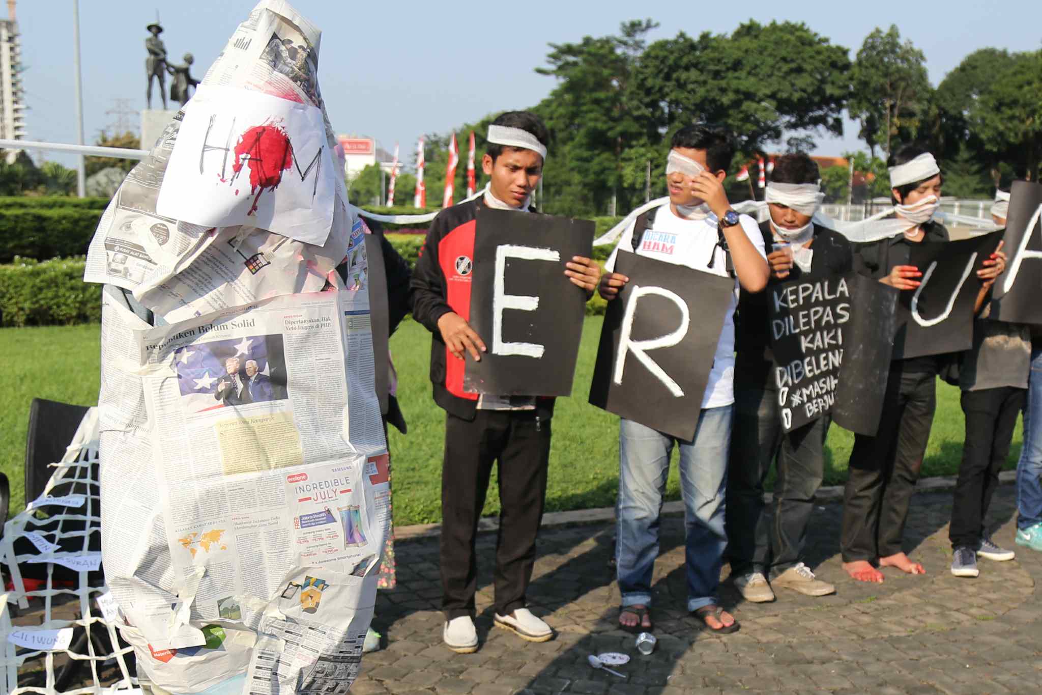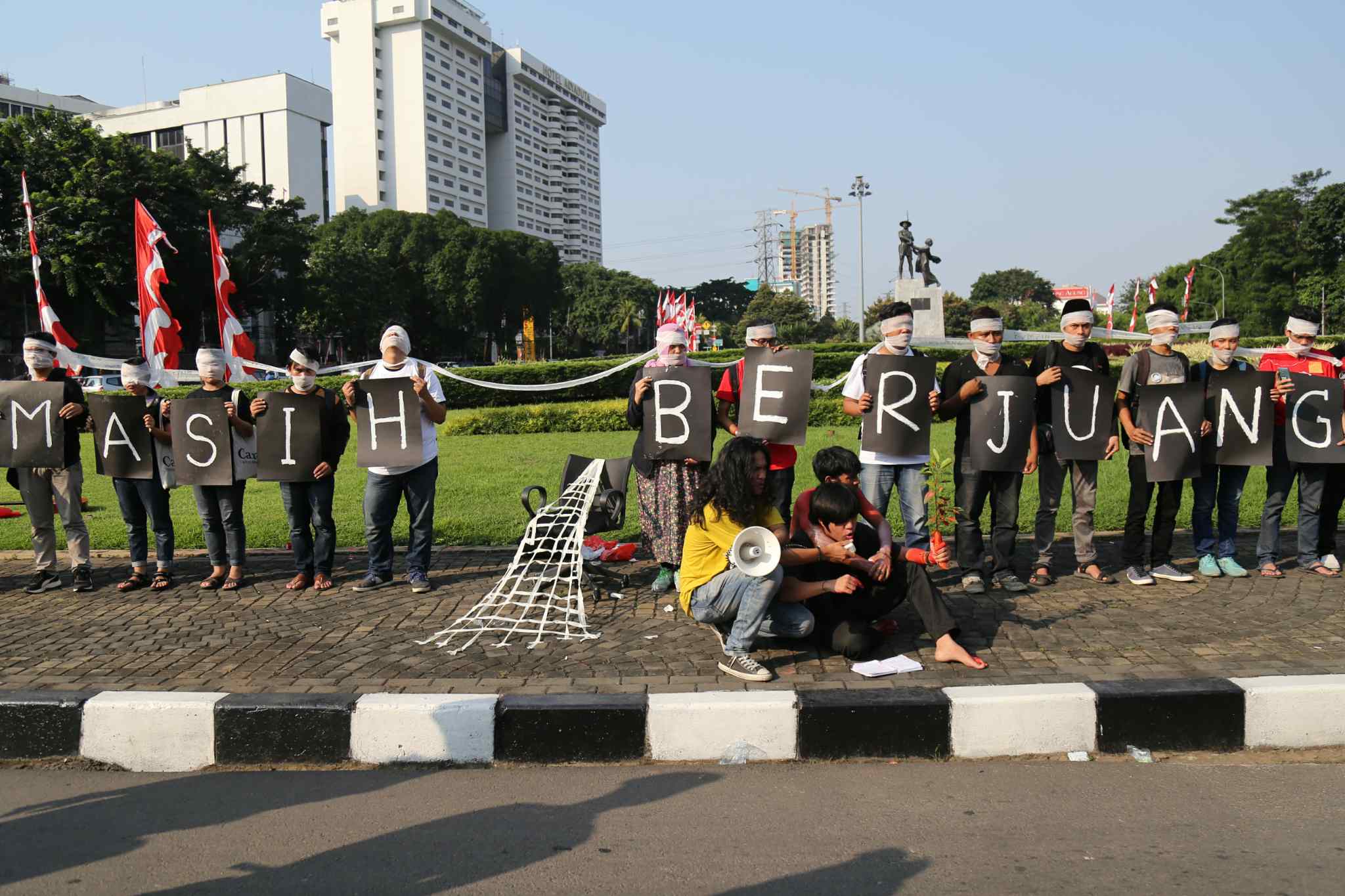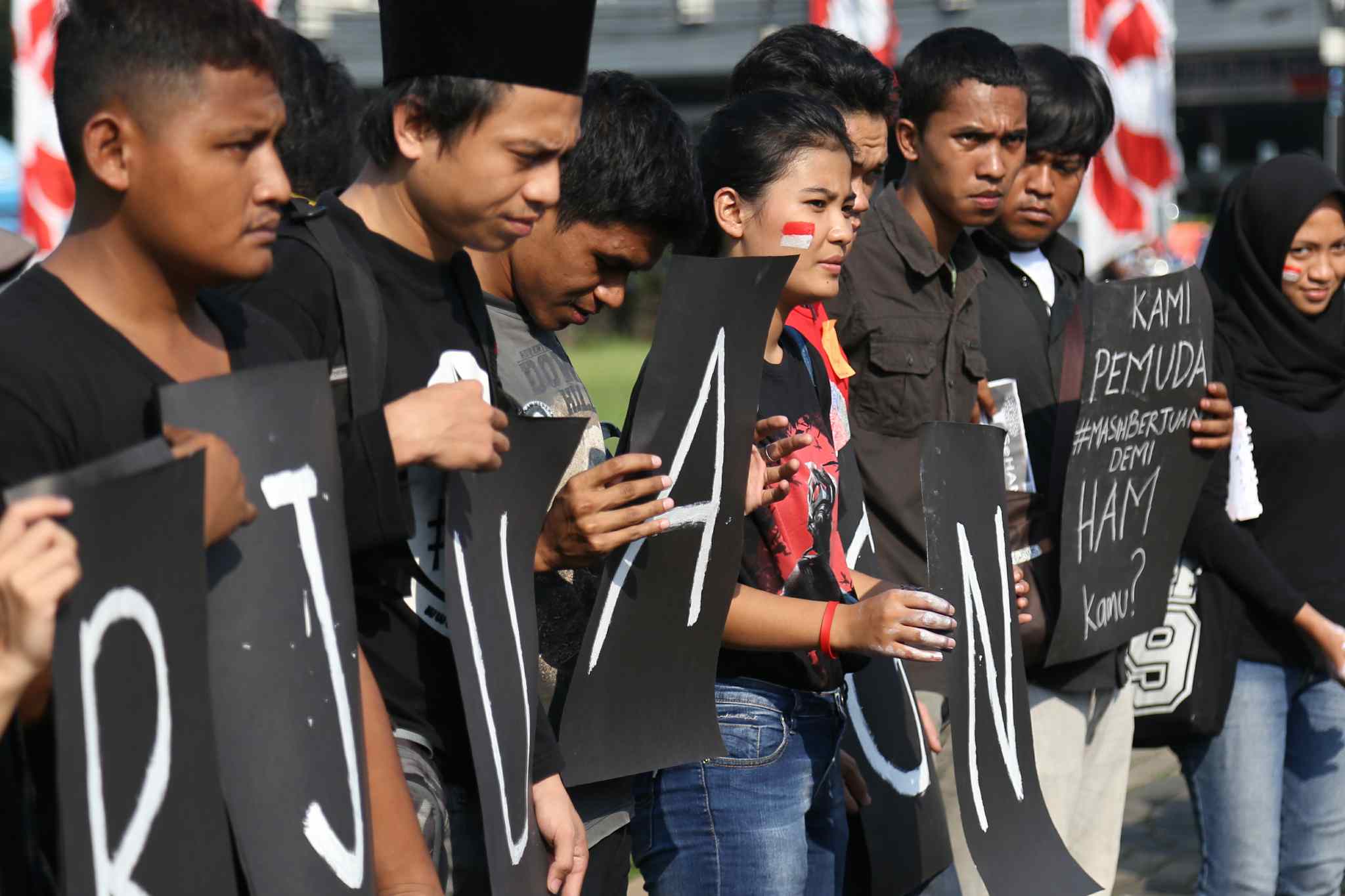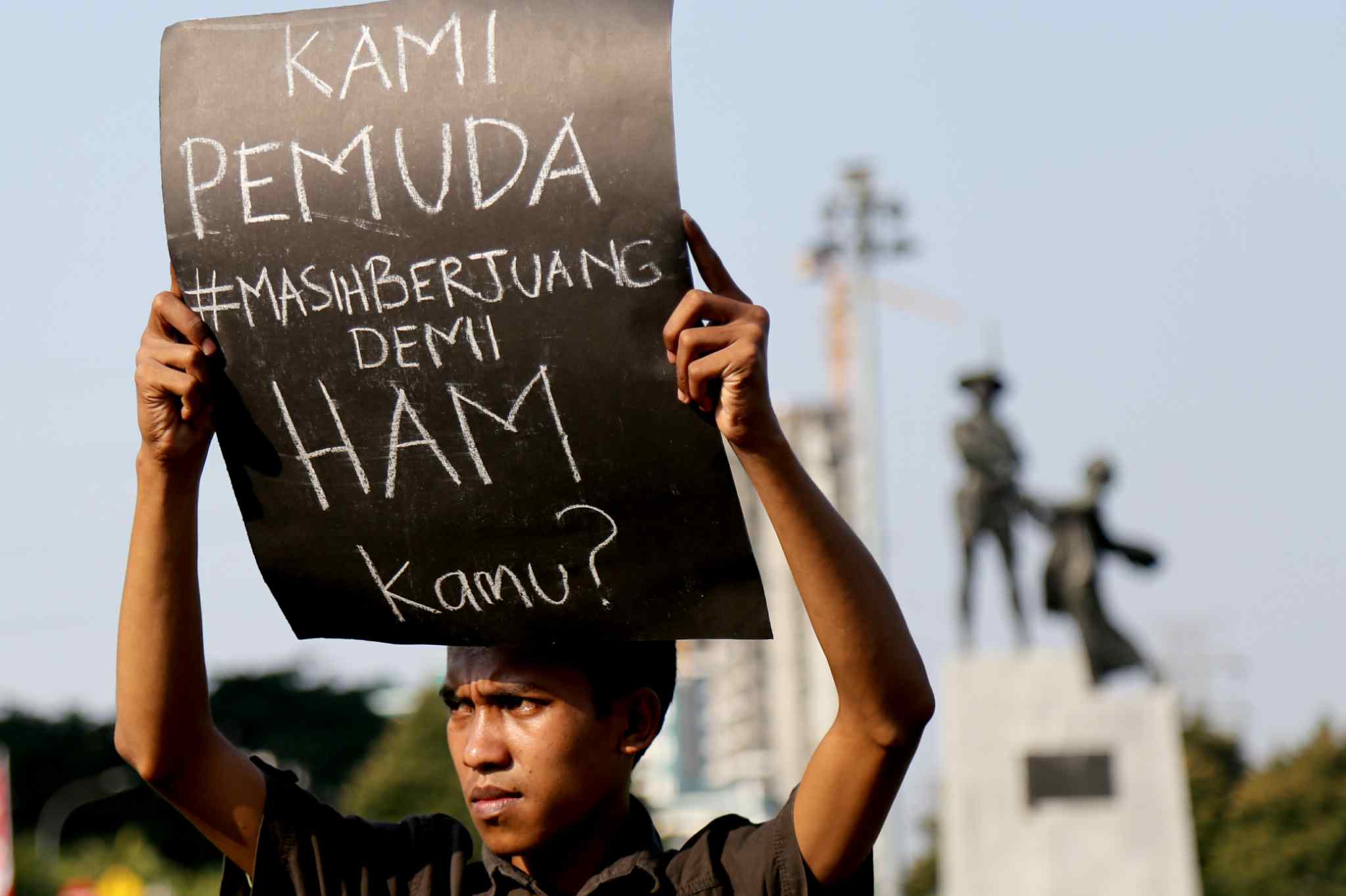 Sejumlah peserta Sekolah Hak Asasi Manusia untuk Mahasiswa (SeHAMA) angkatan 8 dari Komisi untuk Orang Hilang dan Korban Tindak Kekerasan (KontraS) melakukan aksi di Tugu Tani, Jakarta, Sabtu (20/8). Aksi yang digelar sebagai refleksi 71 tahun kemerdekaan RI tersebut merupakan bentuk kepedulian dan perjuangan menuntut penyelesaian kasus pelanggaran hak asasi manusia yang terjadi di masa lalu hingga hari ini. AKTUAL/TINO OKTAVIANO