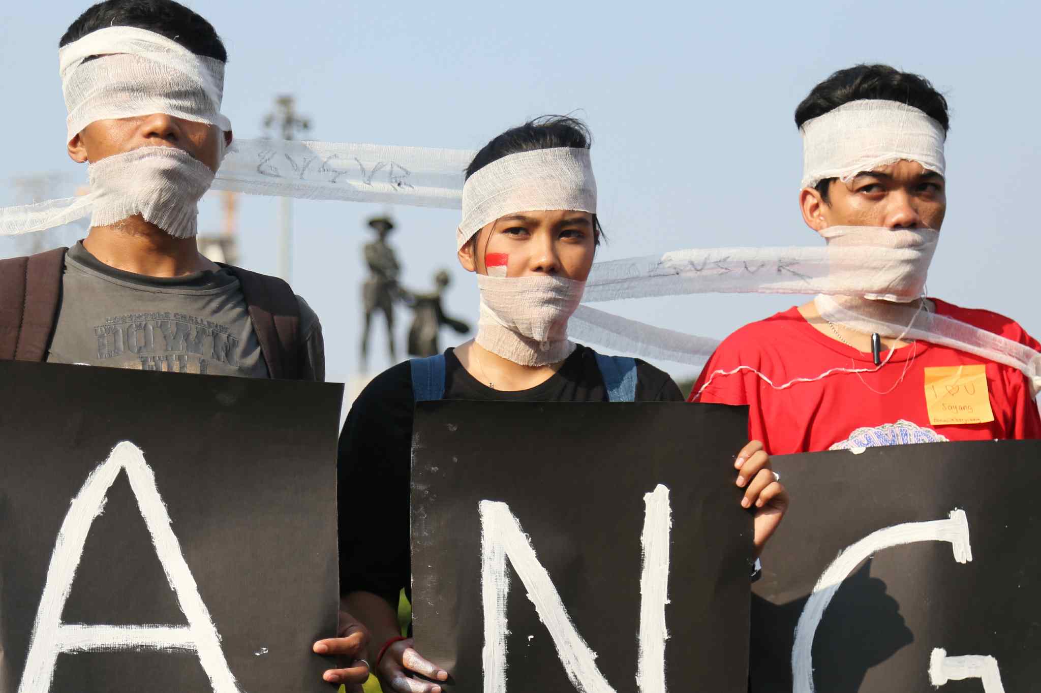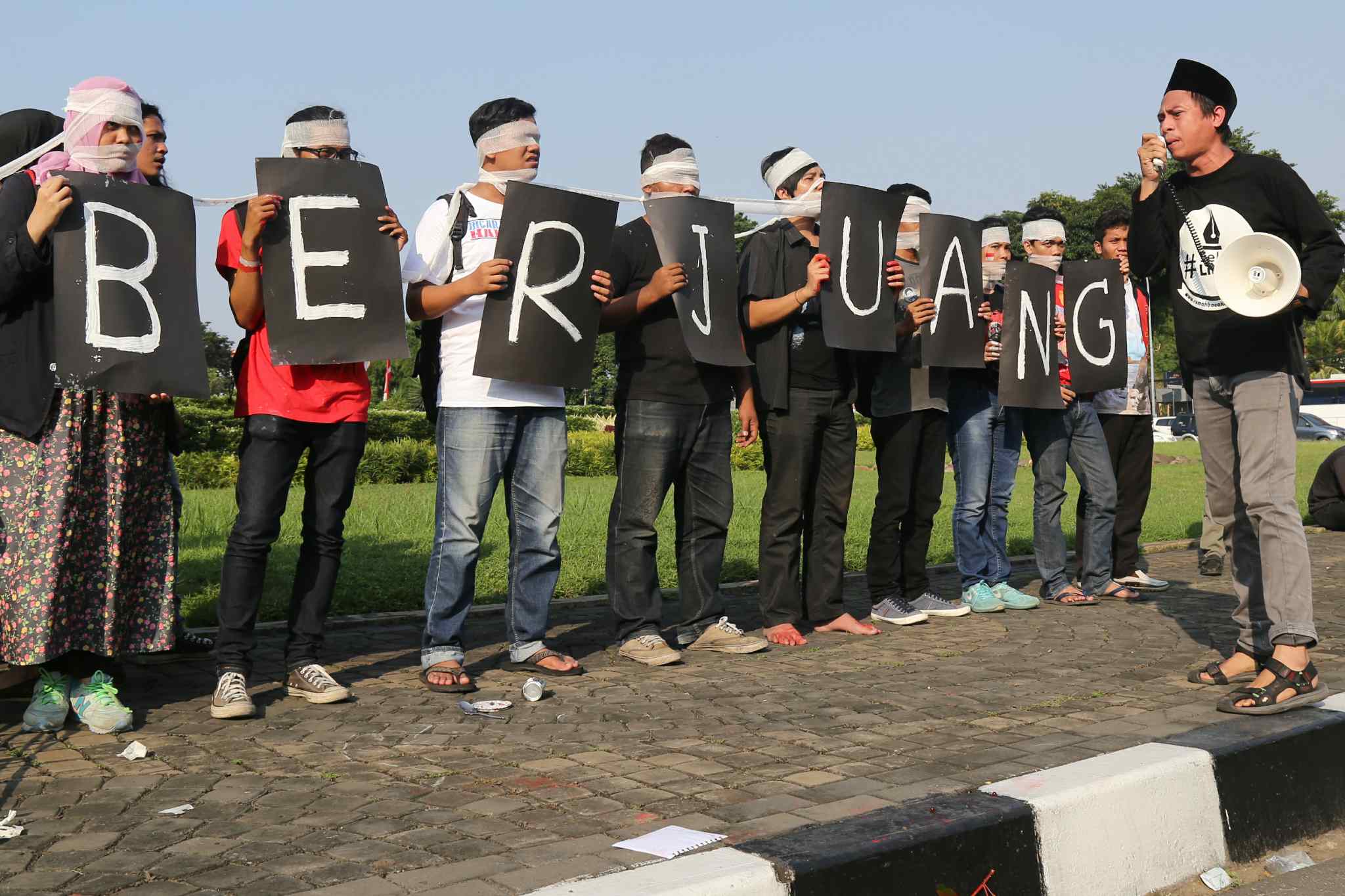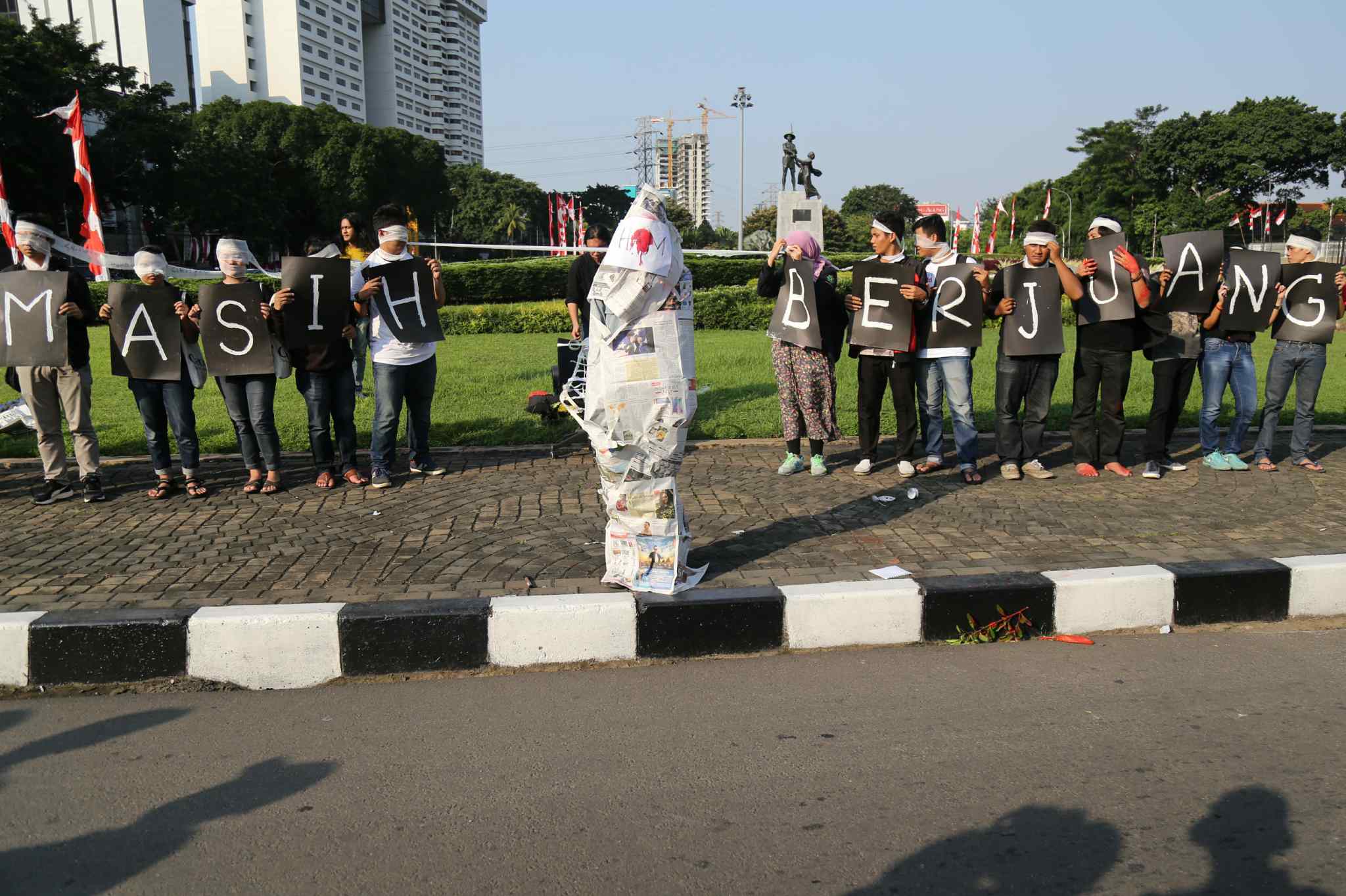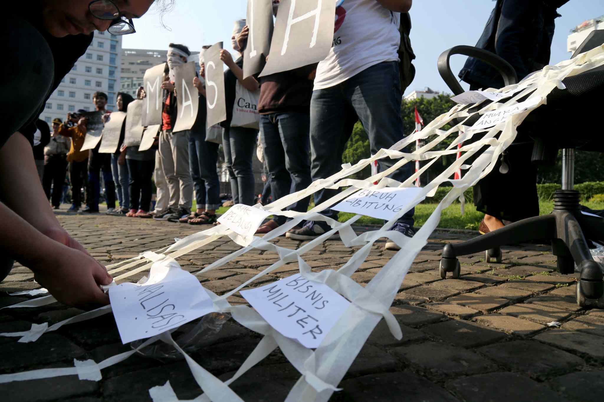 Sejumlah peserta Sekolah Hak Asasi Manusia untuk Mahasiswa (SeHAMA) angkatan 8 dari Komisi untuk Orang Hilang dan Korban Tindak Kekerasan (KontraS) melakukan aksi di Tugu Tani, Jakarta, Sabtu (20/8). Aksi yang digelar sebagai refleksi 71 tahun kemerdekaan RI tersebut merupakan bentuk kepedulian dan perjuangan menuntut penyelesaian kasus pelanggaran hak asasi manusia yang terjadi di masa lalu hingga hari ini. AKTUAL/TINO OKTAVIANO