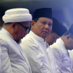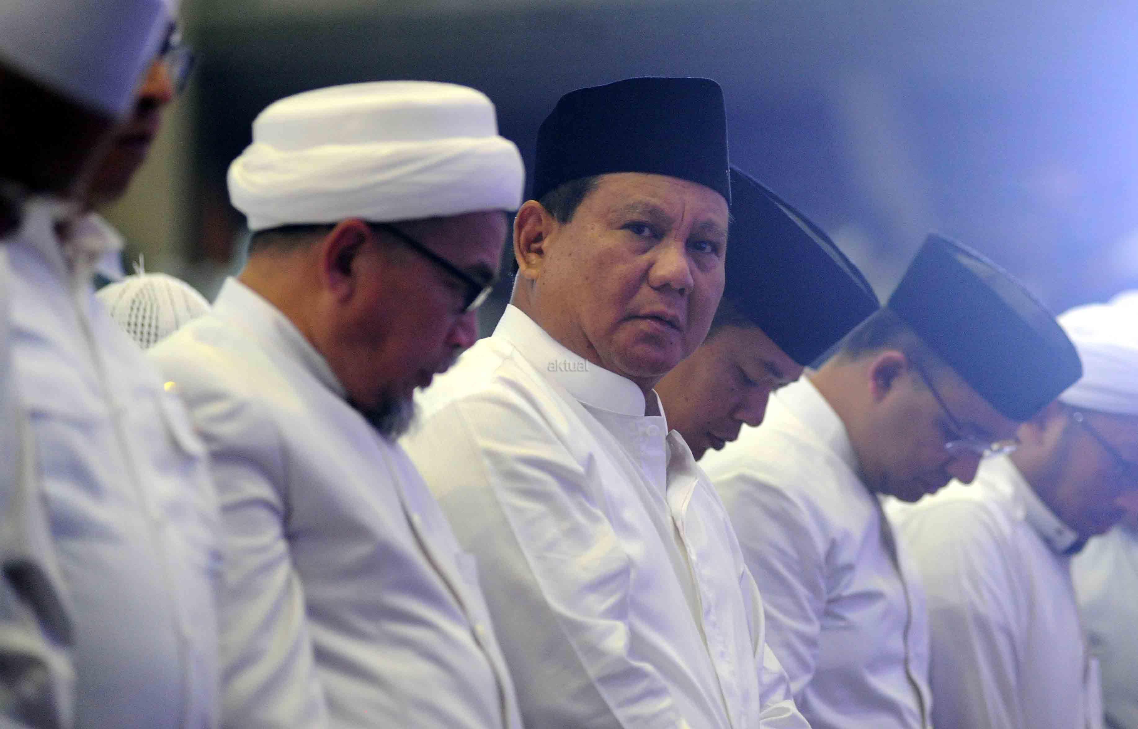 Prabowo Subianto saat menghadiri peringatan ke-51 Supersemar dan haul mantan Presiden Indonesia Soeharto di Masjid Agung At-Tin, Taman Mini Indonesia Indah, Jakarta Timur, Sabtu (11/3). Ribuan umat muslim dan beberapa tokoh menghadiri kegiatan ini, di antaranya Prabowo, Cagub Anies Baswedan, dan Cawagub Djarot Saiful Hidayat. AKTUAL/Tino Oktaviano