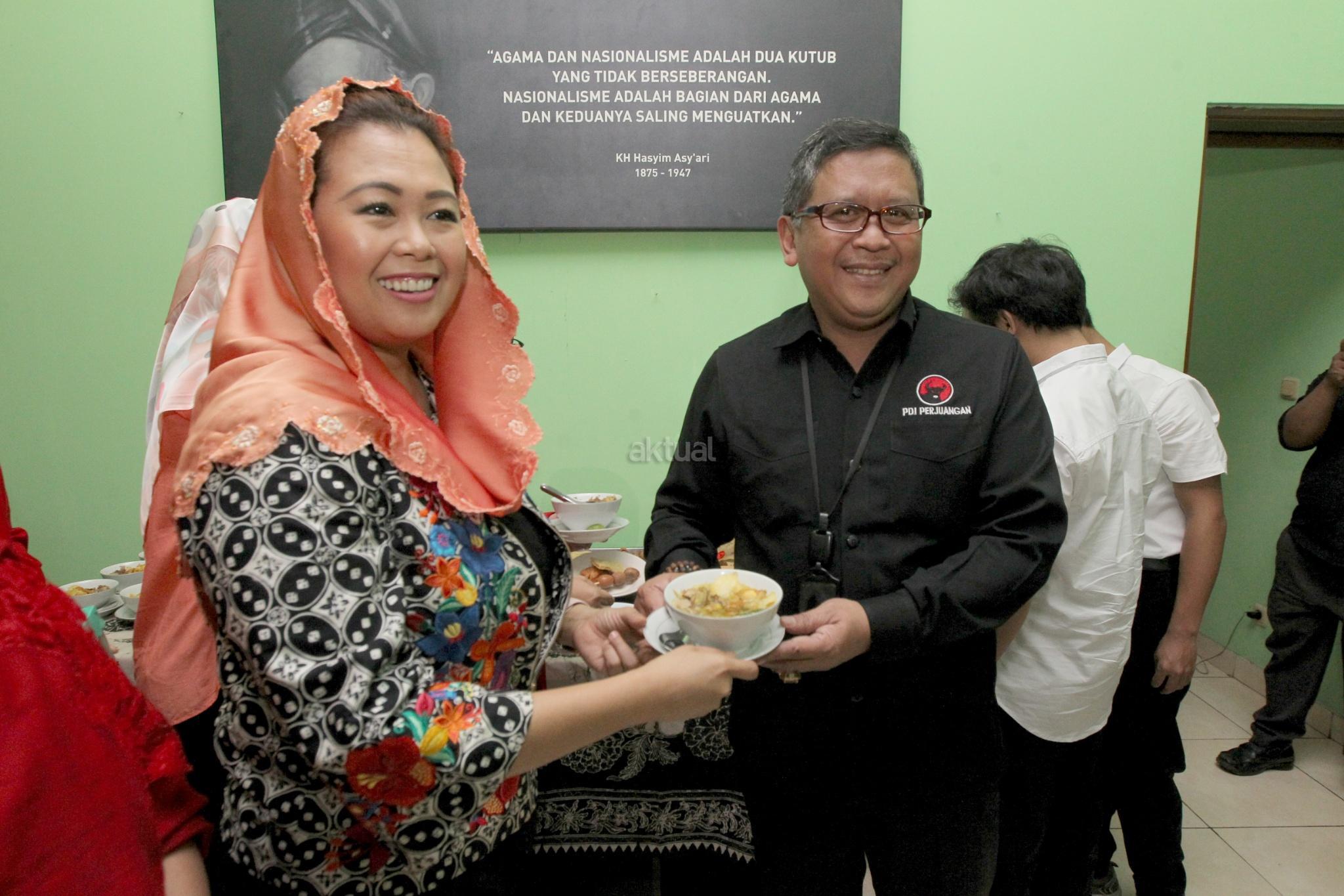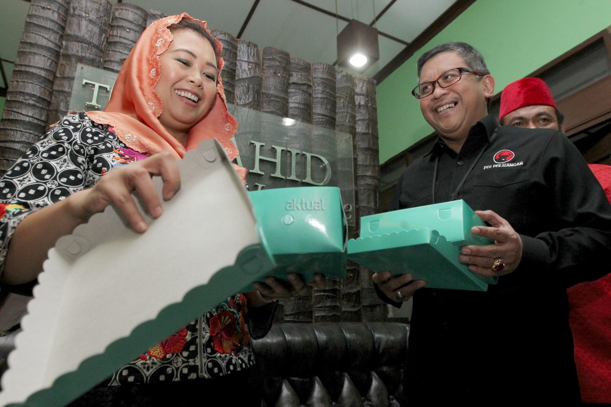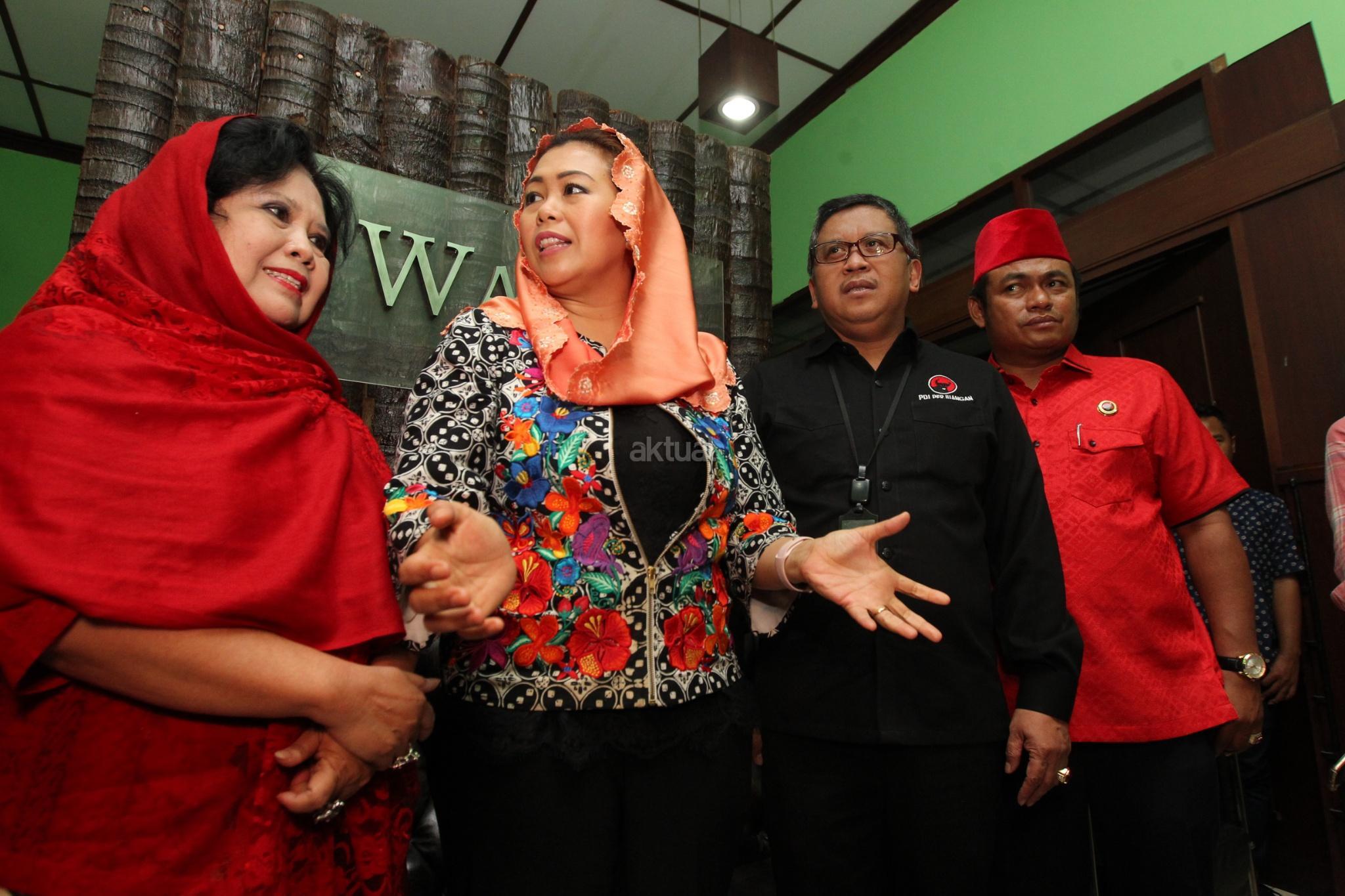 Sekjen PDI Perjuangan Hasto Kristiyanto berbincang dengan Direktur Eksekutif The Wahid Institute Yenny Wahid disaksikan pengurus lainnya sesaat sebelum melakukan pertemuan di The Wahid Institute, Menteng, Jakarta, Senin (5/2/18). Pertemuan tersebut membahas persiapan menjelang 20 tahun reformasi dan perjuangan Gus Dur-Megawati dalam menegakkan demokrasi di Indonesia. AKTUAL/Tino Oktaviano