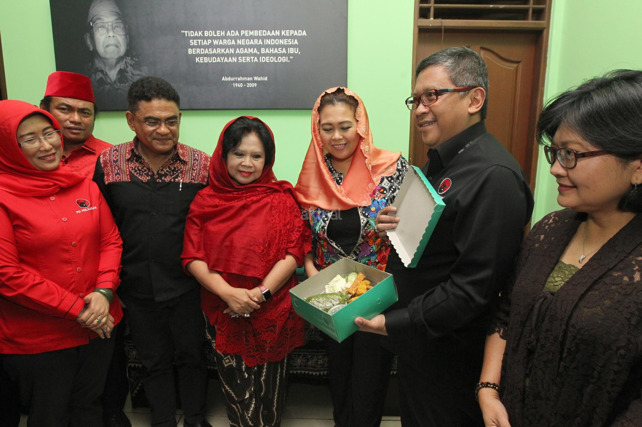 Sekjen PDI Perjuangan Hasto Kristiyanto berbincang dengan Direktur Eksekutif The Wahid Institute Yenny Wahid (tiga dari kanan) disaksikan pengurus lainnya sesaat sebelum melakukan pertemuan di The Wahid Institute, Menteng, Jakarta, Senin (5/2/18). Pertemuan tersebut membahas persiapan menjelang 20 tahun reformasi dan perjuangan Gus Dur-Megawati dalam menegakkan demokrasi di Indonesia. AKTUAL/Tino Oktaviano