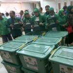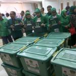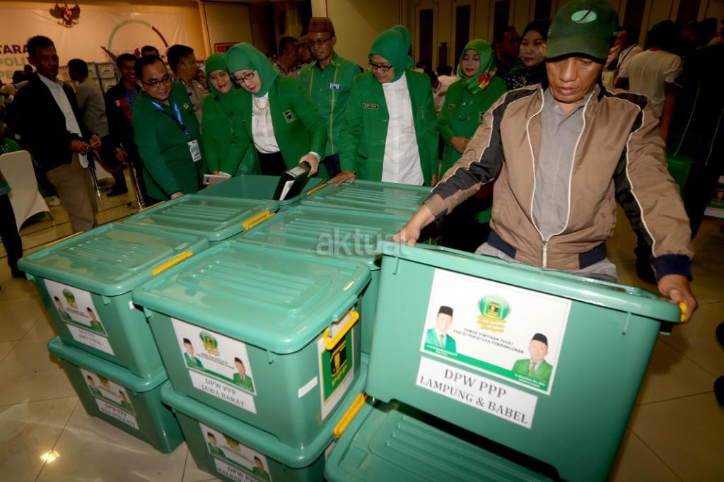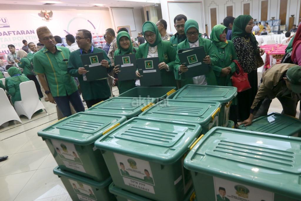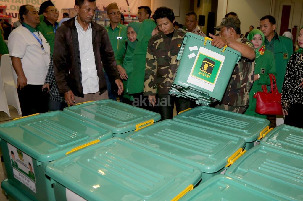 Staf PPP membereskan kotak berkas saat akan menyerahkan pendaftaran menjadi peserta Pemilu 2019 di gedung KPU, Jakarta, Sabtu (14/10). Irama musik marawis mengiringi kedatangan rombongan PPP yang menyerahkan sejumlah dokumen persyaratan untuk mendaftar. AKTUAL/Tino Oktaviano