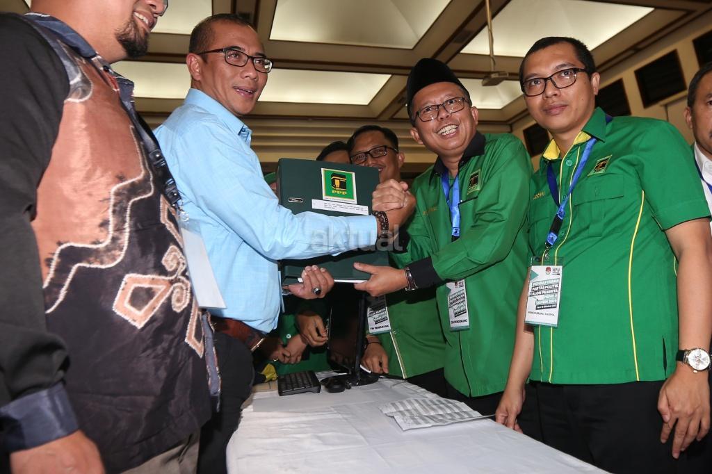 Sekjen PPP Arsul Sani didampingi staf PPP menyerahkan pendaftaran menjadi peserta Pemilu 2019 di gedung KPU, Jakarta, Sabtu (14/10). Irama musik marawis mengiringi kedatangan rombongan PPP yang menyerahkan sejumlah dokumen persyaratan untuk mendaftar. AKTUAL/Tino Oktaviano