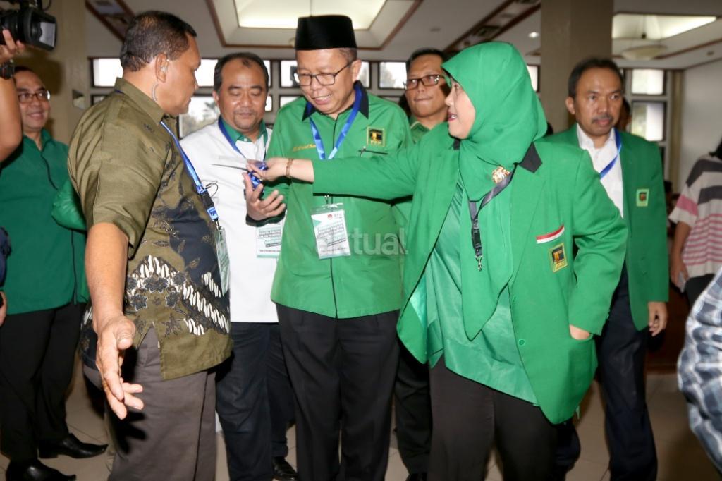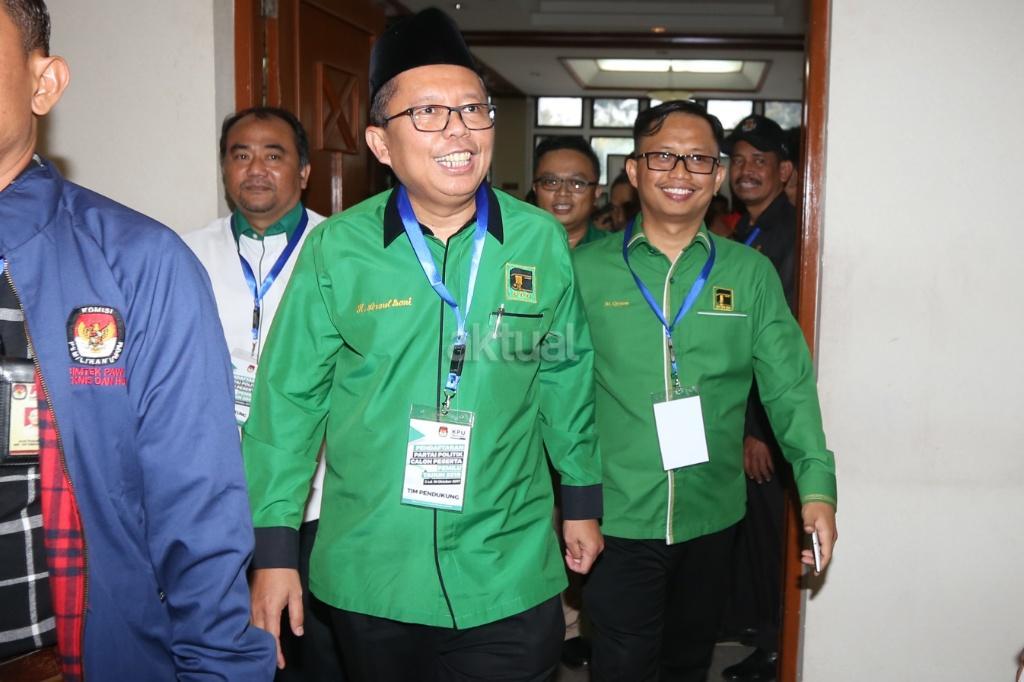 Sekjen PPP Arsul Sani sidampingi staf PPP menyerahkan pendaftaran menjadi peserta Pemilu 2019 di gedung KPU, Jakarta, Sabtu (14/10). Irama musik marawis mengiringi kedatangan rombongan PPP yang menyerahkan sejumlah dokumen persyaratan untuk mendaftar. AKTUAL/Tino Oktaviano