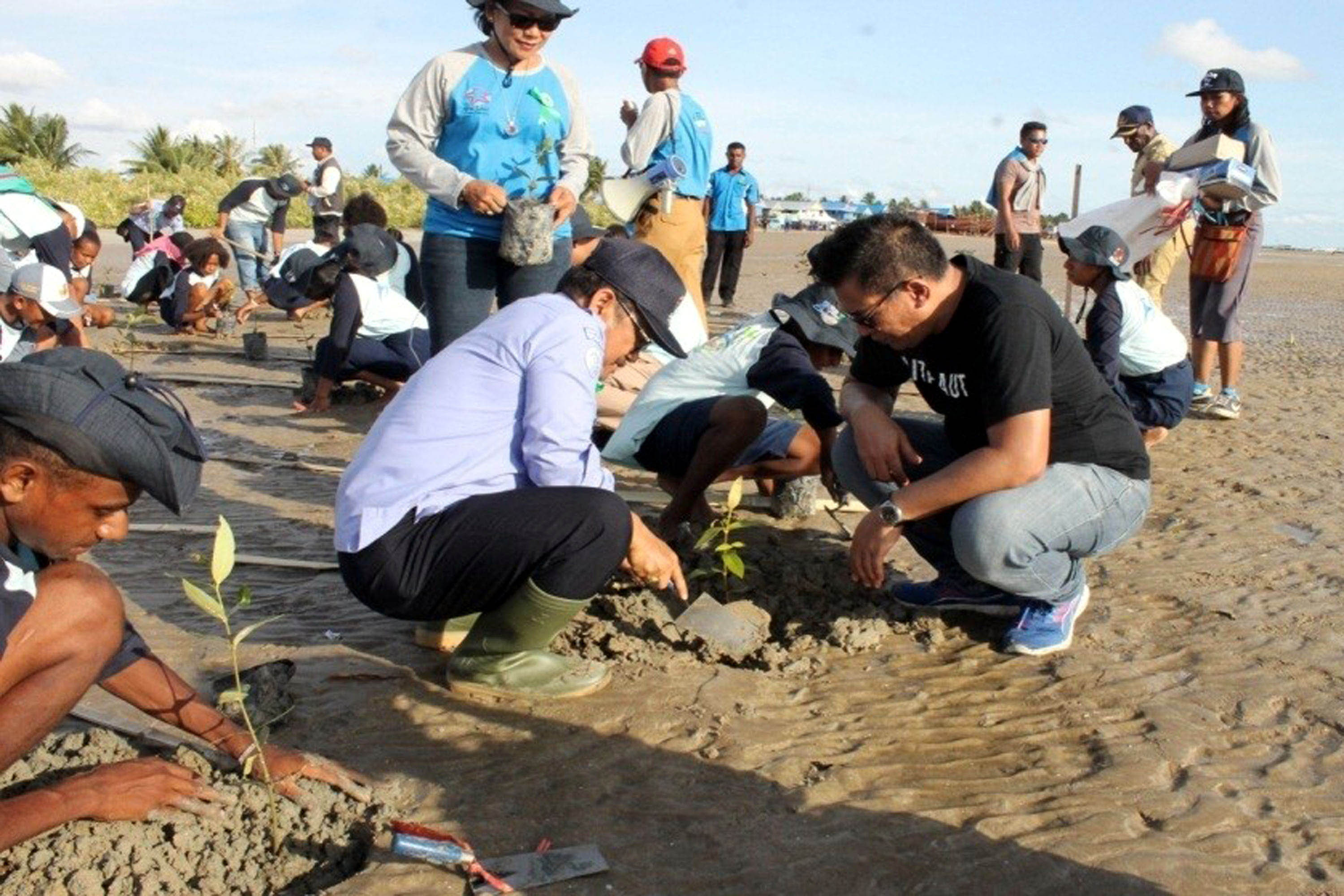 Peserta mengikuti kegiatan bersih pantai dan penanaman Mangrove dalam program Sekolah Pantai Indonesia (SPI) yang diadakan di pesisir Pantai Lampu Satu Kabupaten Merauke (4/12). Sekolah Pantai Indonesia merupakan inisiasi untuk meningkatkan kesadaran masyarakat pesisir, khususnya kepada siswa sekolah di wilayah pesisir tentang pengelolaan pantainya serta menumbuhkan kepedulian dan kecintaan pada lingkungan dengan membekali siswa tentang dampak perubahan iklim terhadap ekosistem pesisir. AKTUAL/Istimewa