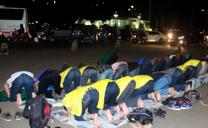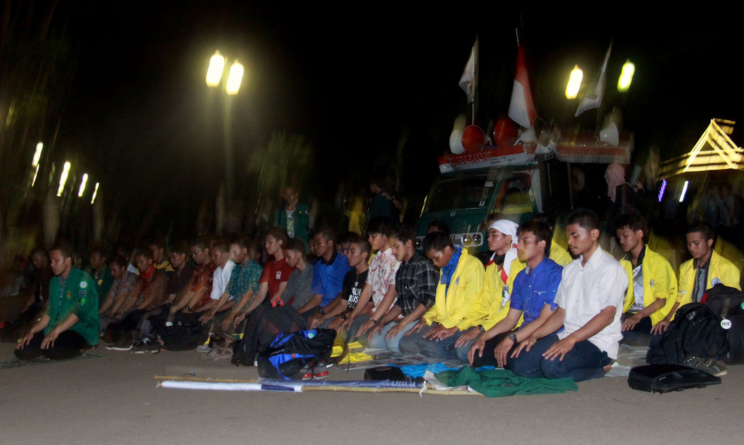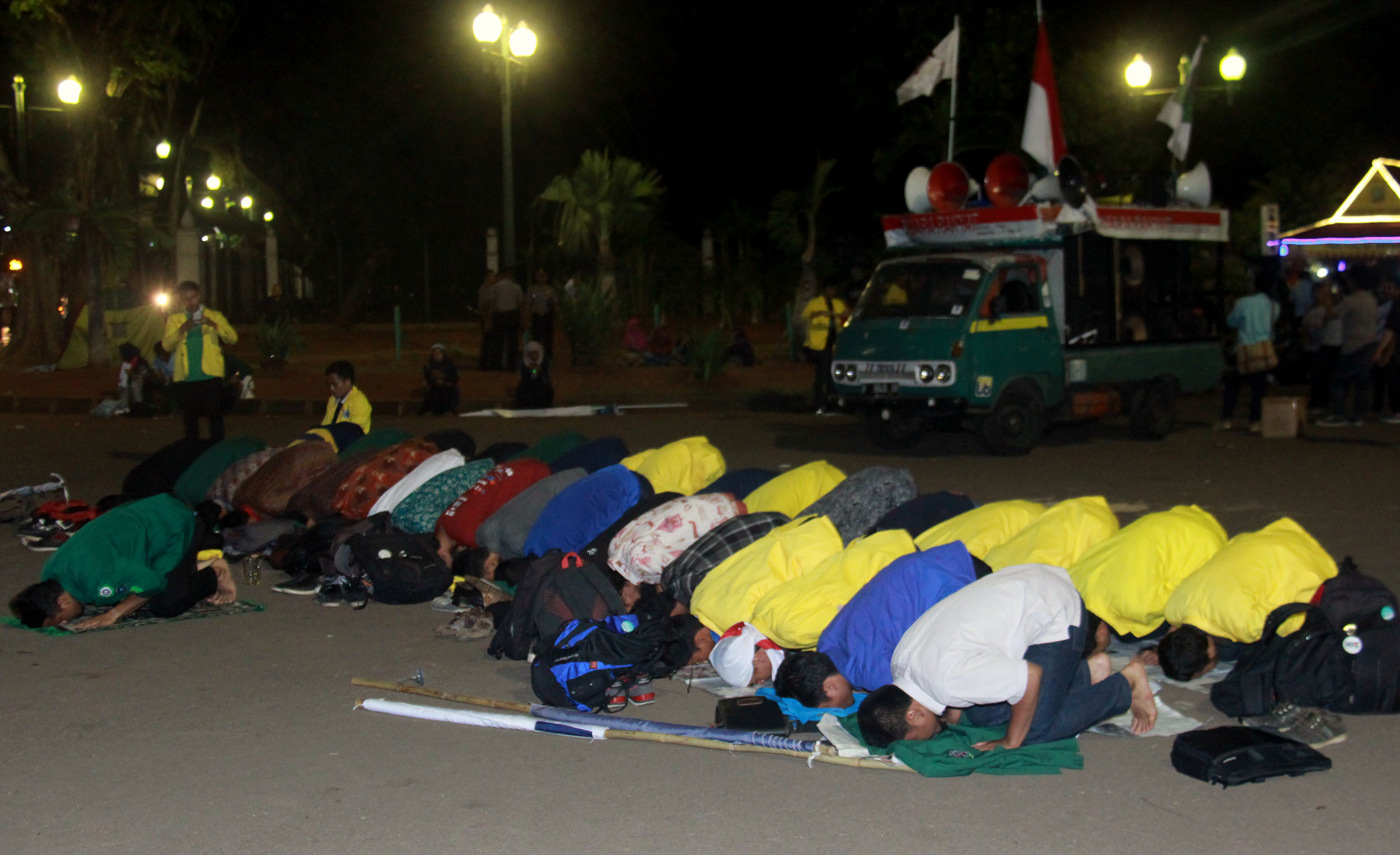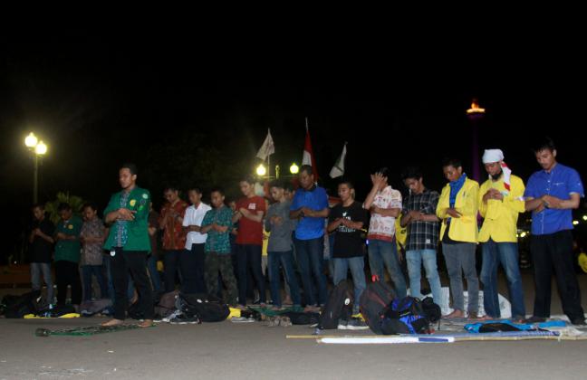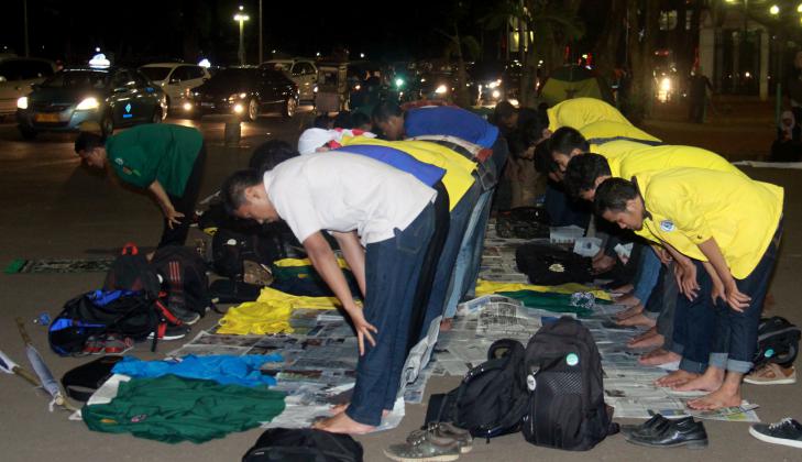 Usai melakukan aksi BEM-SI regional Jabodetabek melakukan Sholat Magrhib bersama di depan Istana Negara, Jakarta, Kamis (10/9/2015). Sebelumnya para ratusan mahasiswa yang tergabung dalam BEM-SI melakukan aksi di depan Istana yang aksinya mereka meminta pemerintah untuk mengendalikan harga pangan yang sedang naik, memberantas mafia pangan dan melindungi pekerja lokal dari ancaman PHK.