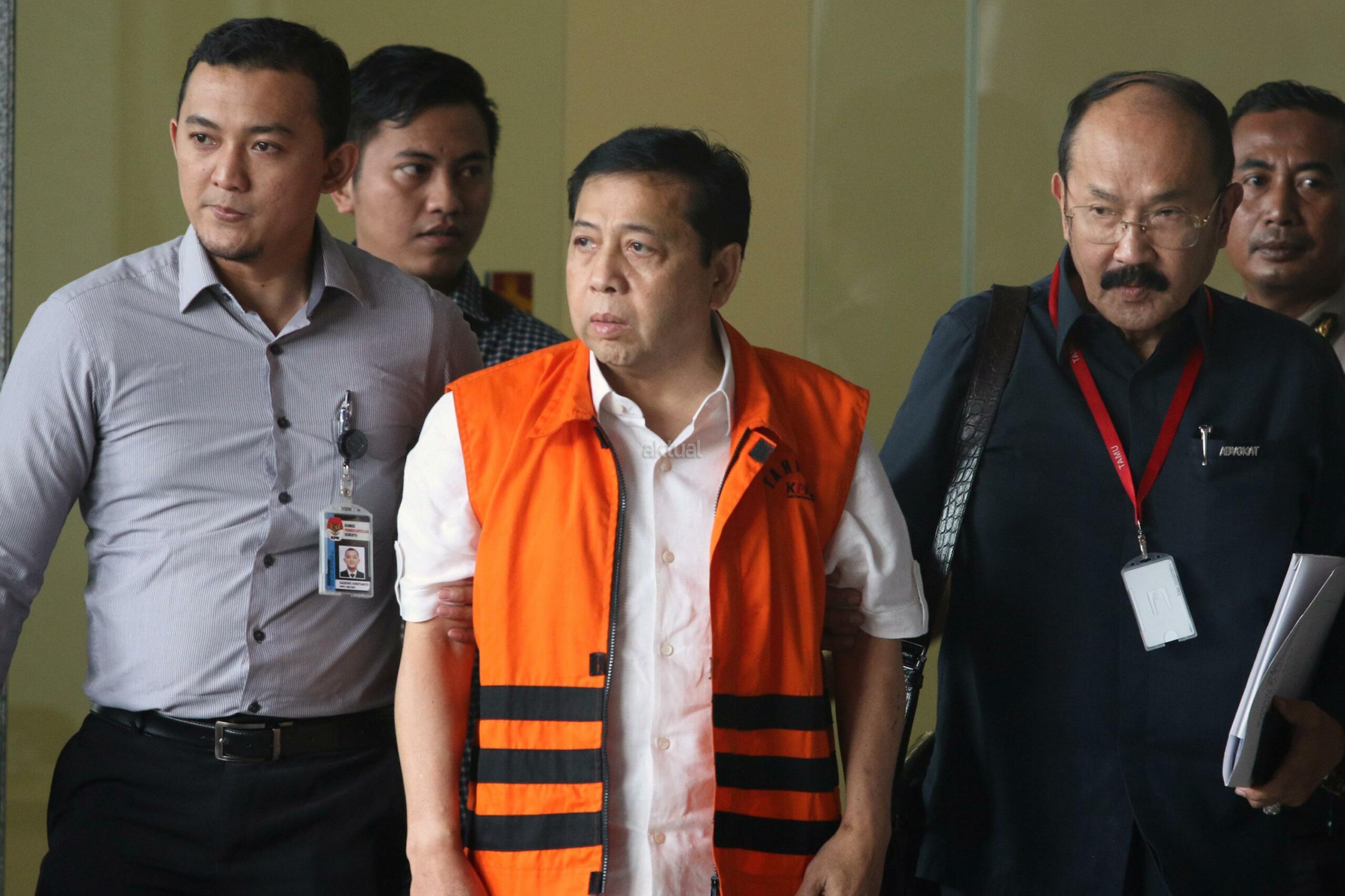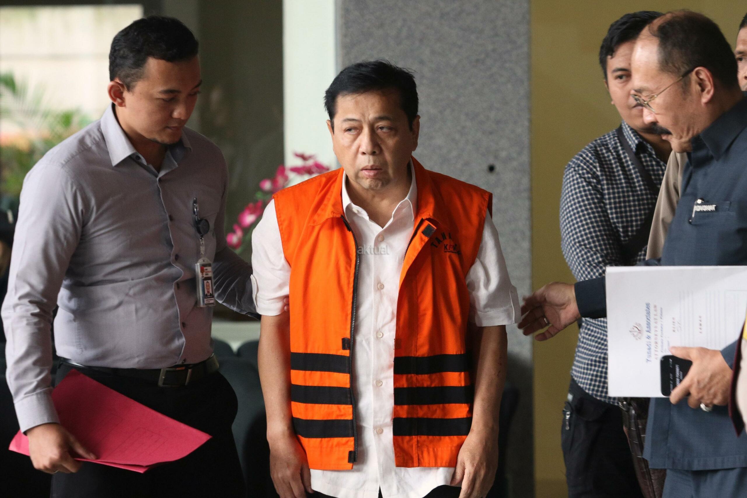 Tersangka kasus korupsi KTP elektronik Setya Novanto (tengah) meninggalkan gedung KPK seusai menjalani pemeriksaan di Jakarta, Selasa (21/11/2017). Ketua DPR tersebut menjalani pemeriksaan perdana selama lima jam usai ditahan oleh KPK terkait dugaan korupsi proek KTP elektronik. AKTUAL/Munzir