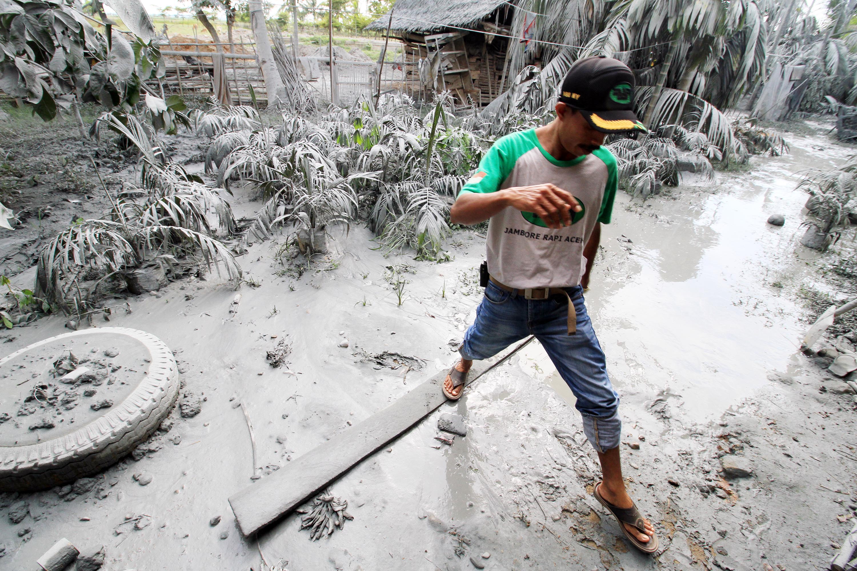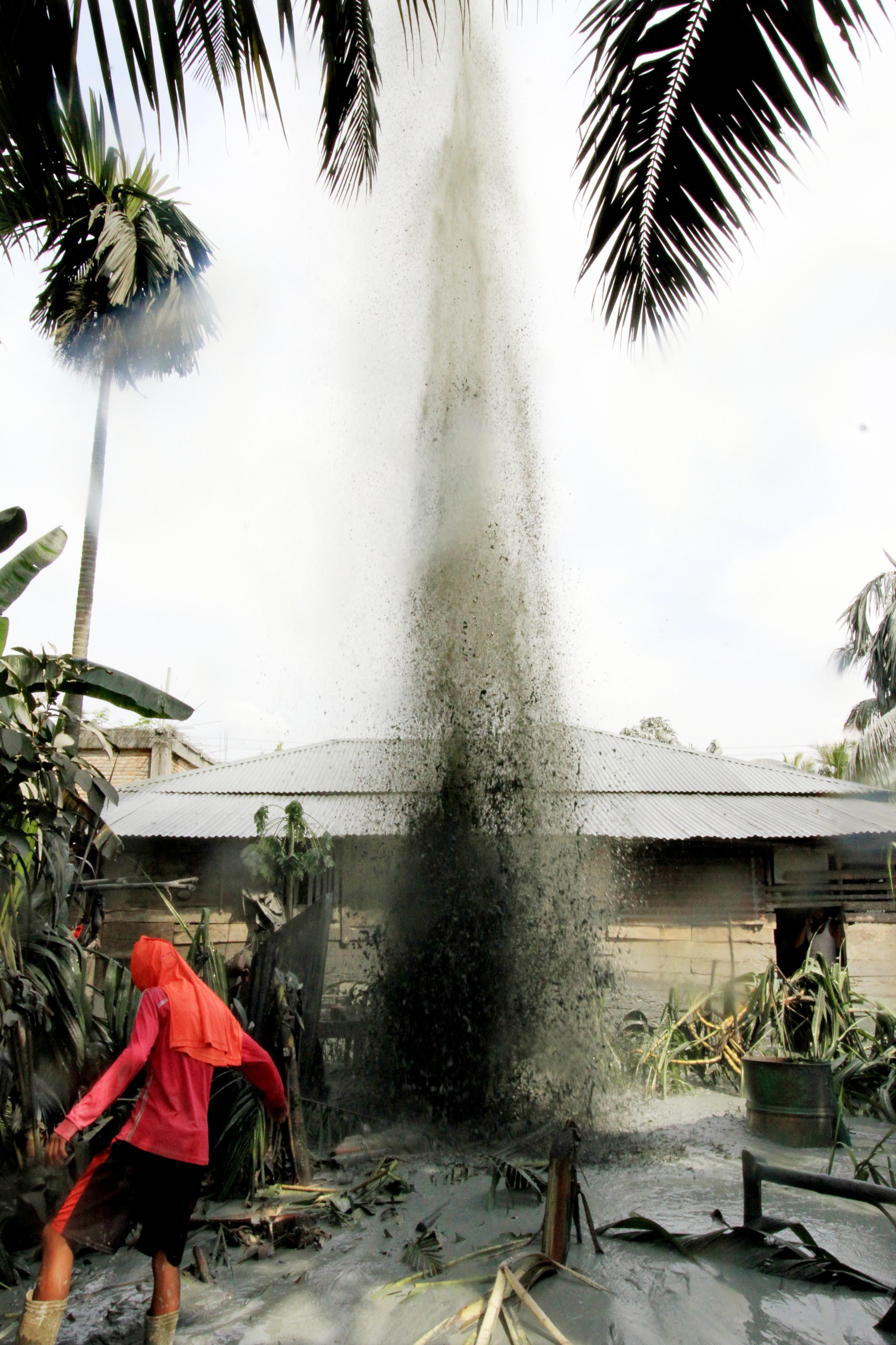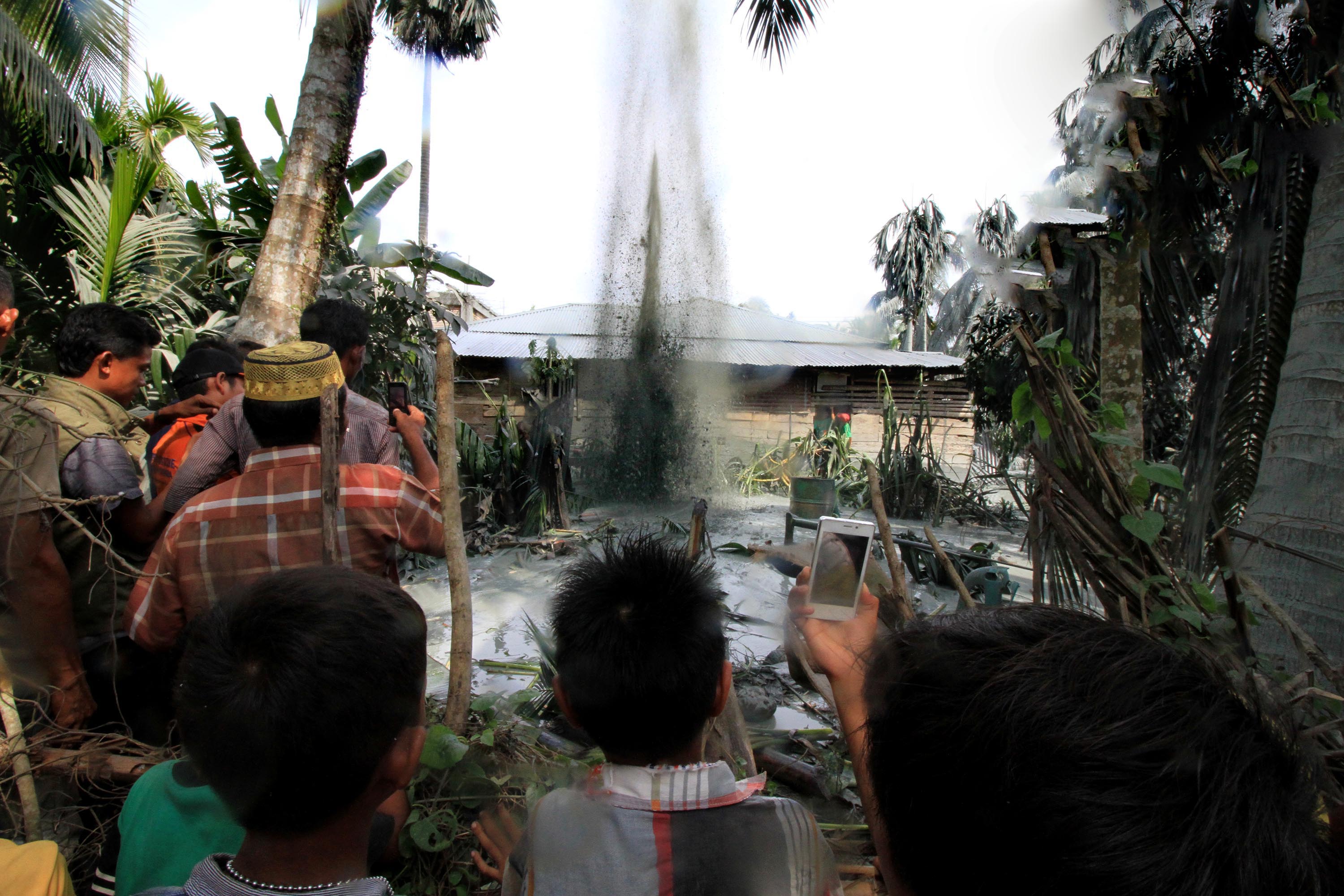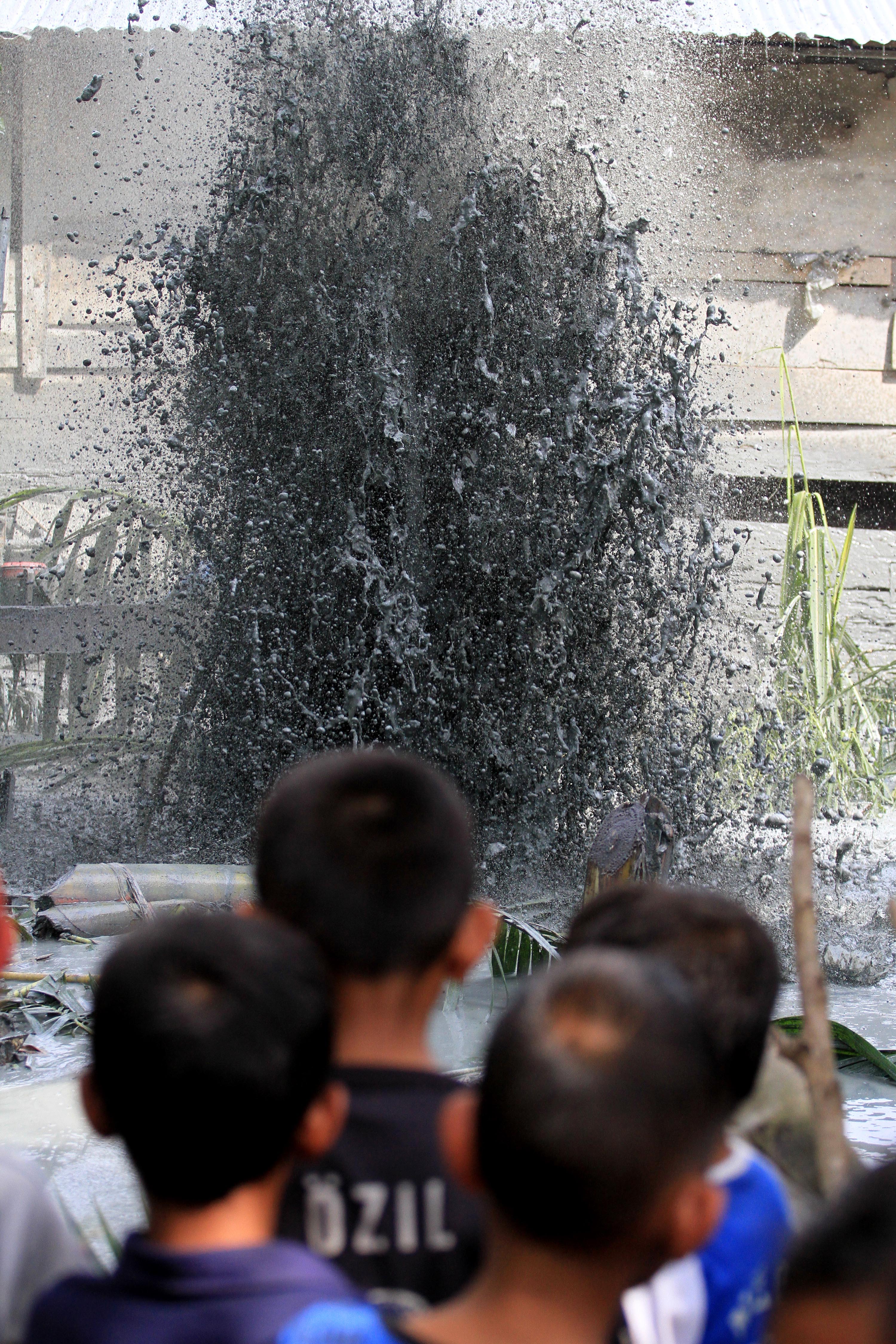 Warga menyaksikan pusat semburan lumpur di Desa Blang Aman, Kabupaten Aceh Utara, Aceh, Senin (25/4). Semburan lumpur bercampur gas menyembur ke udara setinggi 15 meter terjadi setelah pengeboran sumur sedalam 30 meter untuk mendapatkan air bersih di lahan milik warga. Peristiwa tersebut masih dalam penyelidikan pihak Dinas Pertambangan dan Energi kabupaten setempat. ANTARA FOTO/Rahmad/aww/16.