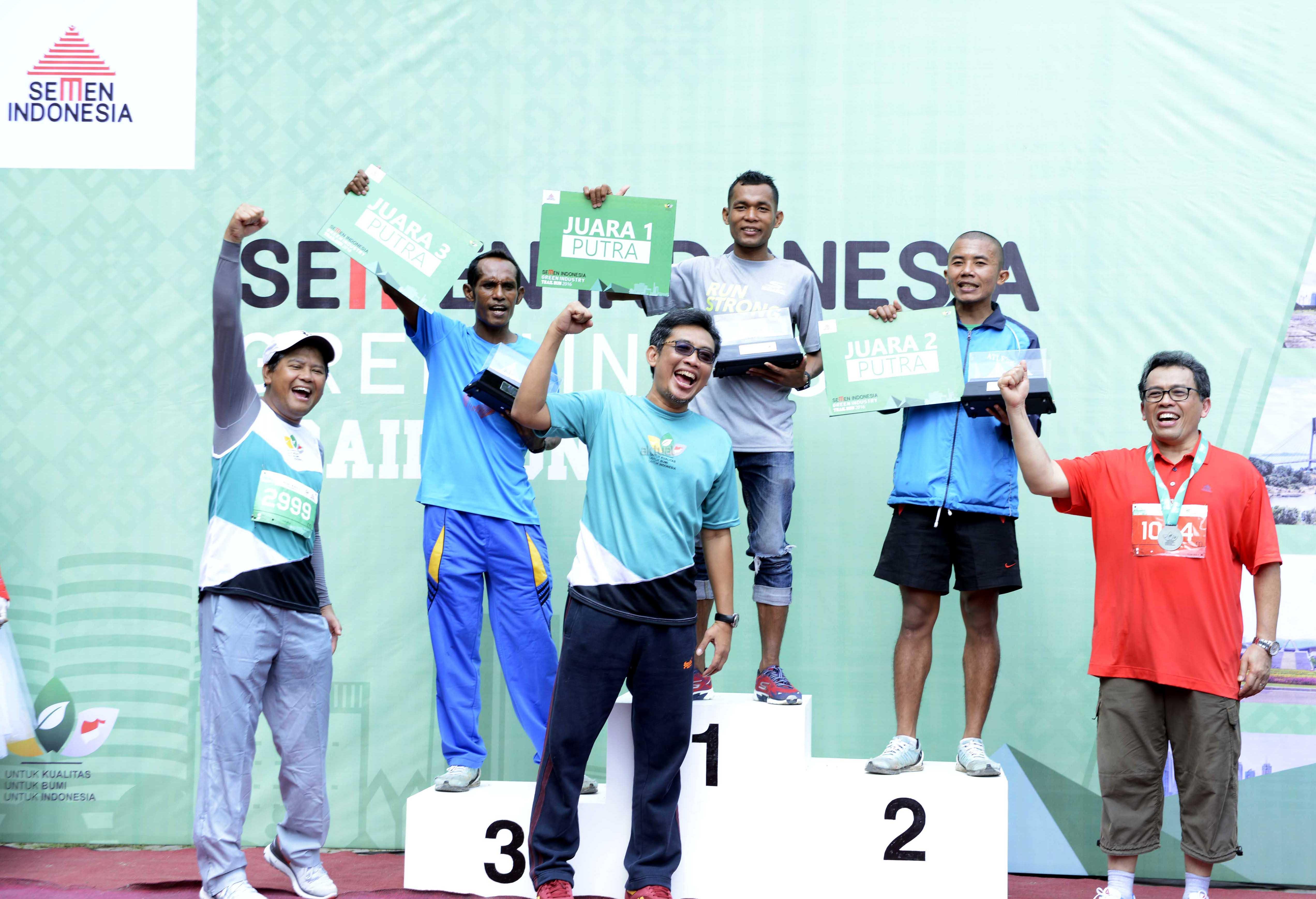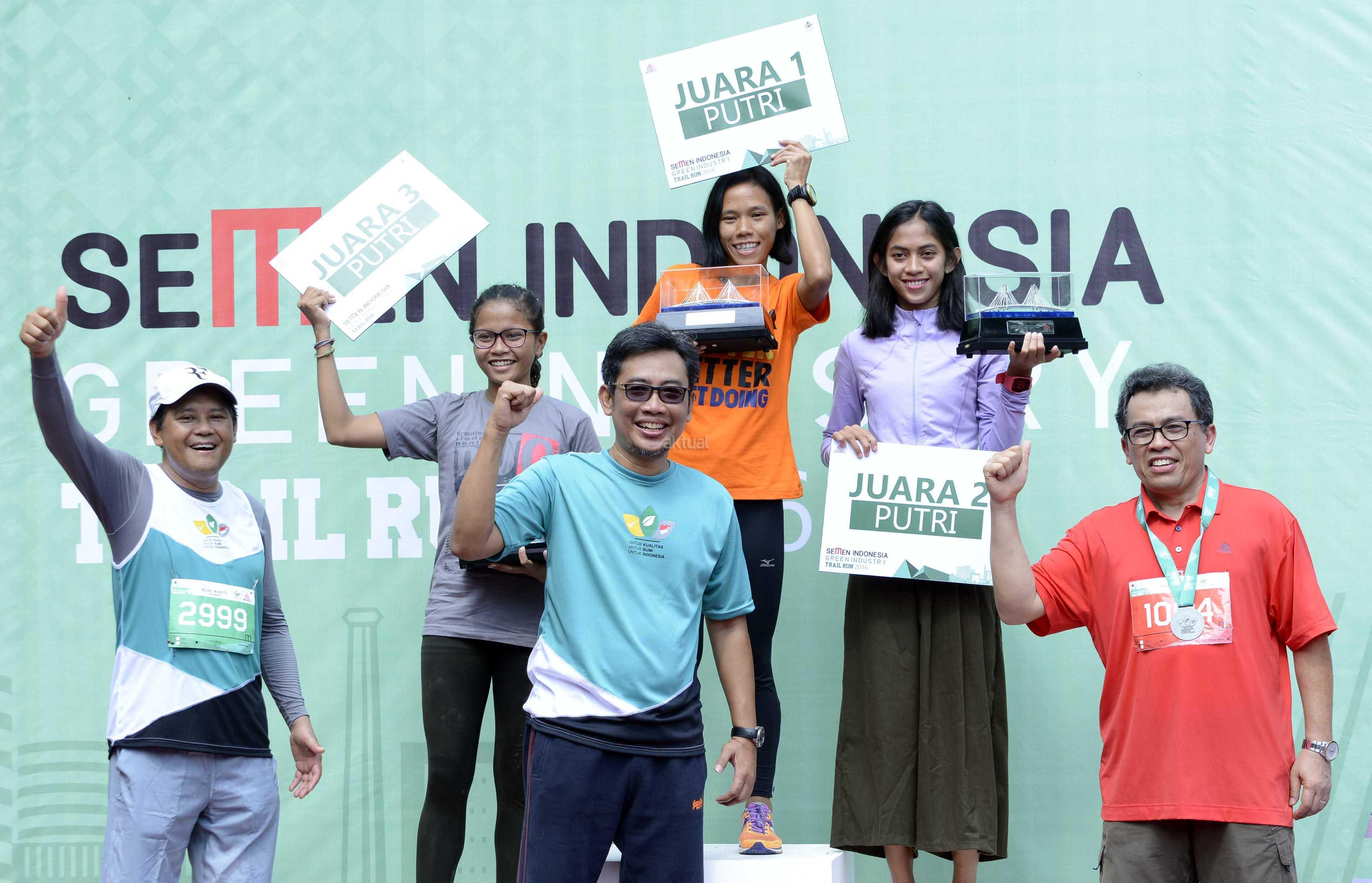 Dari kiri ke Kanan bawah, Sekretaris Perusahaan Agung Wiharto, Direktur SDM dan Hukum Ahyanizzaman, Direktur Produksi dan Litbang Johan Samudra saat menyerahkan hadiah kepada pemenang kategori laki-laki dan perempuan “Semen Indonesia Green Industry Trail Run 2016” di kawasan pabrik Semen Gresik, Jawa Timur, Minggu (13/11/2016). Event ini merupakan ajang lomba lari trail tahunan dengan rute area Pabrik Semen serta Lahan bekas Tambang tanah liat dan batu kapur yang dikelola dengan prinsip Industri Hijau. AKTUAL/HO