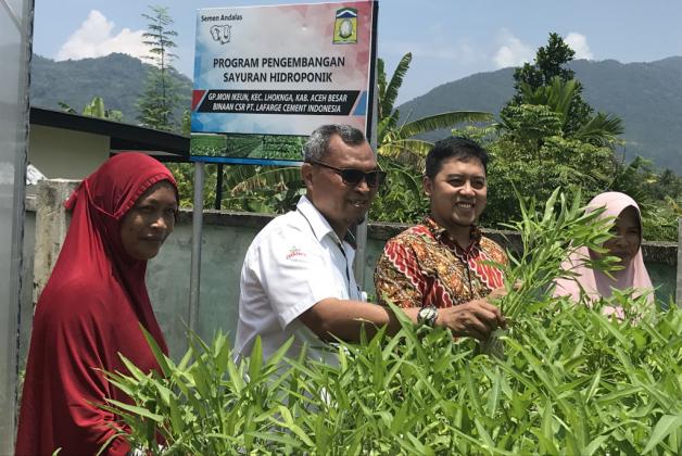 General Manager of Corporate Communication Semen Indonesia, Sigit Wahono (kanan) didampingi General Manager Lhoknga Plant PT Solusi Bangun Andalas, Durain Parmanoan (kedua kiri) mengunjungi mitra binaan Program Pengembangan Sayuran hidroponik di Gampong Mon Ikeun, Kec Lhoknga, Kab Aceh Besar, Selasa (20/3/2019). Dalam operasionalnya, PT Solusi Bangun Andalas berkomitmen untuk menjadi mitra bagi masyarakat sekitar. AKTUAL/Dok Semen Indonesia