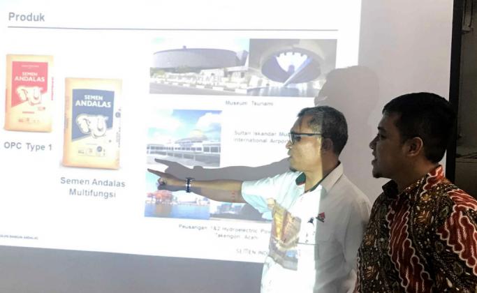 General Manager Lhoknga Plant PT Solusi Bangun Andalas, Durain Parmanoan (kiri) didampingi General Manager of Corporate Communication Semen Indonesia Sigit Wahono (kanan) menyampaikan materi kepada jurnalis Aceh tentang pemasaran produk Semen Andalas yang diproduksi oleh PT Solusi Bangun Andalas di Lhoknga Aceh, Selasa (20/3/2019). PT Semen Indonesia (Persero) Tbk melalui anak usahanya PT Semen Indonesia Industri Bangunan (SIIB) telah resmi mengakuisisi 80,6% kepemilikan saham Holderfin B.V yang ditempatkan di PT Holcim Indonesia Tbk pada tanggal tanggal 31 Januari 2019. AKTUAL/Dok Semen Indonesia