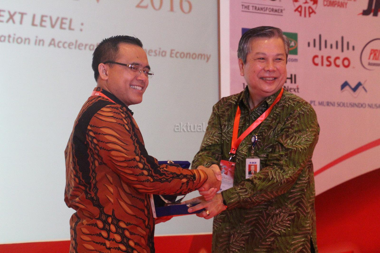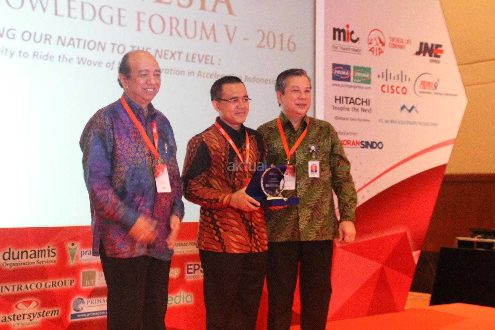 Komisaris Independen BCA sekaligus Pembina BCA Learning Service, Cyrillus Harinowo (kiri) dan Direktur Independen, Erwan yuris Ang (kanan) berfoto bersama usai menyerahkan apresiasi dan cinderamata kepada Bupati Banyuwangi,Abdullah Azwar Anas (tengah) saat menjadi pembicara dalam salah satu sesi seminar di Indonesia Knowledge Forum V 2016 di Jakarta, Jumat (7/10). Bupati Banyuwangi itu mengisi sesi Human Capital & Leadership IKF 2016 dengan menyampaikan materi bertema "Strong Leader to Enhance Regional Economic. Aktual/Eko S Hilman
