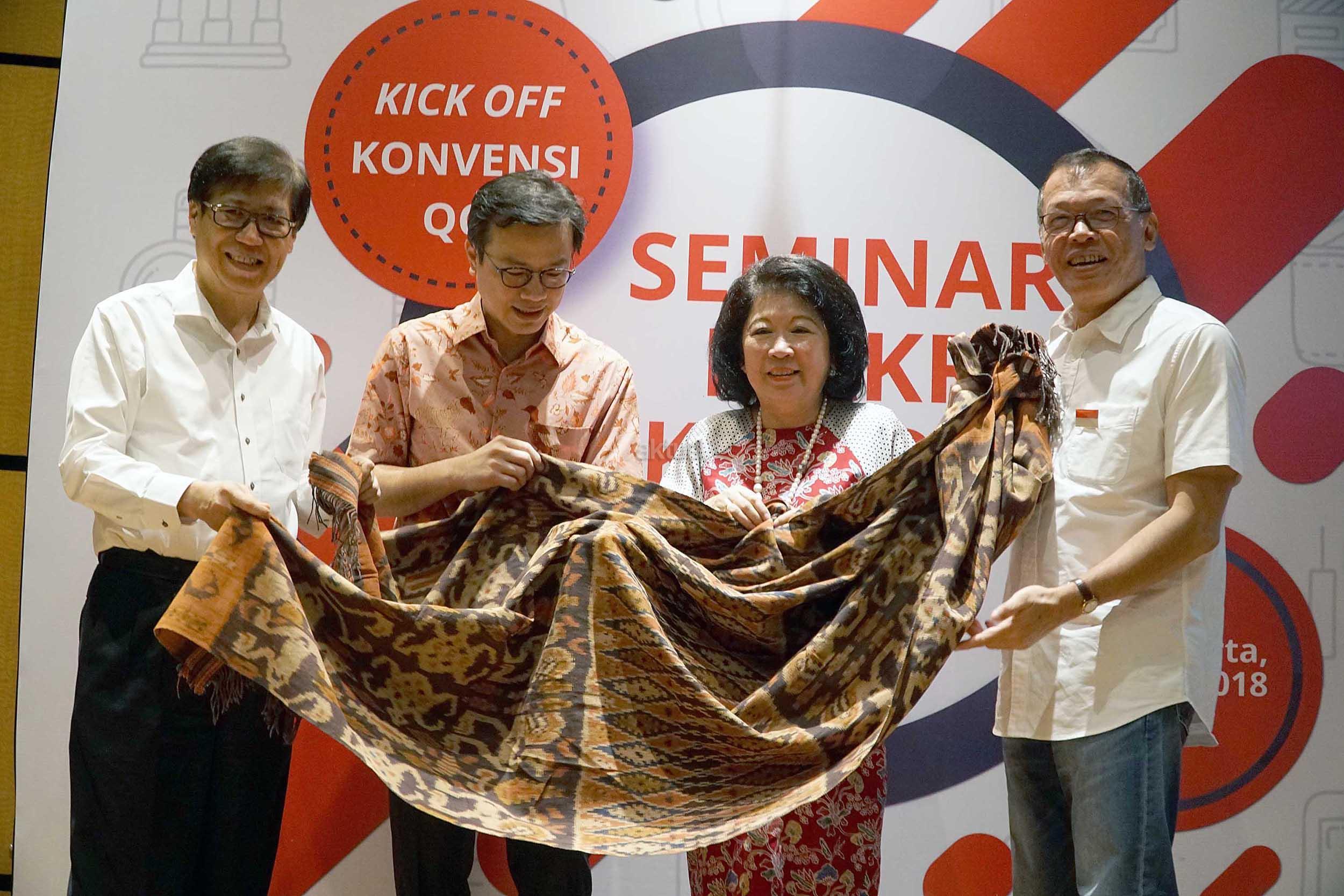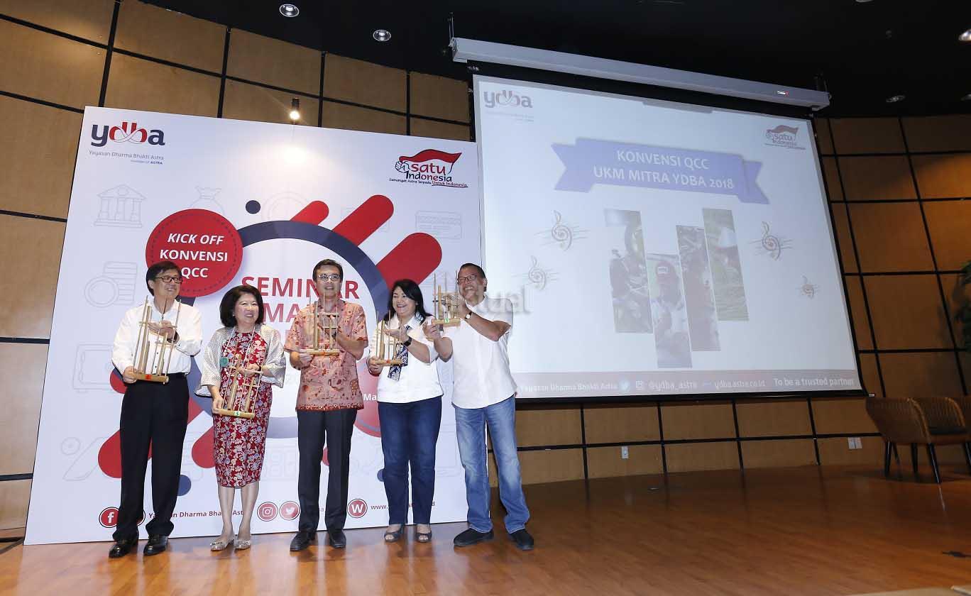 [Ki-Ka] Direktur PT Astra International Tbk sekaligus Ketua Pembina Yayasan Dharma Bhakti Astra (YDBA) Johannes Loman, Pembicara Seminar Makro Ekonomi untuk UKM sekaligus Penasehat YDBA Mari Elka Pangestu, Pembicara Seminar Makro Ekonomi sekaligus Finance and Funding Director Bank Tabungan Pensiunan Nasional (BTPN) Arief Harris Tanjung, Sekretaris Pengurus YDBA Ida R.M. Sigalingging dan Ketua PEngurus YDBA Henry C. Widjaja melakukan prosesi Kick Off Konvensi Quality Control Circle (QCC) UKM seusai Seminar Makro Ekonomi yang diselenggarakan YDBA di Gedung PT Astra International Tbk, Jakarta, Kamis (8/3). AKTUAL/Eko S Hilman