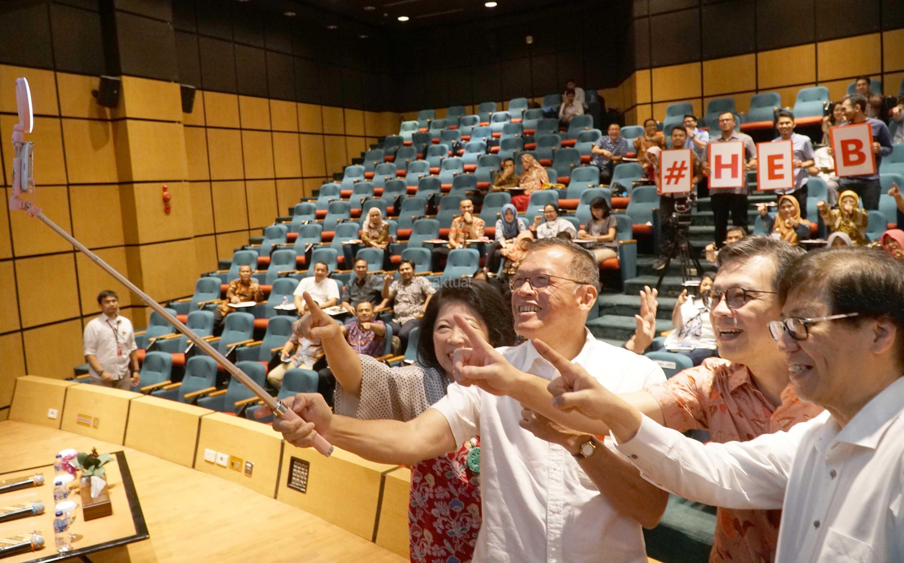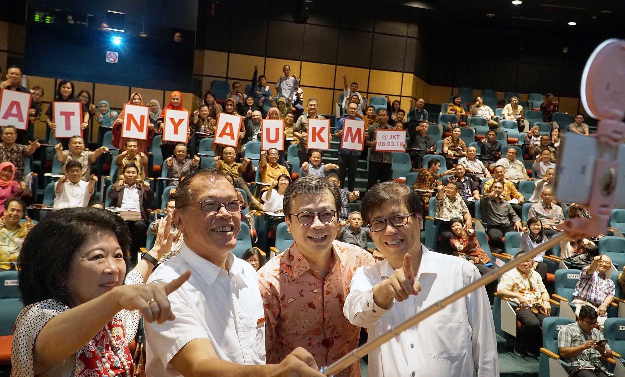 (dari kiri ke kanan), Pembicara Seminar Makro Ekonomi untuk UKM sekaligus Penasehat Yayasan Dharma Bhakti Astra (YDBA), Mari Elka Pangestu,Ketua Pengurus YDBA, Henry C. Widjaja,Pembicara Seminar Makro Ekonomi untuk UKM sekaligus Direktur Finance and Funding Bank Tabungan Pensiunan Nasional (BTPN), Arief Harris Tanjung serta Direktur PT Astra International Tbk sekaligus Ketua Pembina YDBA, Johannes Loman melakukan foto selfie disela Seminar Makro Ekonomi untuk UKM dan Prosesi Kick Off Konvensi Quality Control Circle (QCC) yang diselenggarakan Yayasan Dharma Bhakti Astra (YDBA) di jakarta, Kamis (8/3).Hingga Desember 2017, YDBA telah memberikan pembinaan kepada 10.374 UKM. AKTUAL/Eko S Hilman