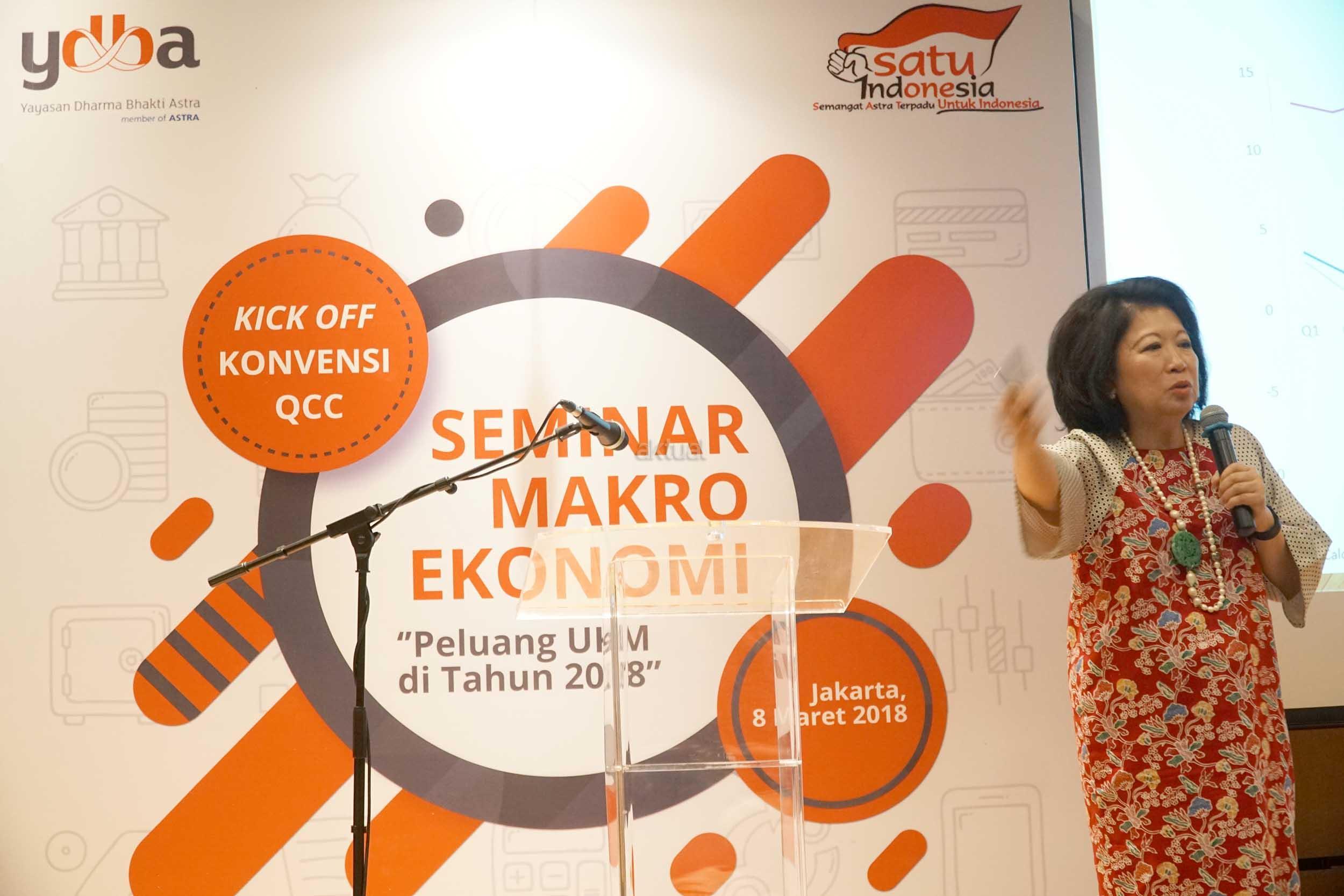 Mari Elka Pangestu menyampaikan kondisi makro ekonomi serta 2018 serta peluangnya di acara Seminar Makro Ekonomi untuk UKM yang diselenggarakan Yayasan Dharma Bhakti Astra (YDBA) di Gedung PT Astra International Tbk, Jakarta , Kamis (8/3). AKTUAL/Eko S Hilman