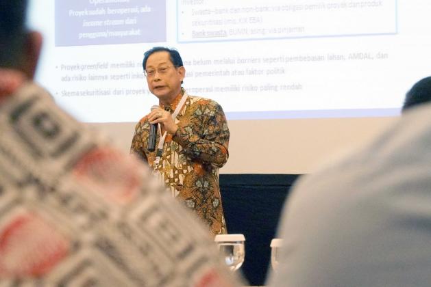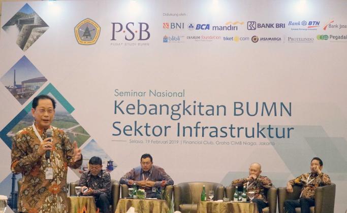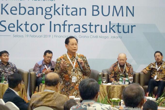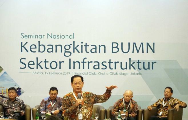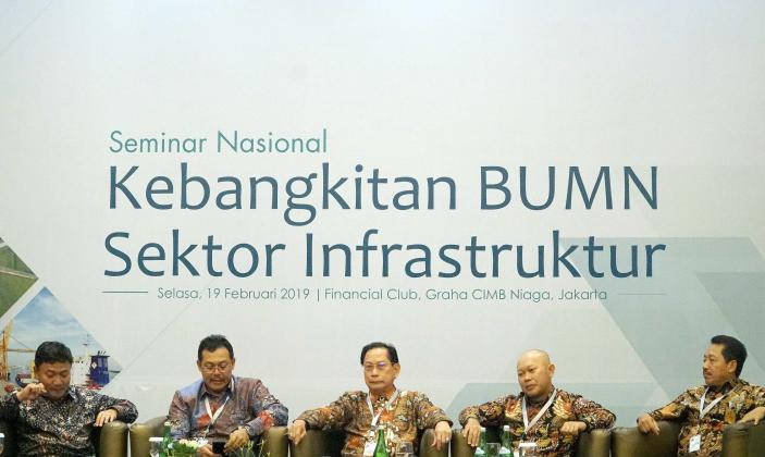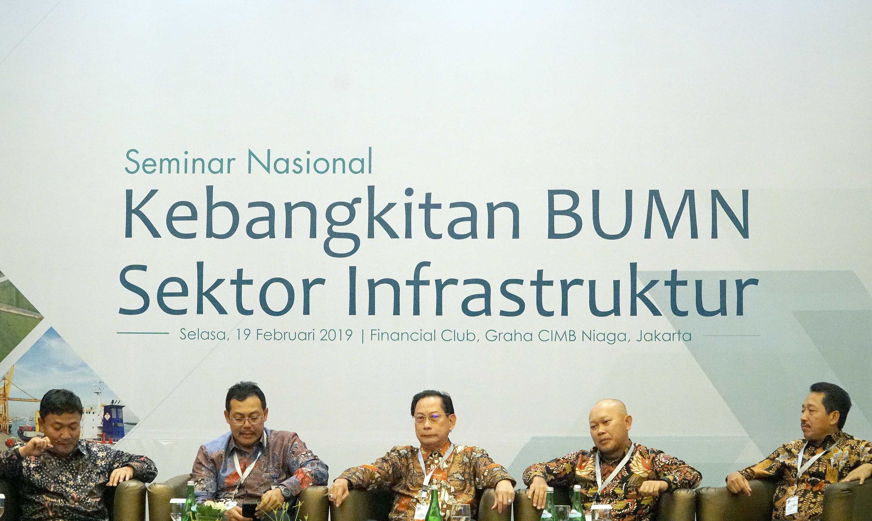 Presiden Direktur BCA Jahja Setiaatmadja (tengah) bersama (kiri ke kanan) Direkur Manajemen Risiko BNI Bob Tyasika Ananta, Senior Vice President Corporate Banking Bank Mandiri Yusak L.S. Silalahi, Direktur Pengembangan Proyek PT Sarana Multi Infrastruktur Darwin Trisna Djajawinata dan Executive Vice President BRI I Made Suka di tengah acara Seminar Nasional Kebangkitan BUMN Sektor Infrastruktur di Jakarta, Selasa (19/2). Pusat Studi BUMN bekerjasama dengan BCA dan pihak lainnya menggelar Seminar Nasional Kebangkitan BUMN Sektor Infrastruktur. Menjadi salah satu pembicara, Jahja Setiaatmadja mengangkat topik ‘Kontribusi Perbankan dalam Akselerasi Sektor Infrastruktur’ dalam seminar yang berlangsung. AKTUAL/STR-Eko S Hilman