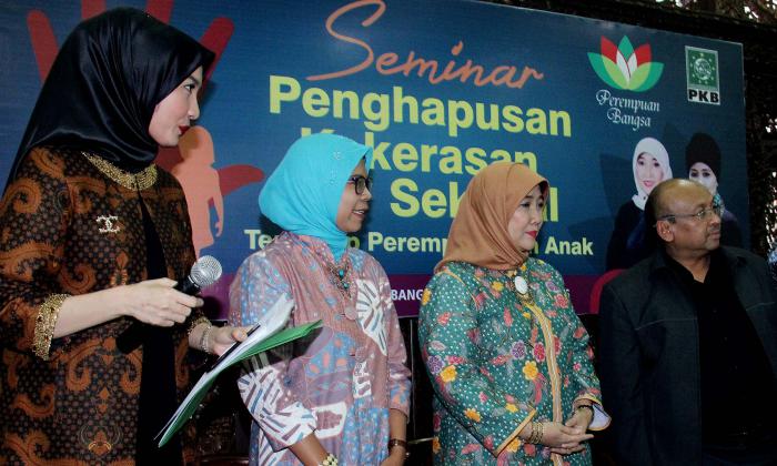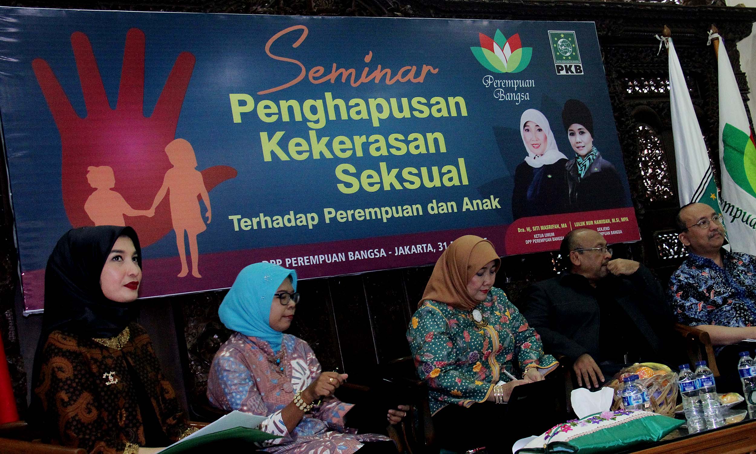 Kiri-kanan; Ketua DPP Perempuan Bangsa Siti Masrifah, Anggota Komisi VIII DPR RI Arzeti Bilbina, Komisioner Komnas Perempuan Riri Khairuroh, Direktorat Rehabilitasi Sosial Anak Kementerian Sosial Edi SUharso, dan Direktorat Perlindungan Anak Kementerian Pemberdayaan Perempuan dan Perlindungan Anak Pri Budiarta Nur menggelar seminar penghapusan kekerasan seksual terhadap perempuan dan anak di Kantor DPP PPKB, Jakarta, Selasa (31/5). Seminar tersebut bertujuan sebagai upaya advokasi dari aspek regulasi pentingnya peraturan perundang - undangan yang mampu menghapus kekerasan seksual.