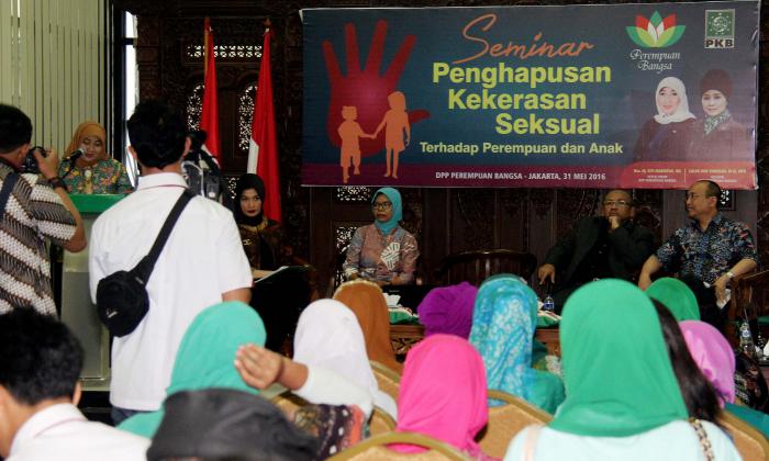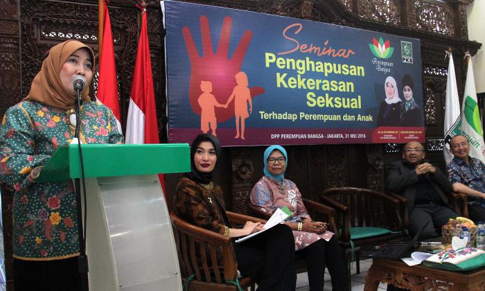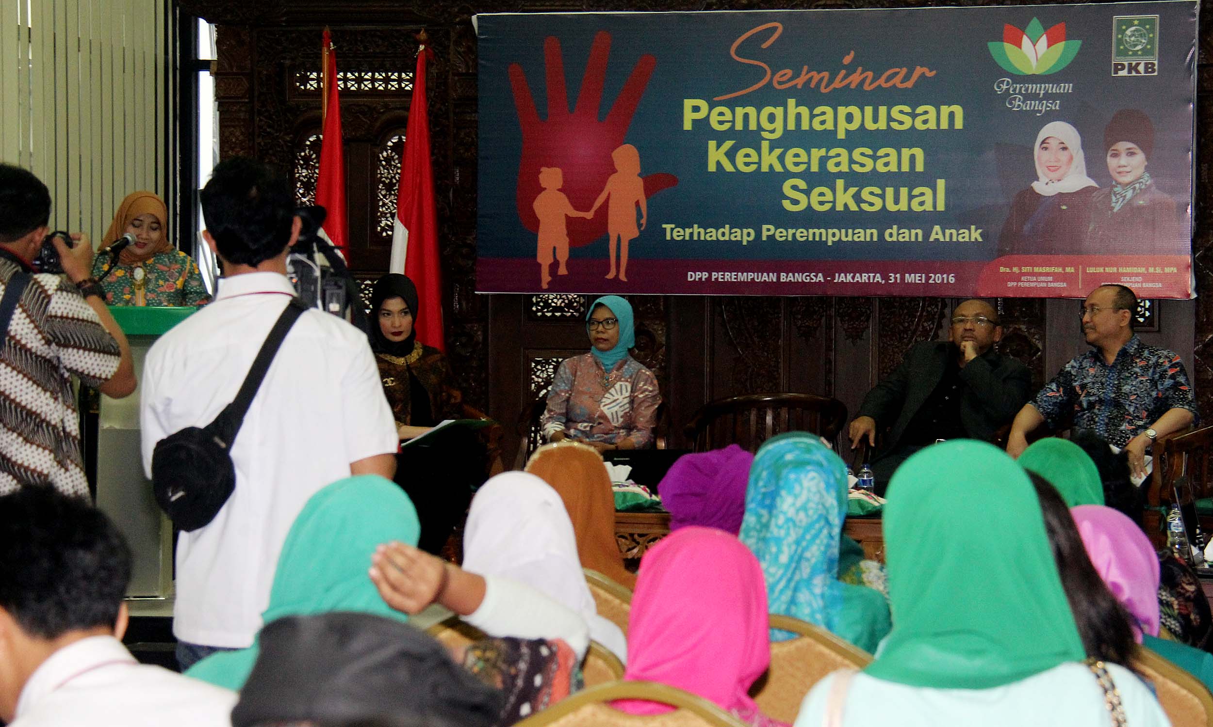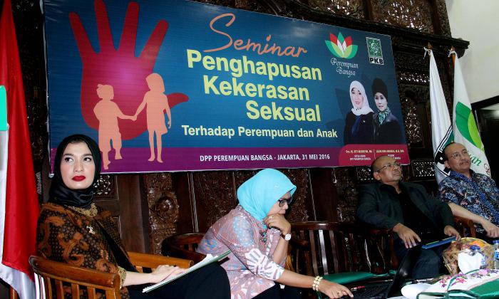 Kiri-kanan ; Anggota Komisi VIII DPR RI Arzeti Bilbina, Komisioner Komnas Perempuan Riri Khairuroh, Ketua DPP Perempuan Bangsa Siti Masrifah, Direktorat Rehabilitasi Sosial Anak Kementerian Sosial Edi SUharso, dan Direktorat Perlindungan Anak Kementerian Pemberdayaan Perempuan dan Perlindungan Anak Pri Budiarta Nur menggelar seminar penghapusan kekerasan seksual terhadap perempuan dan anak di Kantor DPP PPKB, Jakarta, Selasa (31/5/2016). Seminar tersebut bertujuan sebagai upaya advokasi dari aspek regulasi pentingnya peraturan perundang - undangan yang mampu menghapus kekerasan seksual.