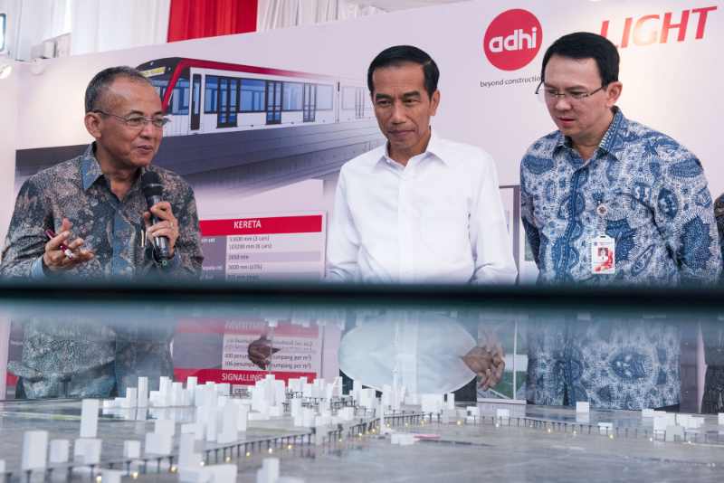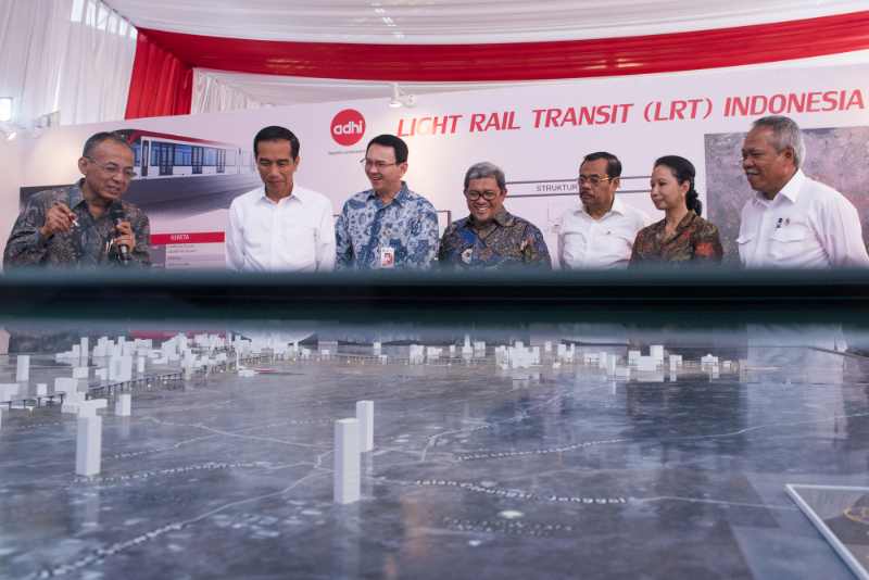 Presiden Joko Widodo (tengah) didampingi Gubernur DKI Jakarta Basuki Tjahaja Purnama (kanan) mendengarkan penjelasan maket proyek pembangunan Light Rail Transit (LRT) dari Direktur Utama Adhi Karya Kiswodarmawan (kiri) pada Groundbreaking Light Rail Transit (LRT) Indonesia di Jakarta, Rabu (9/9). LRT merupakan salah satu moda transportasi massal berbasis rel yang ramah lingkungan dan pembangunannya dilakukan secara elevated di atas tanah ruang milik jalan tol dan non tol serta direncanakan akan selesai pada tahun 2018. ANTARA FOTO/M Agung Rajasa