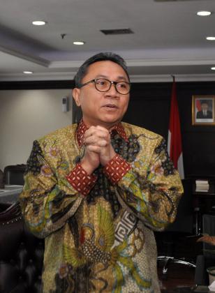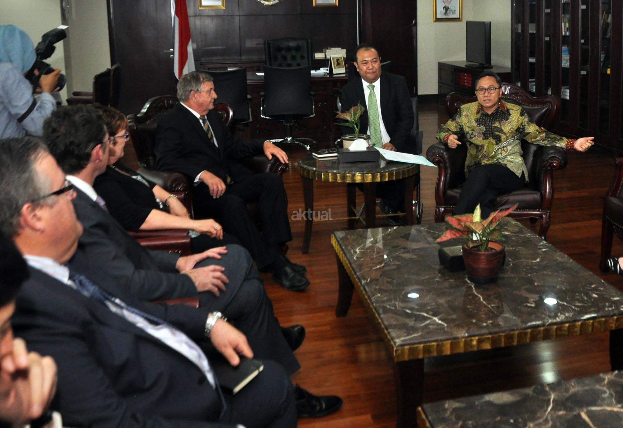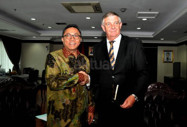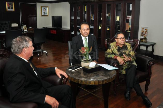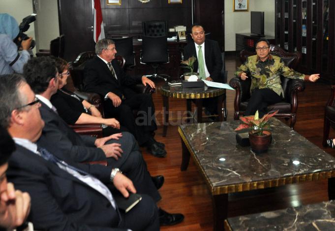 Ketua MPR RI Zulkifli Hasan (kanan), menjawab berbagai petanyaan wartawan disela pertemuan dengan delegasi angota Senator dan Parlemen Australia yang dipimpin oleh Senator Chris Back (kiri), di Gedung Parlemen, Senayan, Jakarta, Senin (28/9/2015). Pertemuan tersebut untuk menjalin kejasama antar parlemen.
