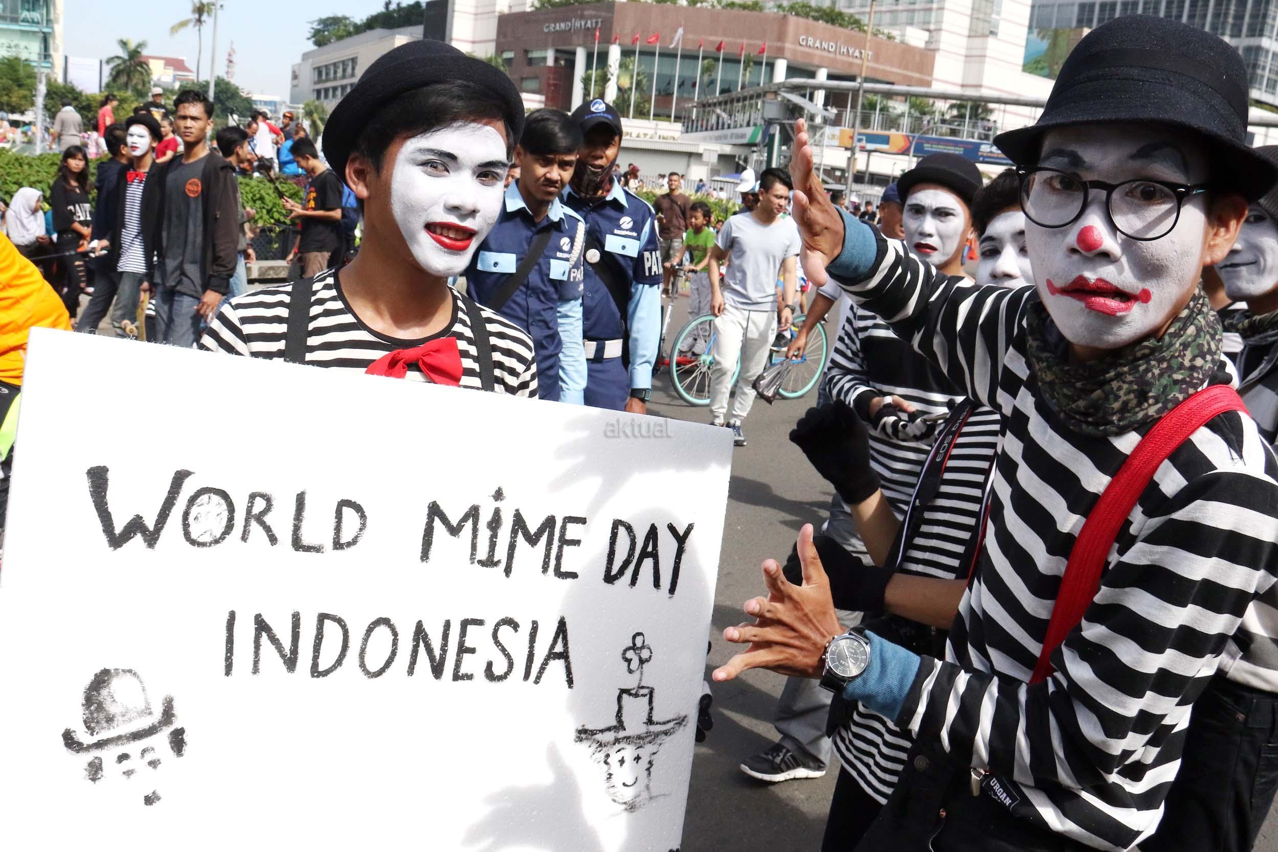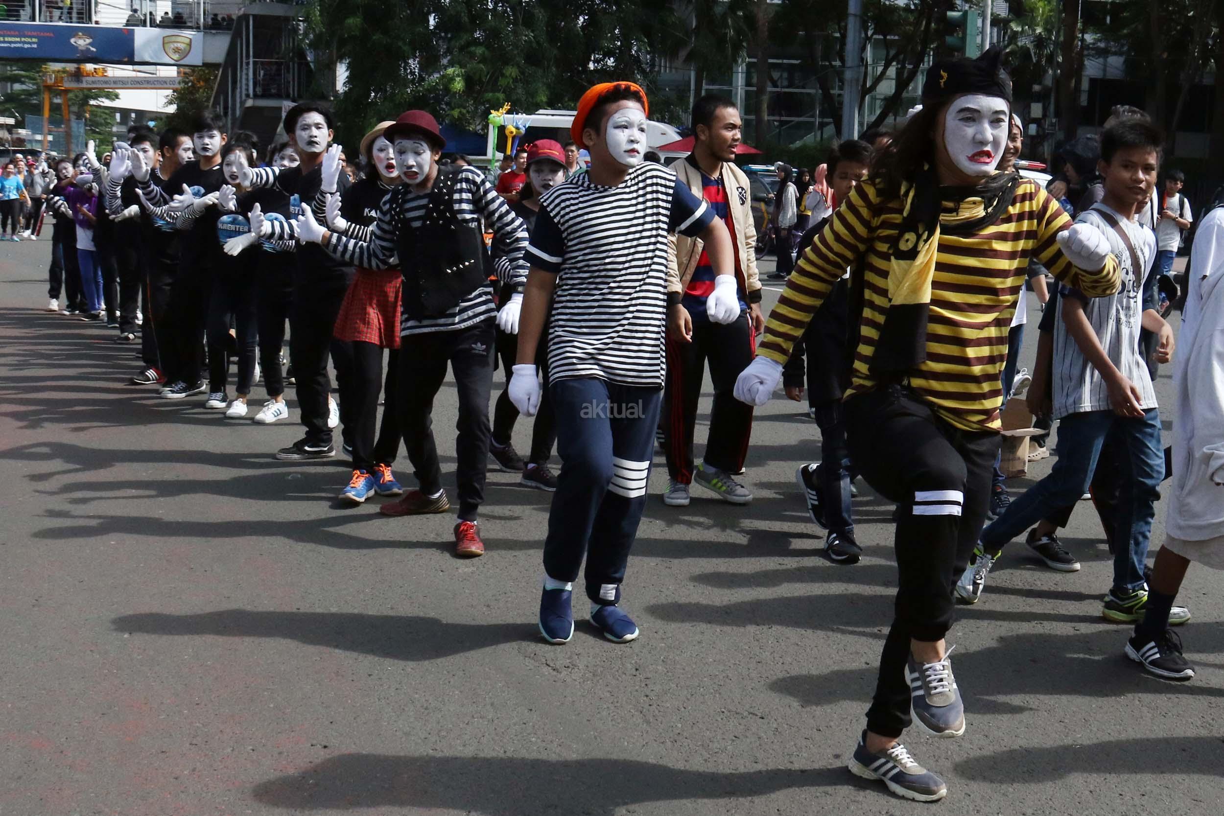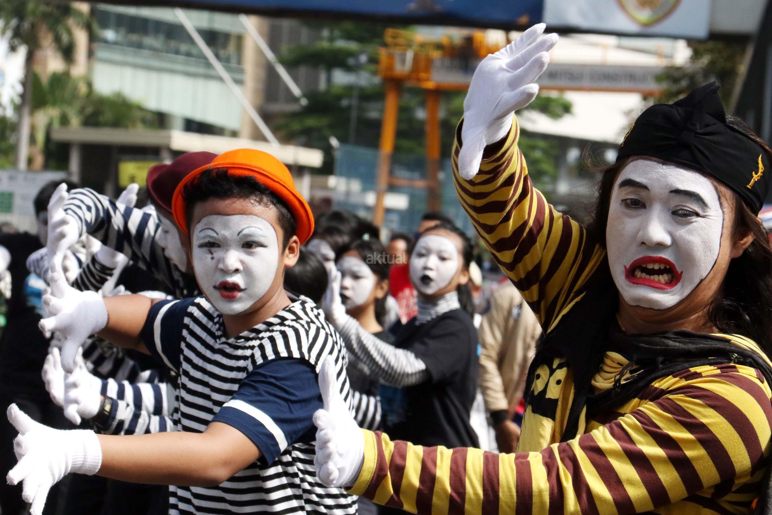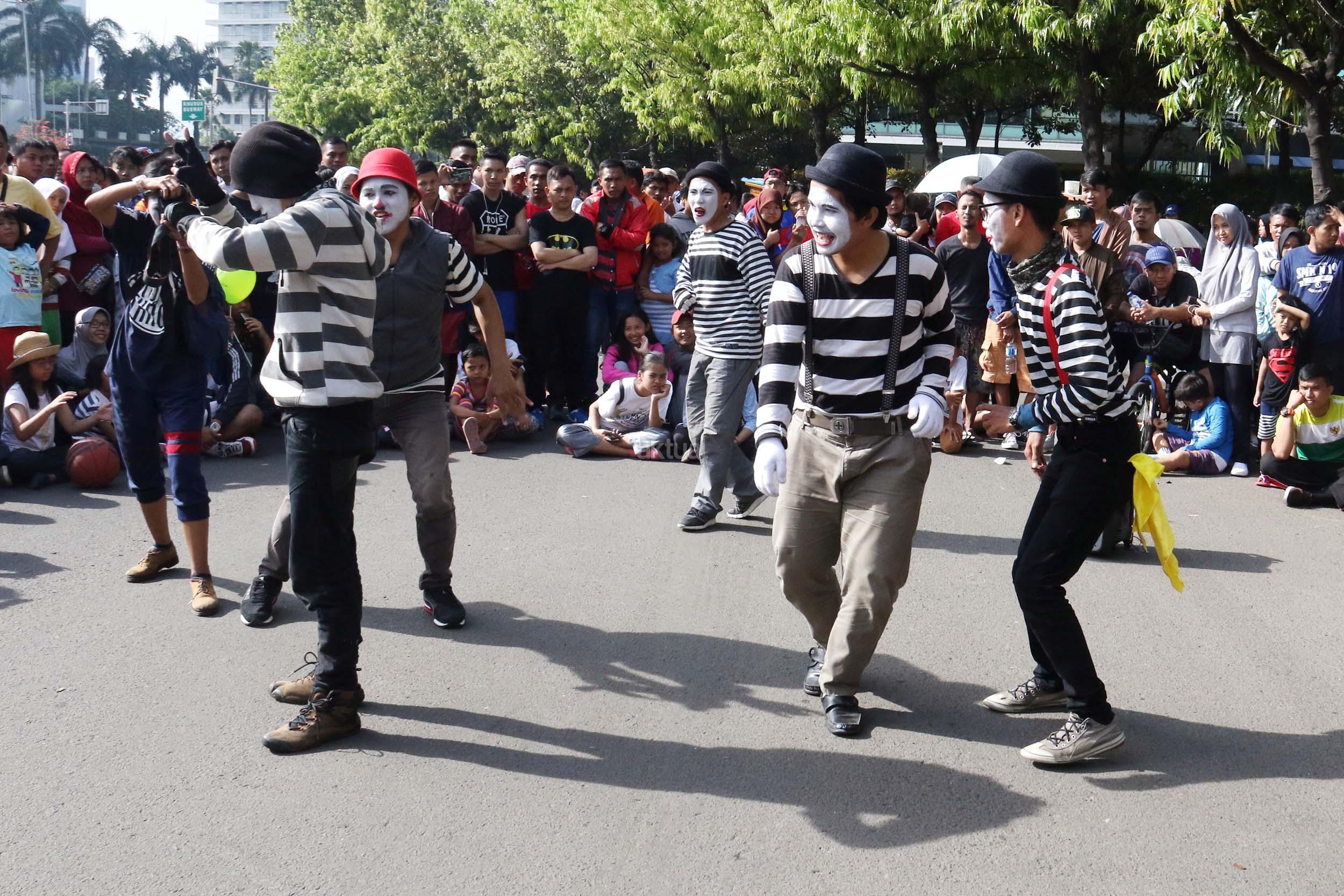 Sejumlah komunitas Pantomim saat beraksi di CFD, Jakarta, Minggu (19/3/2017). Aksi komunitas tersebut untuk memperingati World Mime Day 2017 yang jatuh setiap tanggal 22 Maret.