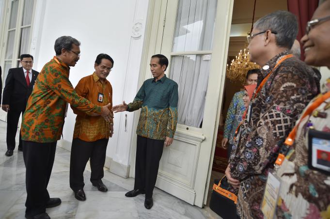 Presiden Joko Widodo berjabat tangan dengan Kepala BPS Suryamin (ketiga kiri) serta Deputi Bidang Statistik Distribusi dan Jasa BPS Sasmito Hadi Wibowo (kedua kiri) seusai pendataan Sensus Ekonomi untuk kediaman Presiden di Istana Merdeka, Jakarta, Rabu (25/5). Sebagai pemimpin sekaligus warga negara Indonesia, presiden wajib mengikuti sensus ekonomi yang bertujuan agar pemerintah dapat mengetahui karakteristik ekonomi di masing-masing wilayah, pendataan ditujukan kepada seluruh pelaku ekonomi seperti rumah tangga, perusahaan, rumah sakit, perdagangan, hotel, restoran, sekolah, panti sosial, pasar hingga tempat peribadatan. ANTARA FOTO/Yudhi Mahatma/kye/16
