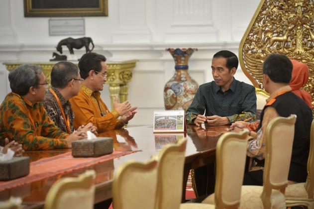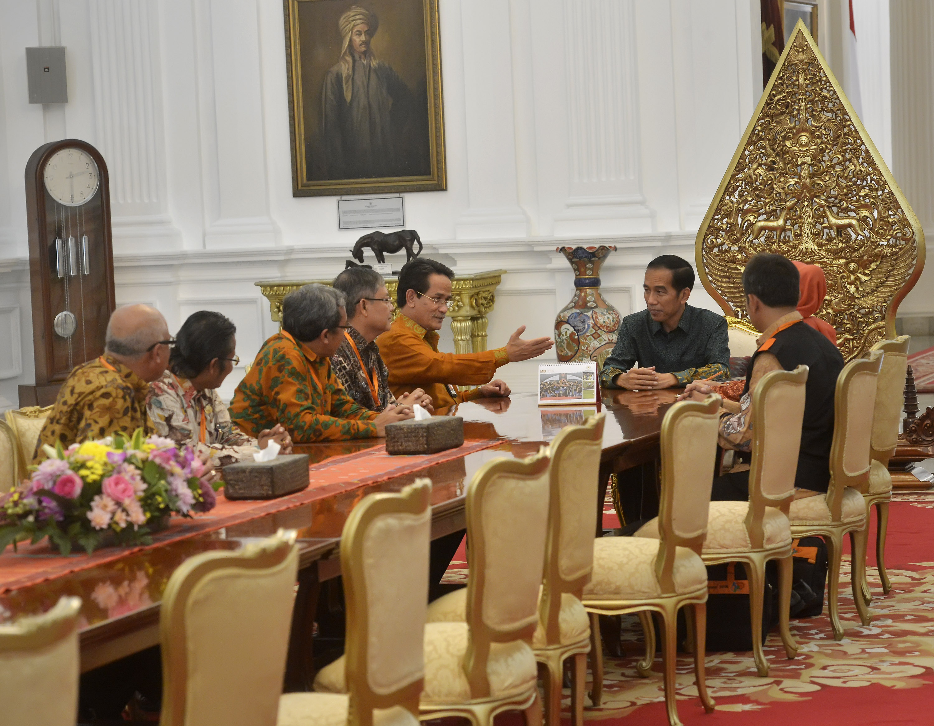 Presiden Joko Widodo berdialog dengan Kepala BPS Suryamin (kelima kiri) serta Deputi Bidang Statistik Distribusi dan Jasa BPS Sasmito Hadi Wibowo (ketiga kiri) saat pendataan Sensus Ekonomi untuk kediaman Presiden di Istana Merdeka, Jakarta, Rabu (25/5). Sebagai pemimpin sekaligus warga negara Indonesia, presiden wajib mengikuti sensus ekonomi yang bertujuan agar pemerintah dapat mengetahui karakteristik ekonomi di masing-masing wilayah, pendataan ditujukan kepada seluruh pelaku ekonomi seperti rumah tangga, perusahaan, rumah sakit, perdagangan, hotel, restoran, sekolah, panti sosial, pasar hingga tempat peribadatan. ANTARA FOTO/Yudhi Mahatma/kye/16