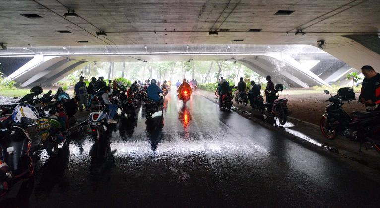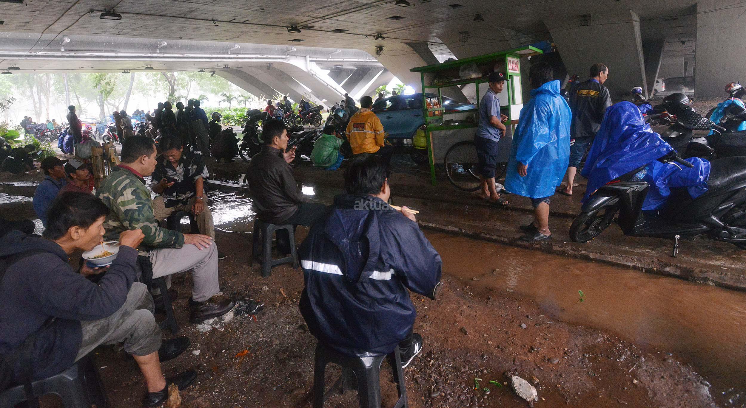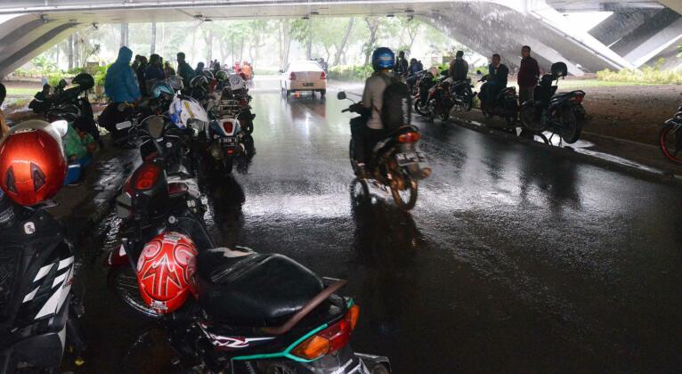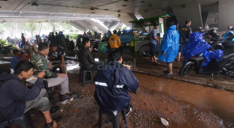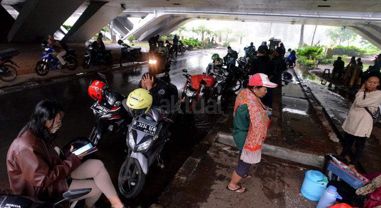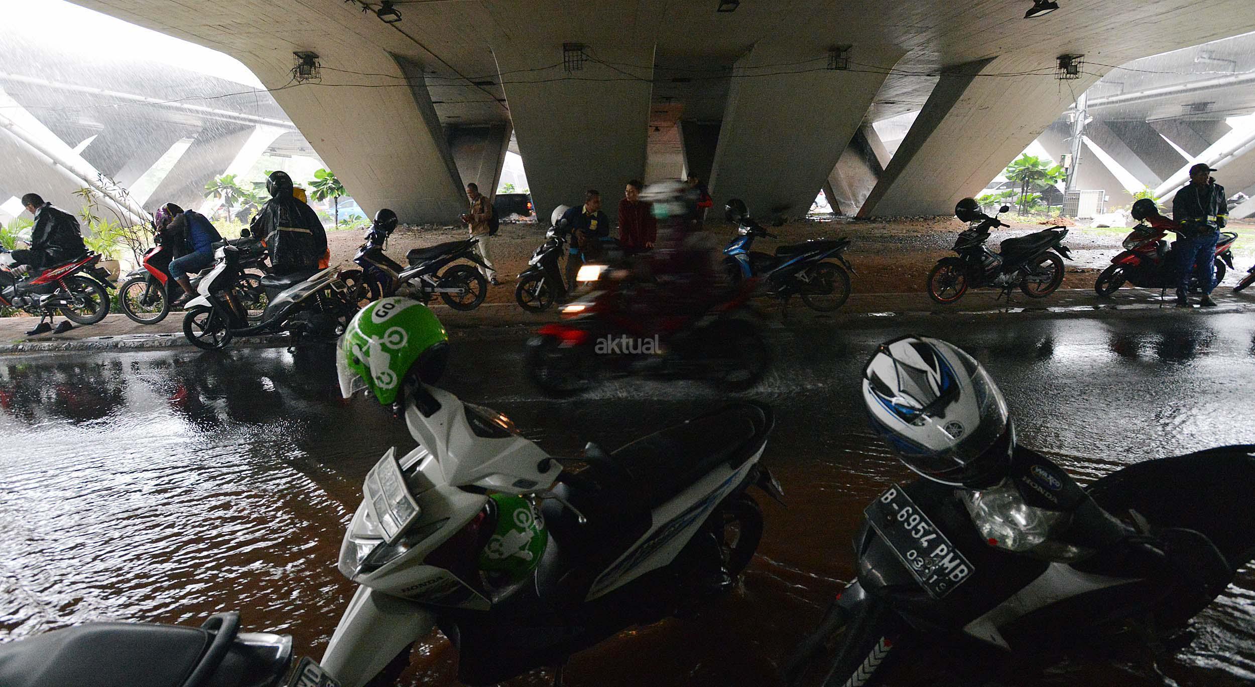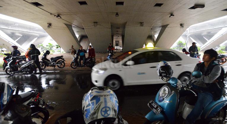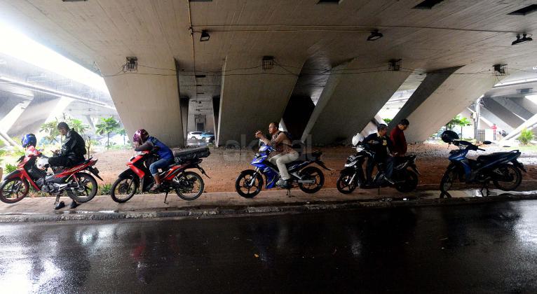 Terlihat pengendara saat berteduh dibawah kolong fly over, Jembatan Semanggi, Jakarta, Rabu (13/1/2016). Sebelumnya Polda Metro Jaya bakal menilang setiap pengendara motor yang berteduh di bawah jembatan saat hujan tiba hingga membuat macet lalu lintas. Tak hanya menilang, denda sebesar Rp 250 ribu pun akan diberikan bagi pengendara motor yang nekat menunggu hujan reda di bawah jembatan fly over. Meskipun begitu, aparat polisi masih memaklumi bila pengendara motor hanya menumpang memakai jas hujan di bawah jembatan fly over, asalkan tidak mengganggu lalu lintas.