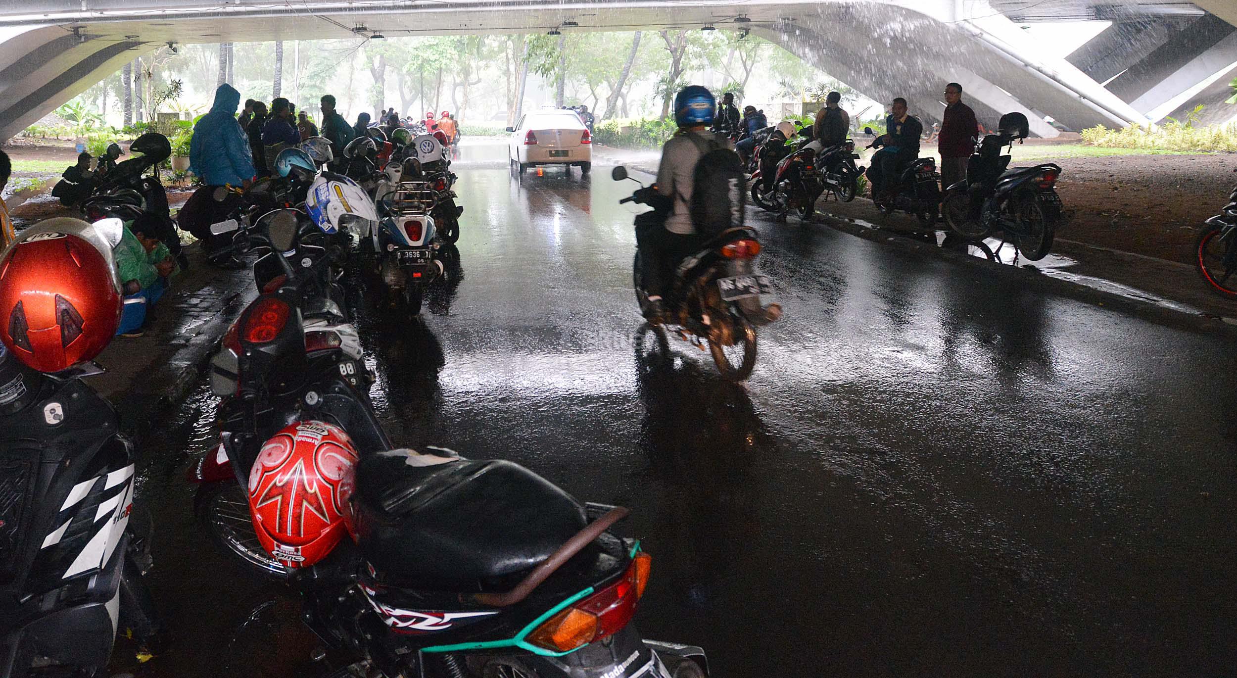 Para pengendara bermotor roda dua berterduh saat hujan dibawah kolong fly over, jembatan Semanggi, Jakarta, Rabu (13/1/2016). Sebelumnya Polda Metro Jaya bakal menilang setiap pengendara motor yang berteduh di bawah jembatan saat hujan tiba hingga membuat macet lalu lintas. Tak hanya menilang, denda sebesar Rp 250 ribu pun akan diberikan bagi pengendara motor yang nekat menunggu hujan reda di bawah jembatan fly over. Meskipun begitu, aparat polisi masih memaklumi bila pengendara motor hanya menumpang memakai jas hujan di bawah jembatan fly over, asalkan tidak mengganggu lalu lintas.