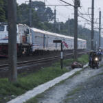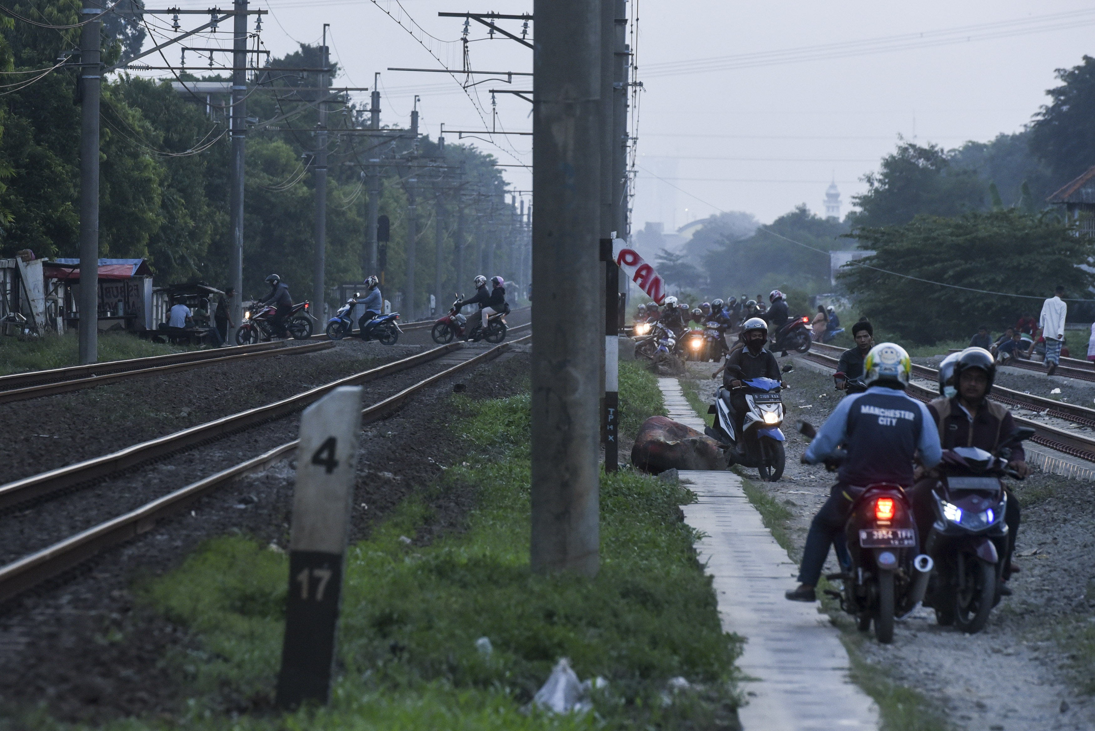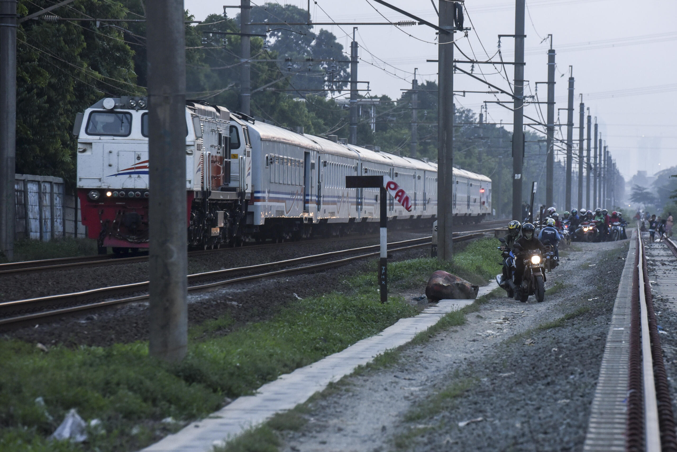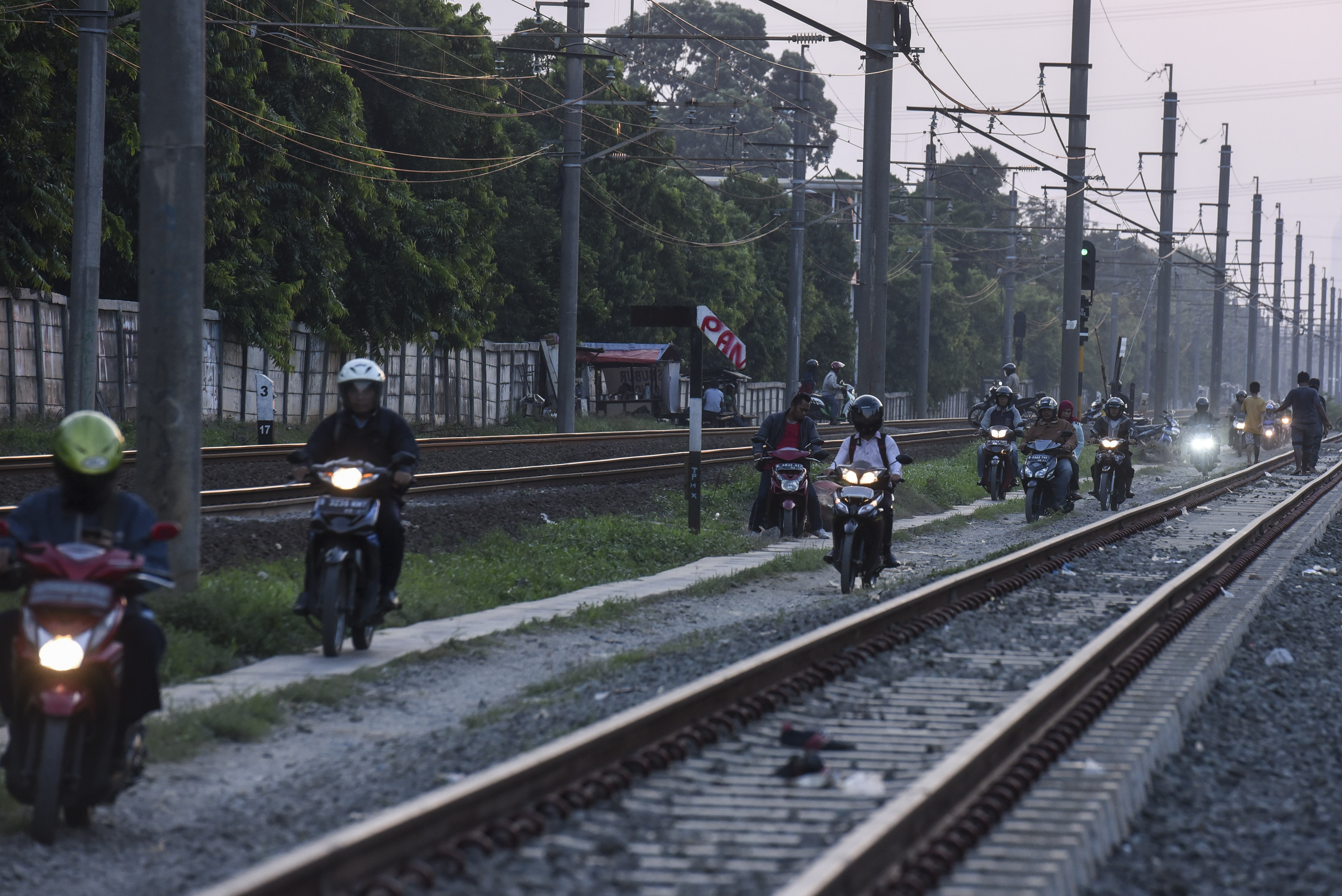 Pengendara motor melintas di dekat rel kereta api di Kawasan Buaran, Jakarta, Kamis (27/7). Demi menghindari kemacetan saat jam pulang kerja sejumlah pengendara motor nekat melintas di bukan tempat yang seharusnya dilintasi kendaraan. ANTARA FOTO/Hafidz Mubarak A./ama/16