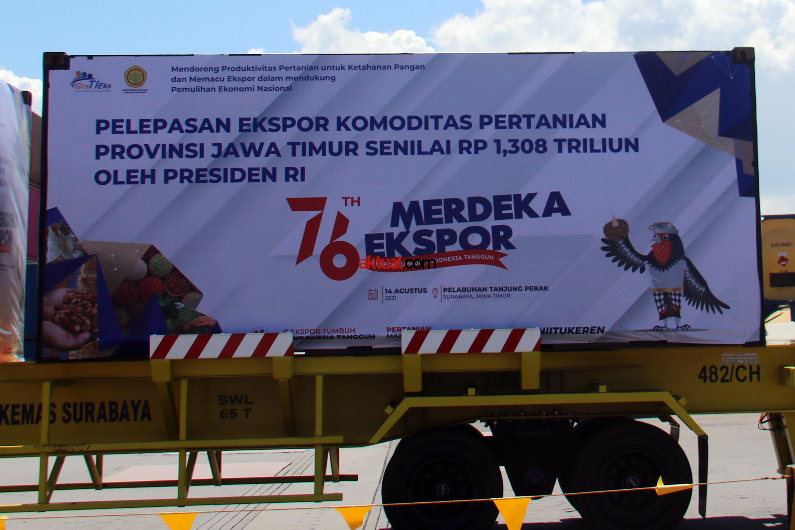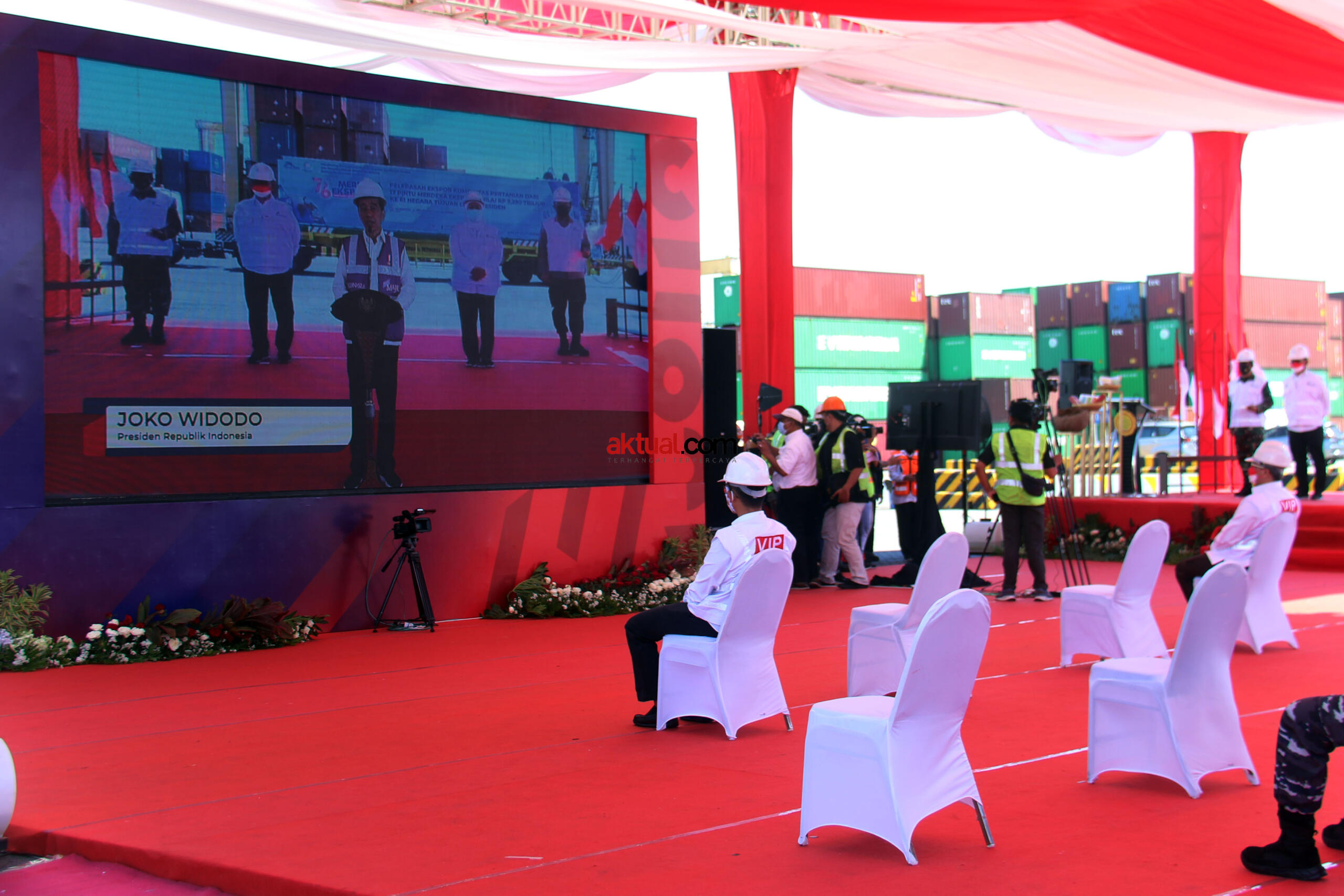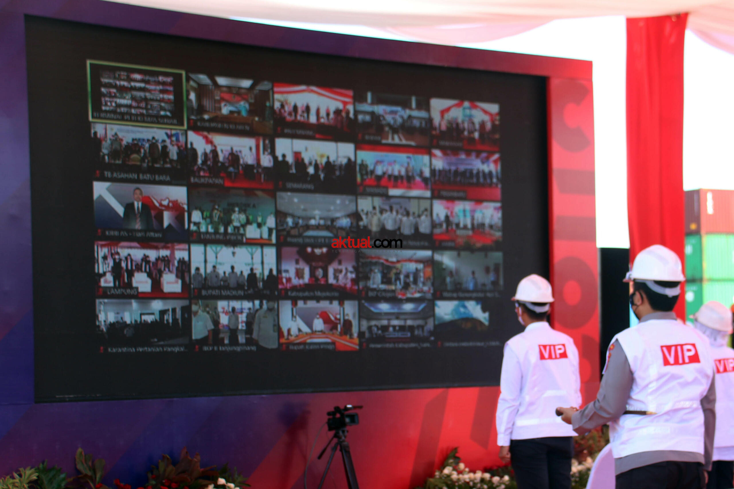 Seremoni pelepasan Merdeka Ekspor Pertanian oleh Presiden Joko Widodo, yang diikuti oleh jajaran kabinet juga kepala daerah secara virtual di Pelabuhan Tanjung Perak, Surabaya, pada Sabtu (14/8/2021). Kegiatan ini dilakukan secara serentak di sejumlah pelabuhan di Indonesia. (Foto: Aktual / Warnoto)