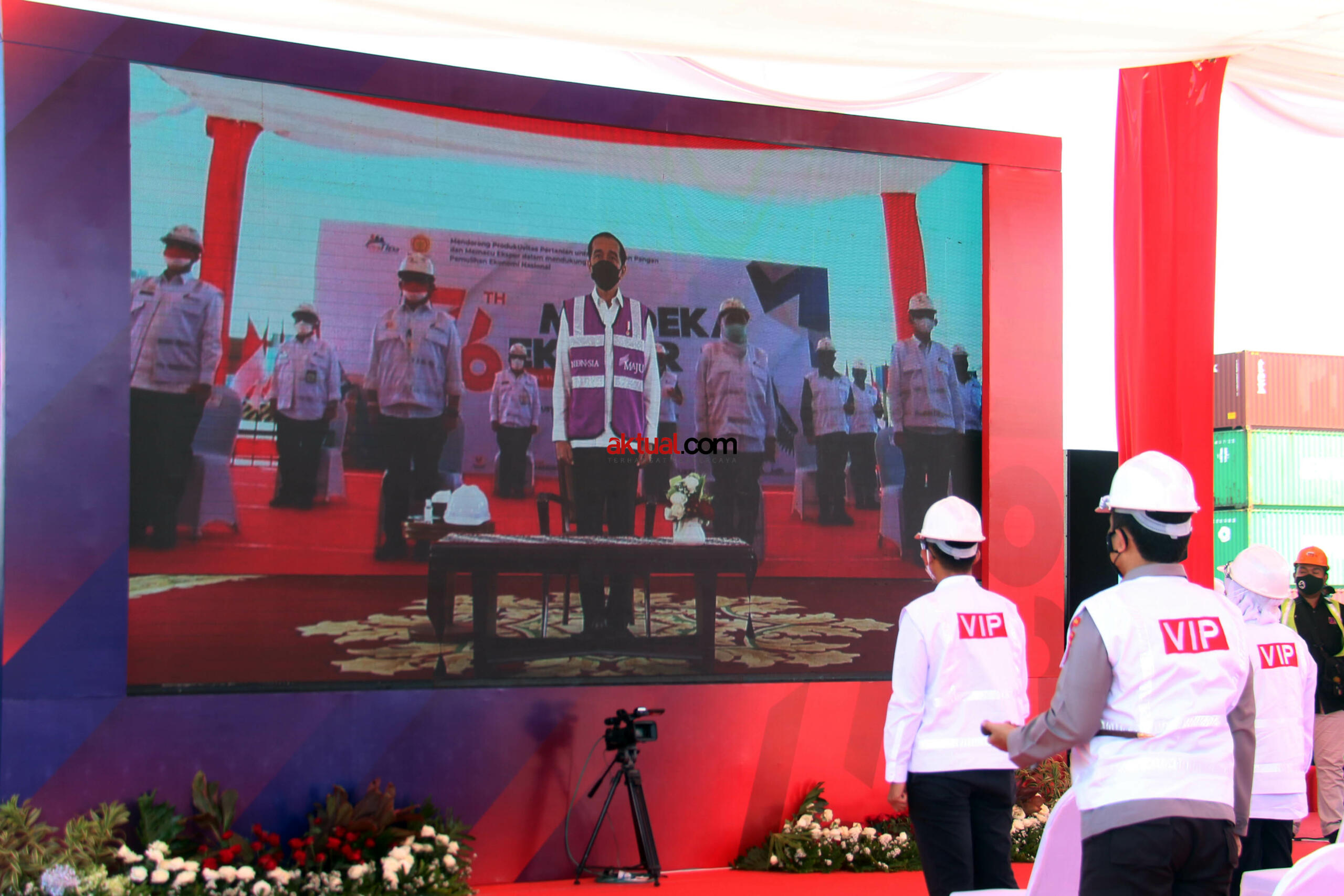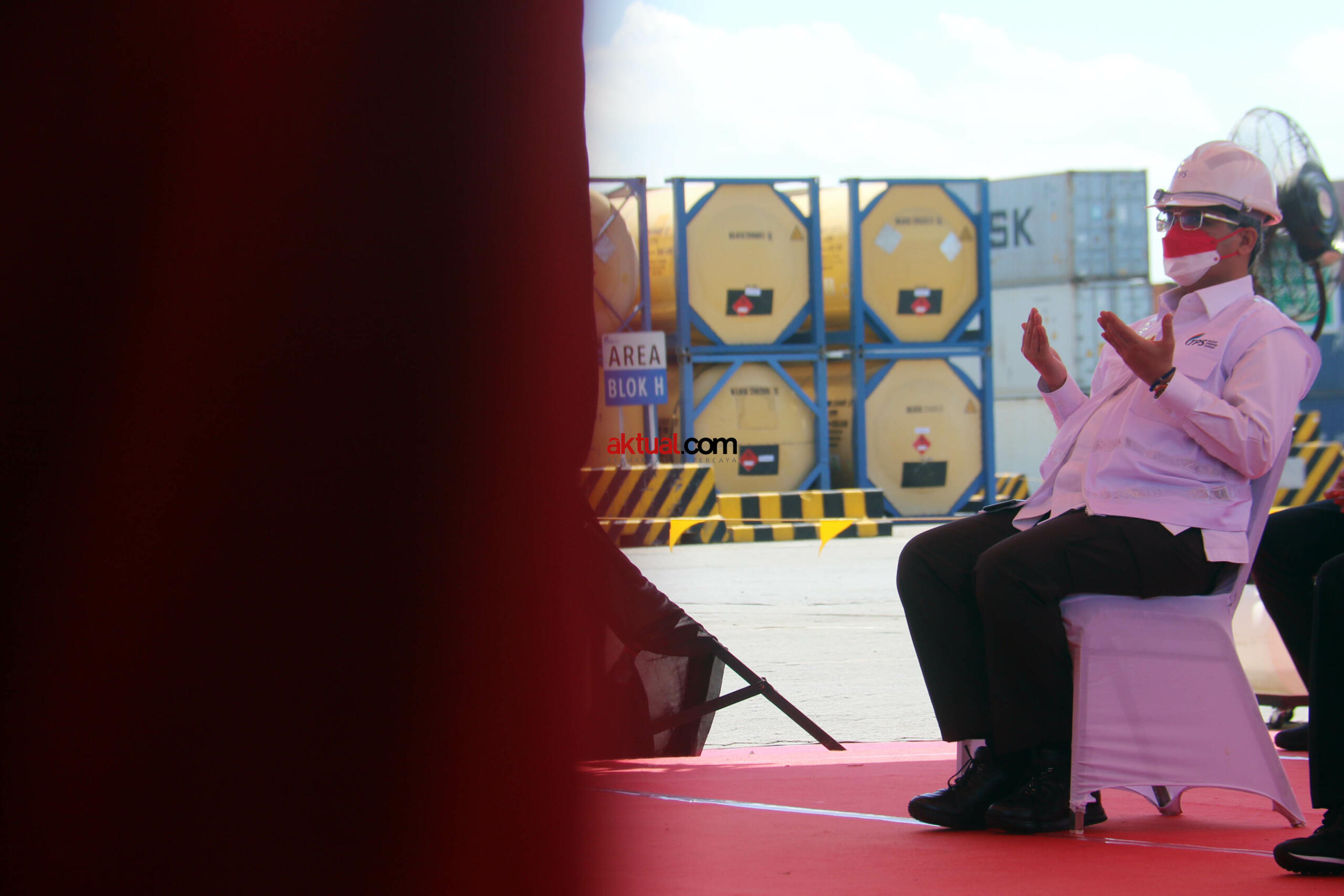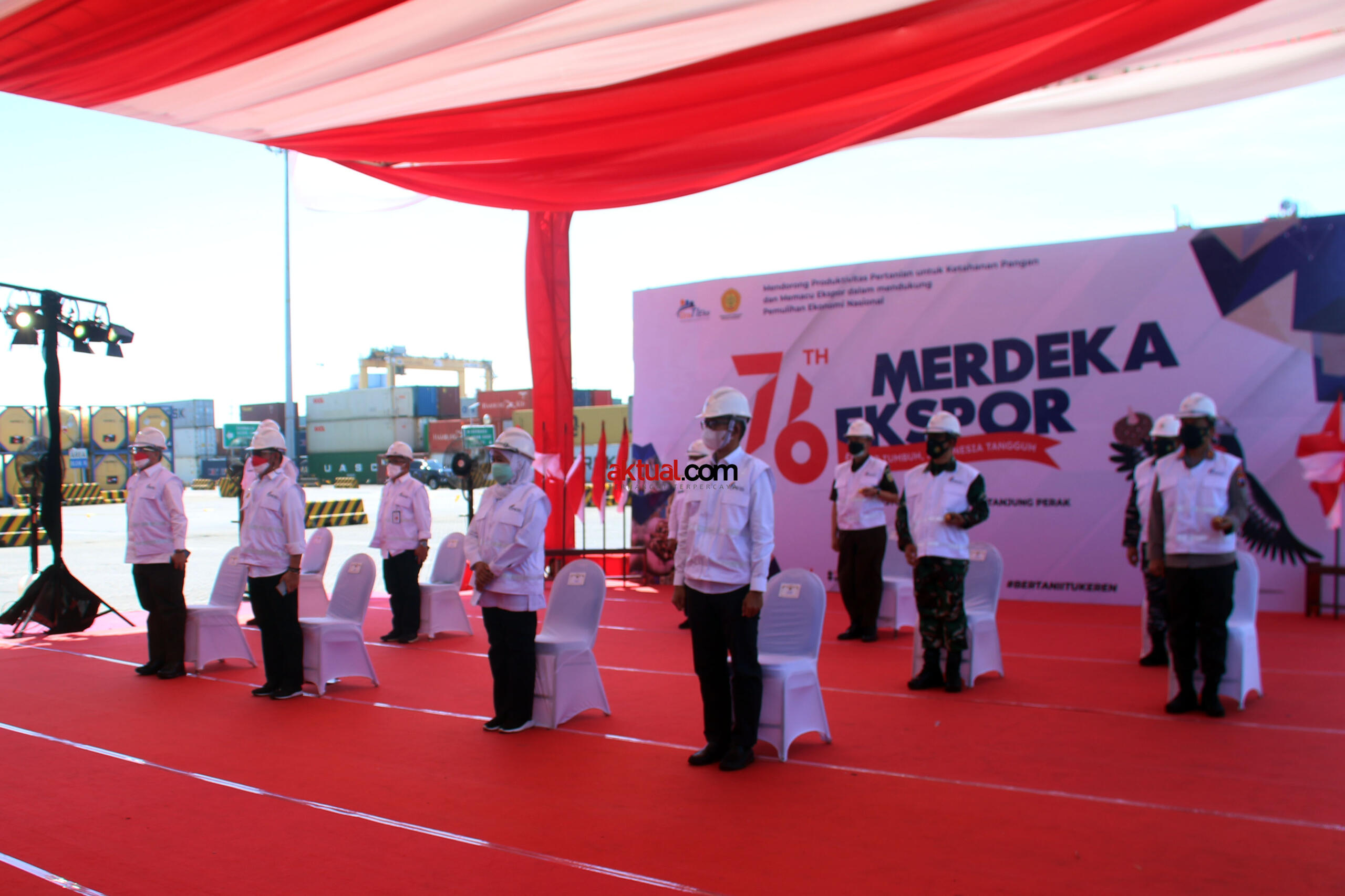 Seremoni pelepasan Merdeka Ekspor Pertanian oleh Presiden Joko Widodo, yang diikuti oleh jajaran kabinet juga kepala daerah secara virtual di Pelabuhan Tanjung Perak, Surabaya, pada Sabtu (14/8/2021). Kegiatan ini dilakukan secara serentak di sejumlah pelabuhan di Indonesia. (Foto: Aktual / Warnoto)