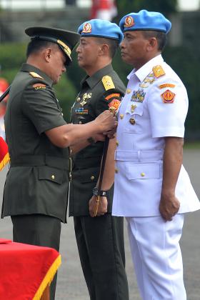 Panglima TNI Jenderal Gatot Nurmantyo (kiri) menyematkan tanda jabatan kepada pejabat baru Komandan Paspampres Brigjen TNI (Mar) Bambang Suswantono (kanan) disaksikan pejabat lama Komandan Paspampres Mayjen TNI Andika Perkasa (tengah) ketika Upacara Serah Terima Jabatan di Markas Komando Paspampres, Tanah Abang, Jakarta, Rabu (25/5). Brigjen TNI (Mar) Bambang Suswantono yang sebelumnya menjabat Wakil Komandan Paspampres menggantikan Mayjen TNI Andika Perkasa yang selanjutnya akan menjabat dan bertugas sebagai Panglima Kodam XII/Tanjung Pura. ANTARA FOTO/Widodo S. Jusuf/ama/16.