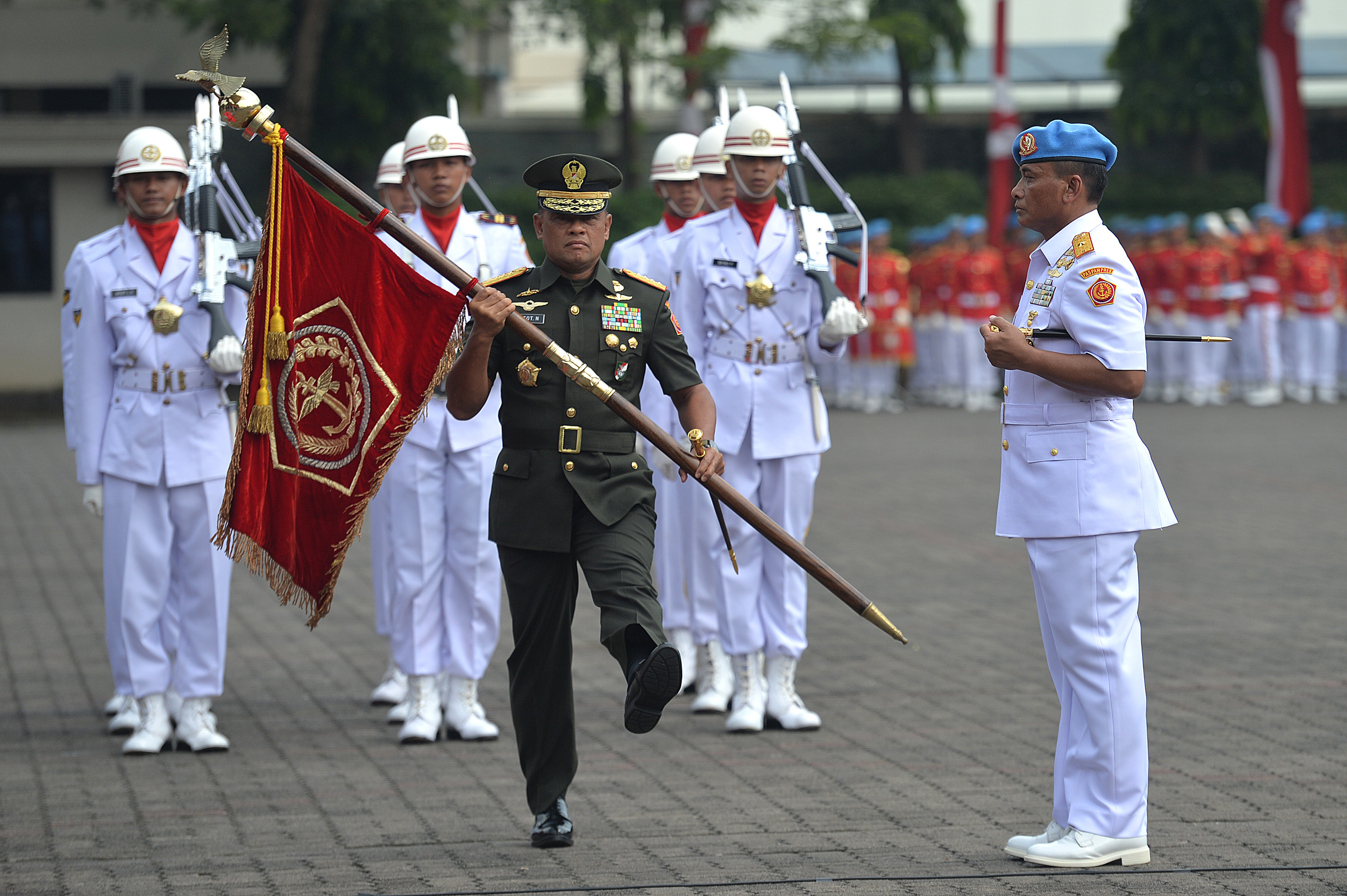 Panglima TNI Jenderal Gatot Nurmantyo (kiri) membawa Pataka Setia Waspada untuk diserahkan kepada Komandan Paspampres Brigjen TNI (Mar) Bambang Suswantono (kanan) ketika Upacara Serah Terima Jabatan di Markas Komando Paspampres, Tanah Abang, Jakarta, Rabu (25/5). Brigjen TNI (Mar) Bambang Suswantono yang sebelumnya menjabat Wakil Komandan Paspampres menggantikan Mayjen TNI Andika Perkasa yang selanjutnya akan menjabat dan bertugas sebagai Panglima Kodam XII/Tanjung Pura. ANTARA FOTO/Widodo S. Jusuf/ama/16.