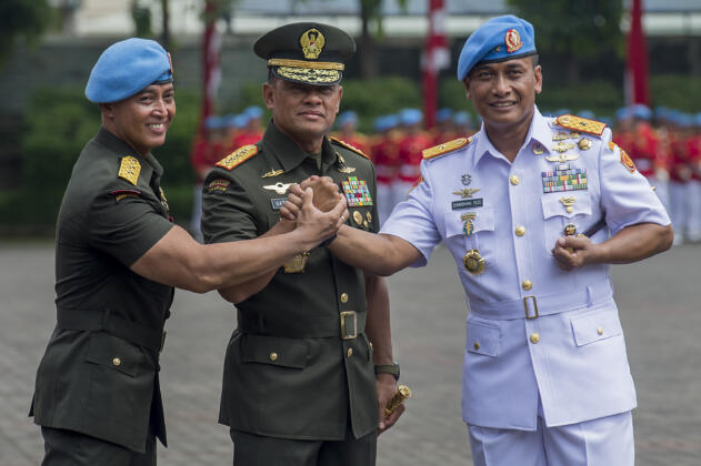 Panglima TNI Jenderal Gatot Nurmantyo (tengah) berjabat tangan komando dengan Komandan Paspampres Brigjen TNI (Mar) Bambang Suswantono (kanan) dan Mayjen TNI Andika Perkasa (kiri) usai Upacara Serah Terima Jabatan di Markas Komando Paspampres, Tanah Abang, Jakarta, Rabu (25/5). Brigjen TNI (Mar) Bambang Suswantono yang sebelumnya menjabat Wakil Komandan Paspampres menggantikan Mayjen TNI Andika Perkasa yang selanjutnya akan menjabat dan bertugas sebagai Panglima Kodam XII/Tanjung Pura. ANTARA FOTO/Widodo S. Jusuf/ama/16.