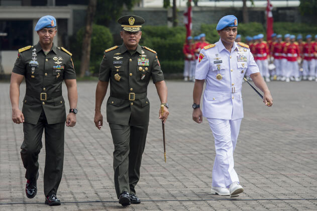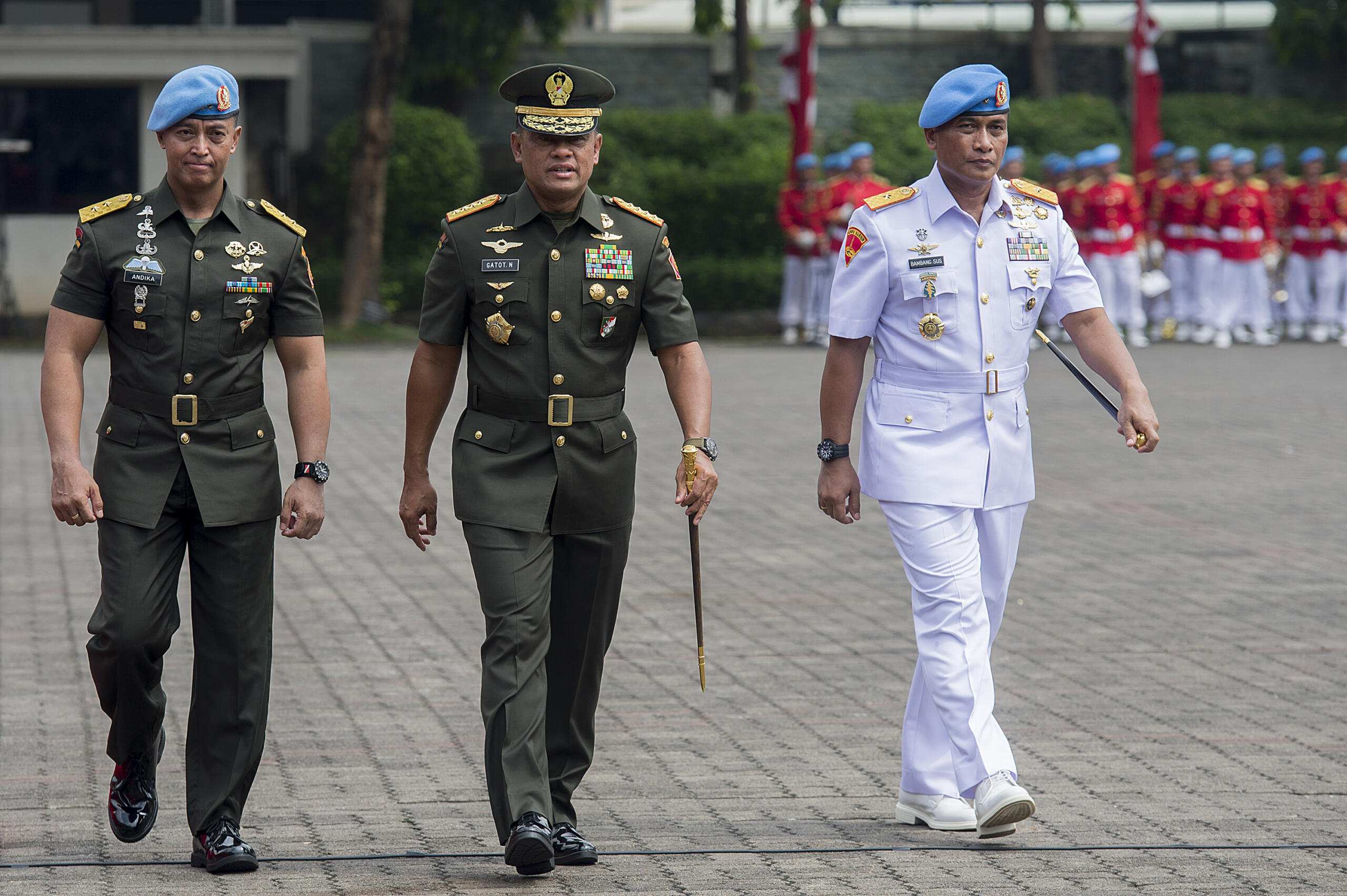 Panglima TNI Jenderal Gatot Nurmantyo (tengah) berjalan bersama Komandan Paspampres Brigjen TNI (Mar) Bambang Suswantono (kanan) dan Mayjen TNI Andika Perkasa (kiri) usai Upacara Serah Terima Jabatan di Markas Komando Paspampres, Tanah Abang, Jakarta, Rabu (25/5). Brigjen TNI (Mar) Bambang Suswantono yang sebelumnya menjabat Wakil Komandan Paspampres menggantikan Mayjen TNI Andika Perkasa yang selanjutnya akan menjabat dan bertugas sebagai Panglima Kodam XII/Tanjung Pura. ANTARA FOTO/Widodo S. Jusuf/ama/16.