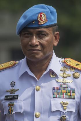 Komandan Paspampres Brigjen TNI (Mar) Bambang Suswantono mengikuti Upacara Serah Terima Jabatan di Markas Komando Paspampres, Tanah Abang, Jakarta, Rabu (25/5). Brigjen TNI (Mar) Bambang Suswantono yang sebelumnya menjabat Wakil Komandan Paspampres menggantikan Mayjen TNI Andika Perkasa yang selanjutnya akan menjabat dan bertugas sebagai Panglima Kodam XII/Tanjung Pura. ANTARA FOTO/Widodo S. Jusuf/ama/16.